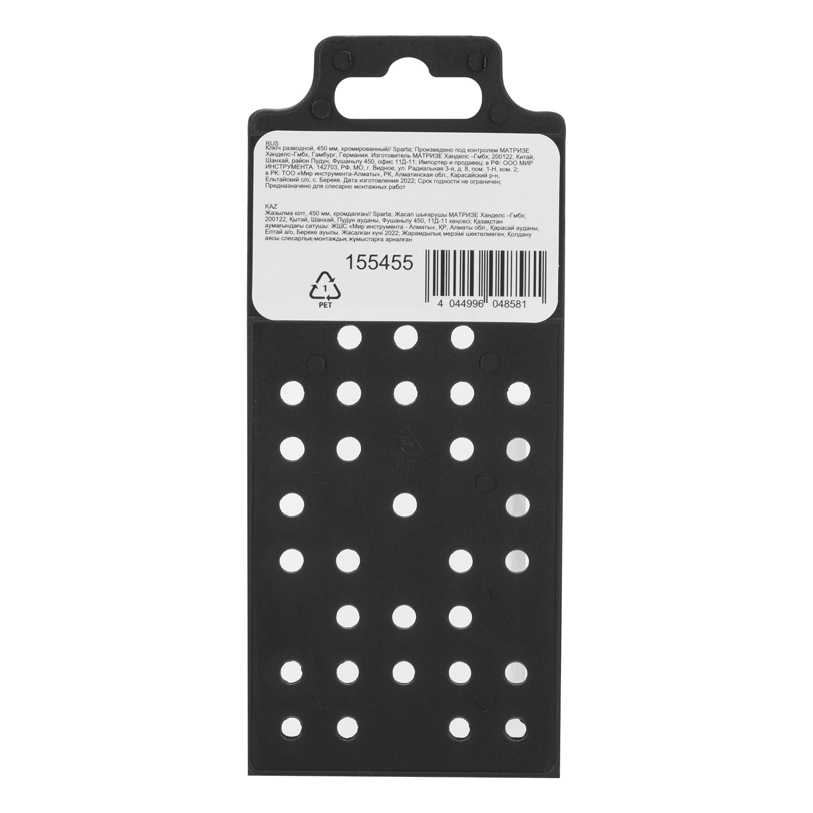 <p>Хромированный разводной ключ Sparta 155455 длиной 450 мм — инструмент для выполнения мелких ремонтных работ. Регулировка размера зева позволяет работать с различными крепежами, в том числе нестандартных размеров. Ключ пригодится слесарям, сантехникам, автомеханикам и начинающим мастерам.</p><h2>Преимущества</h2><ul><li>Долгий срок службы — ключ выполнен из инструментальной углеродистой стали 45 и прошел селективную закалку.</li><li>Антикоррозийная защита — хромовое покрытие предохраняет червячный винтовой механизм от воздействия влаги.</li><li>Точный захват деталей — на ключ нанесена градуировка, а на подвижную губку — точечная риска.</li></ul>