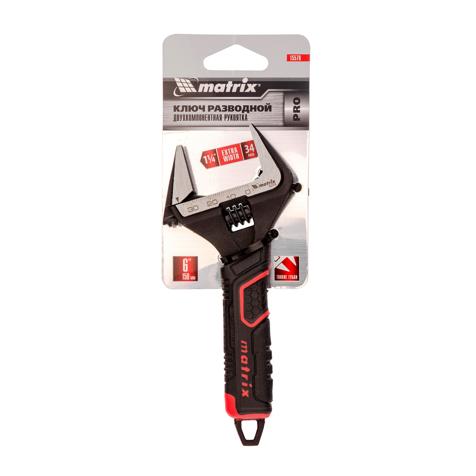 <p>Фосфатированный разводной ключ Matrix PRO 15576 длиной 150 мм, с тонкими губками и двухкомпонентной рукояткой, — профессиональный инструмент, применяется для монтажа и демонтажа крепежных элементов и работы с узкими фитингами. Максимальная ширина раскрытия губок составляет 34 мм, что позволяет работать с деталями разного размера. Благодаря удлиненным тонким губкам инструмент удобен для работы в труднодоступных местах.</p><h2>Преимущества</h2><ul><li>Надежность и долговечность — ключ изготовлен из прочной стали 40 CrV, губки закалены до твердости 50 HRC и выдерживают высокие нагрузки.</li><li>Защита от коррозии — фосфатированная поверхность устойчива к воздействию влаги.</li><li>Комфортное использование — двухкомпонентная рукоятка не выскальзывает из ладони, даже если работать без перчаток.</li></ul>
