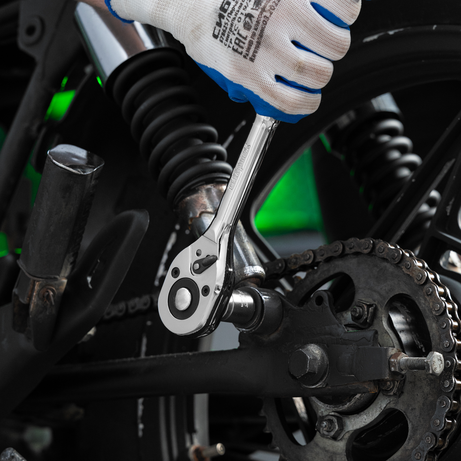 Цельнометаллический хромированный ключ-трещотка Сибртех 14019 из стали CrV, с посадочным размером 1/2″ и 45-зубым храповым механизмом, с функцией быстрого сброса, используется для монтажа и демонтажа резьбовых соединений. Предназначен для установки торцевых головок, адаптеров и удлинителей. Цельнометаллическая конструкция отличается повышенной прочностью, что позволяет работать со значительным усилием. Инструмент пригодится дома, в гараже и в поездке.