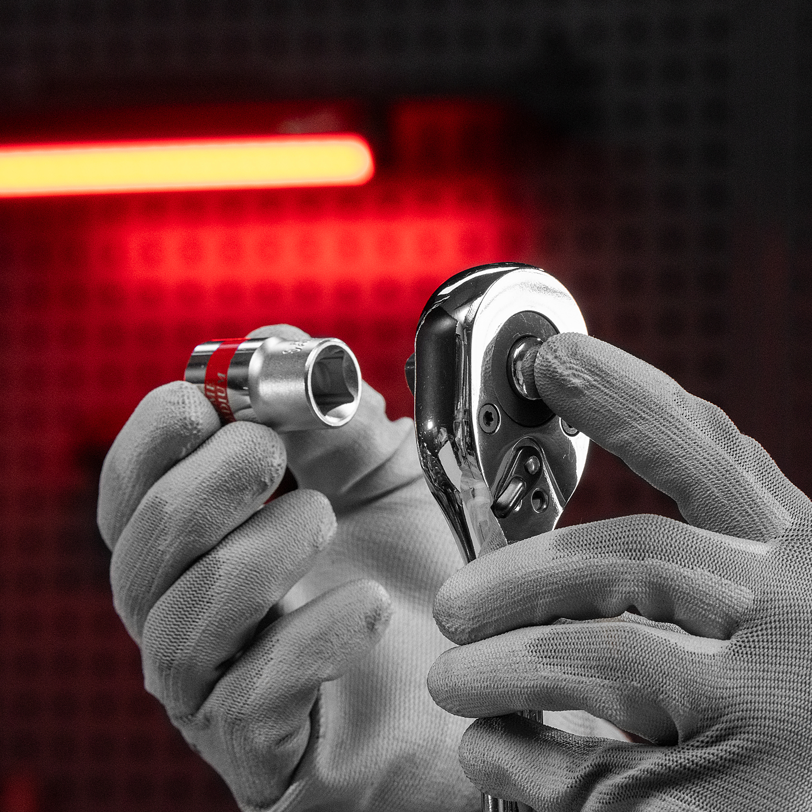 - Надежная фиксация торцевой головки — инструмент оснащен металлическим шариковым фиксатором.