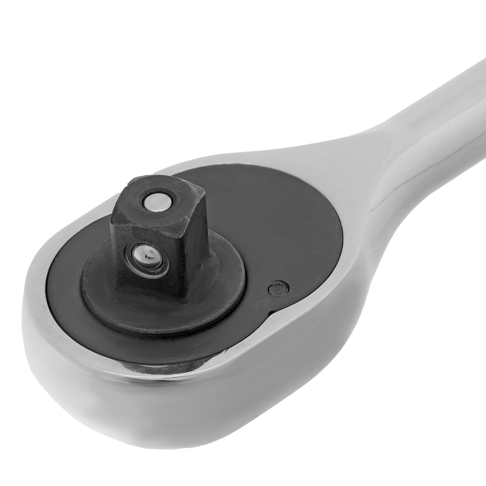 Хромированный ключ-трещотка Matrix 14015 с переключателем, из стали CrV, с присоединительным размером 1/2", — ручной инструмент для монтажа и демонтажа резьбовых соединений. Совместим с торцевыми головками, имеющими посадочное гнездо соответствующего размера. Храповой механизм облегчает работу в труднодоступных местах. Инструмент применяется для ремонта техники, автомобилей, также используется в быту.