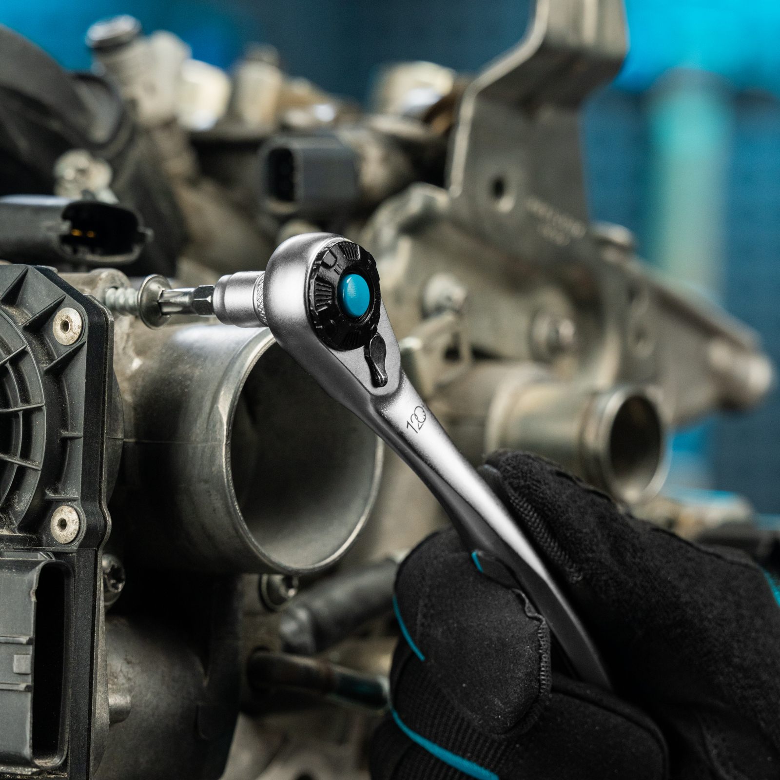 Трещоточный ключ Gross 14135 с присоединительным квадратом 1/4 дюйма предназначен для работ с резьбовыми соединениями. Храповый механизм со 120 зубцами обеспечивает исключительно плавный ход. Инструмент оптимален для работы с труднодоступными крепежами — шаг трещотки составляет всего 3 градуса. Ключ подойдет для ремонта компактной техники, велосипедов, монтажа оборудования, пригодится также дома, в гараже или на даче.