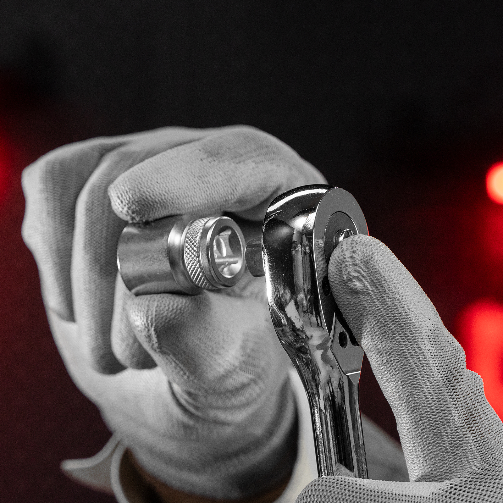 - Надежная фиксация торцевой головки — инструмент оснащен металлическим шариковым фиксатором.