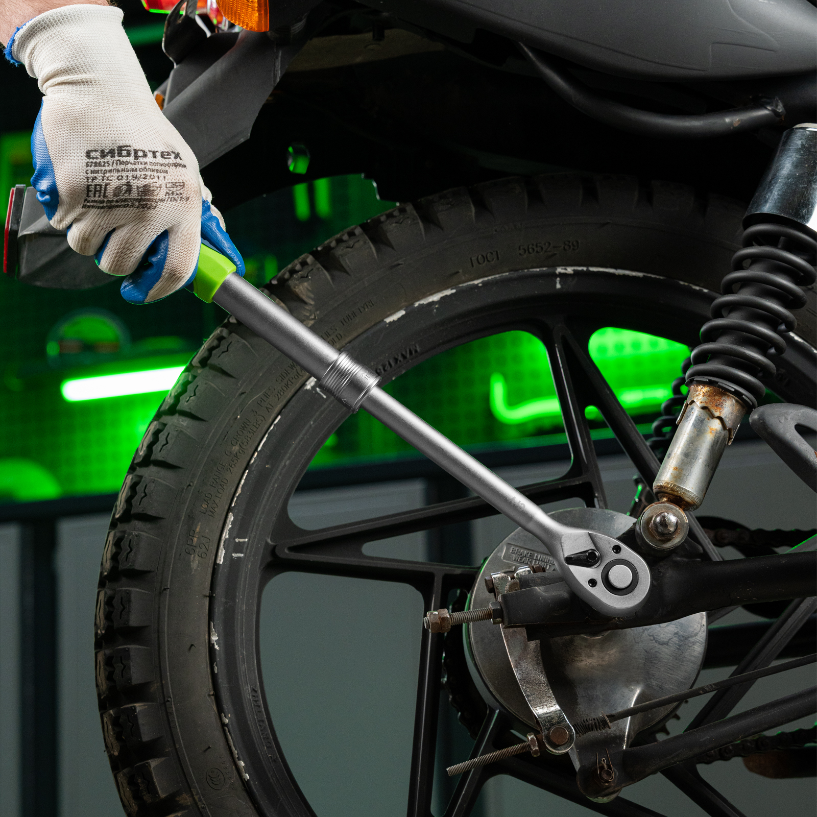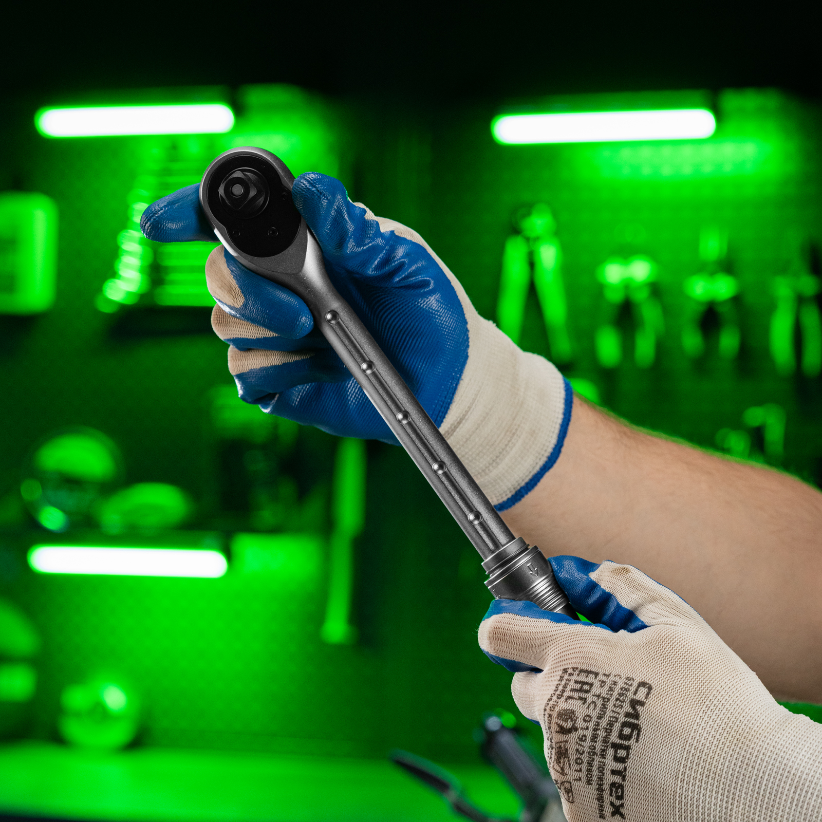 Ключ-трещотка 1/2″ Сибртех 14077 с телескопической рукояткой длиной 300-430 мм, храповым механизмом с 72 зубьями и функцией быстрого сброса, — инструмент для работы с резьбовым крепежом. Используется совместно с торцевыми головками, удлинителями, адаптерами. Телескопическая рукоятка упрощает работу с труднодоступным крепежом, а также позволяет увеличить прикладываемое усилие. Трещоточный механизм с 72 зубьями облегчает работу, угол поворота составляет 5°, что удобно в условиях ограниченного пространства. Инструмент пригодится в мастерской и гараже.