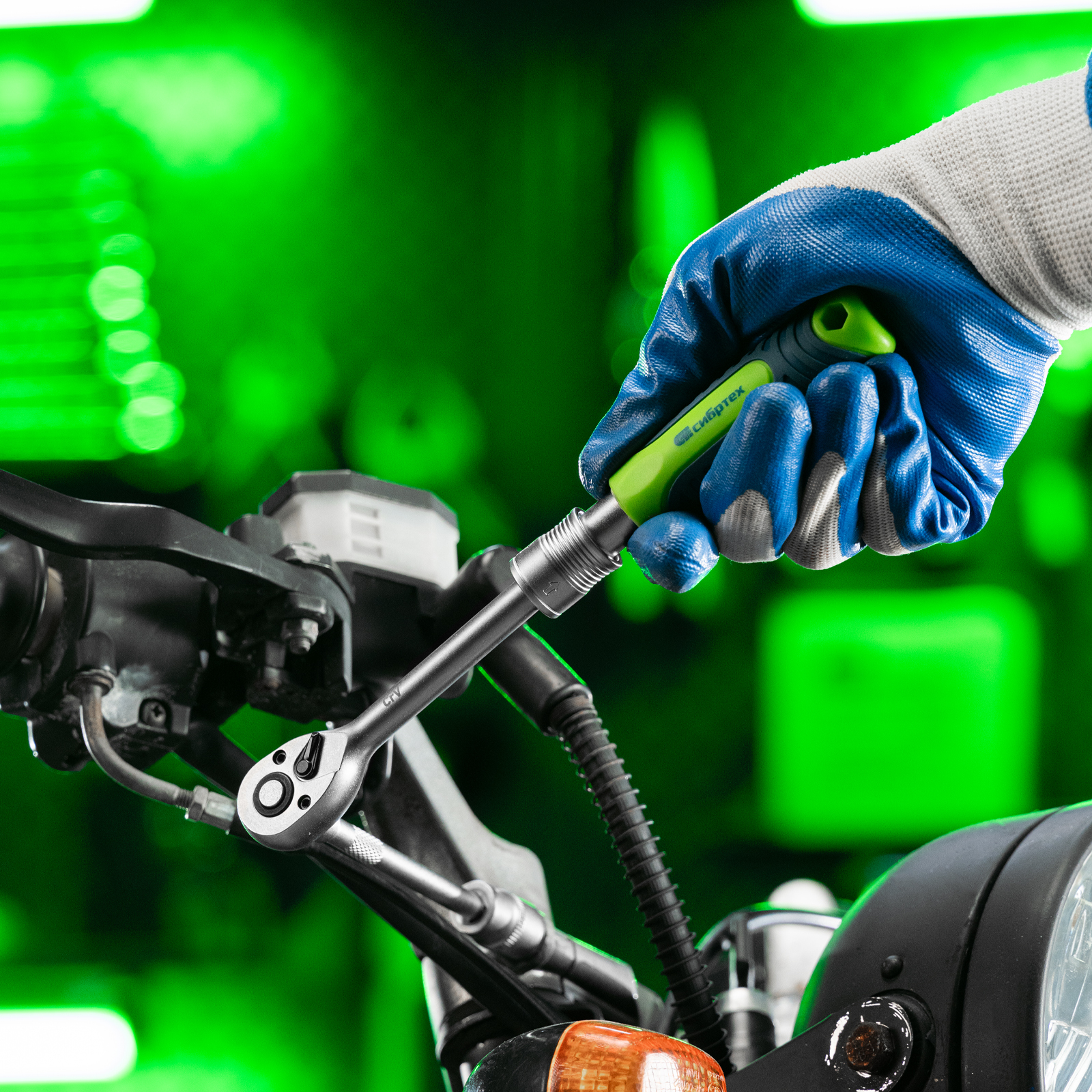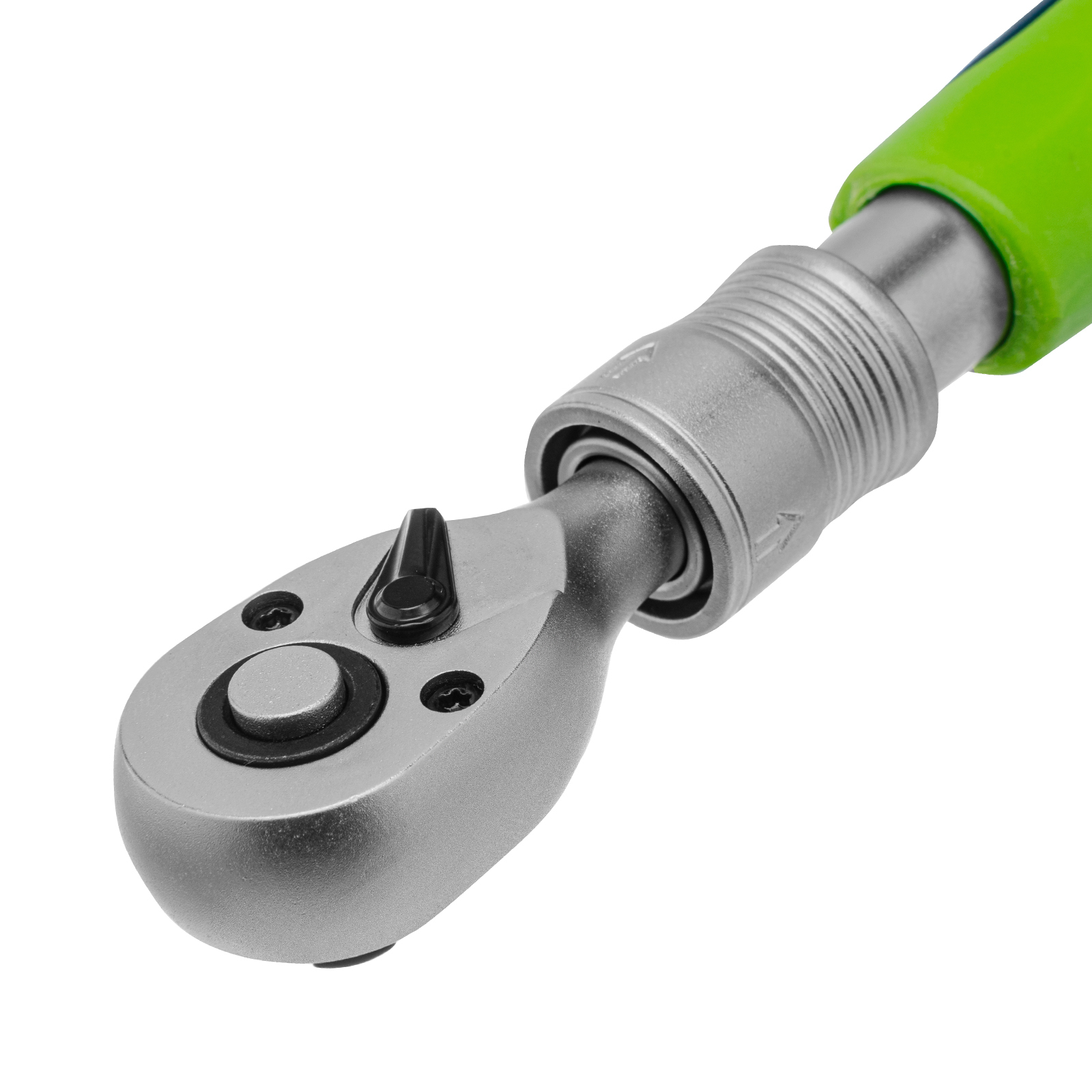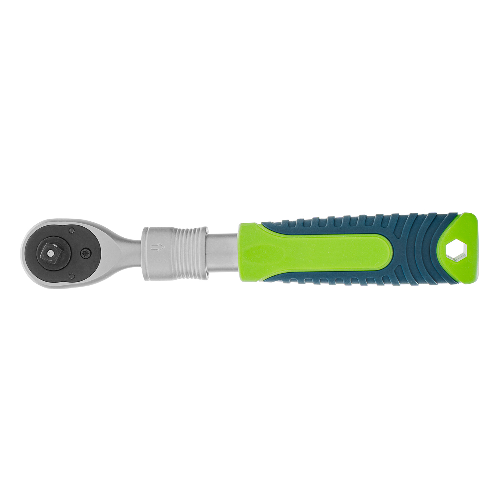 Ключ-трещотка 1/4″ Сибртех 14075 с телескопической рукояткой длиной 170-230 мм, храповым механизмом с 72 зубьями и функцией быстрого сброса, — инструмент для работы с резьбовым крепежом. Используется совместно с торцевыми головками, удлинителями, адаптерами. Телескопическая рукоятка упрощает работу с труднодоступным крепежом, а также позволяет увеличить прикладываемое усилие. Трещоточный механизм с 72 зубьями облегчает работу, угол поворота составляет 5°, что удобно в условиях ограниченного пространства. Инструмент пригодится в мастерской и гараже.