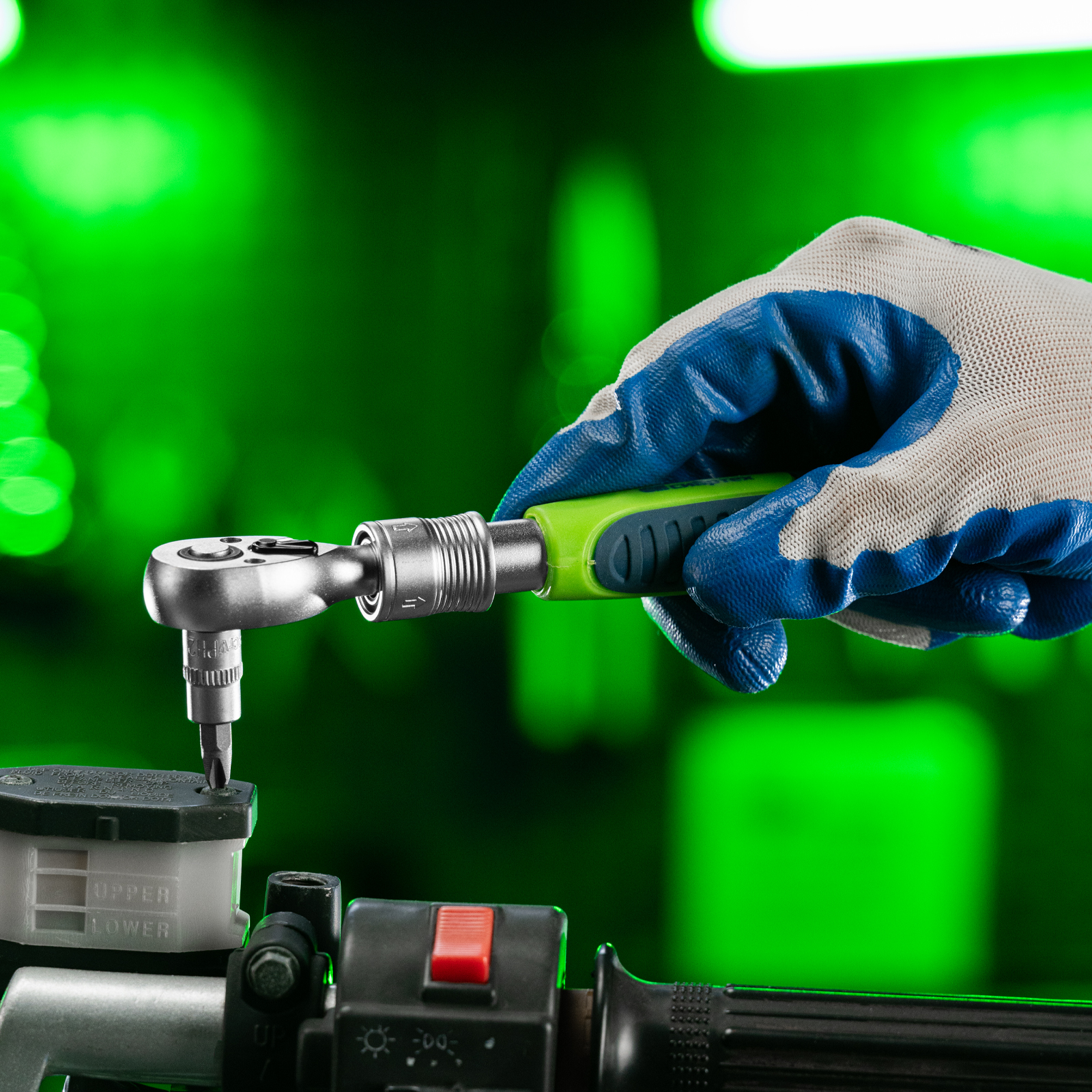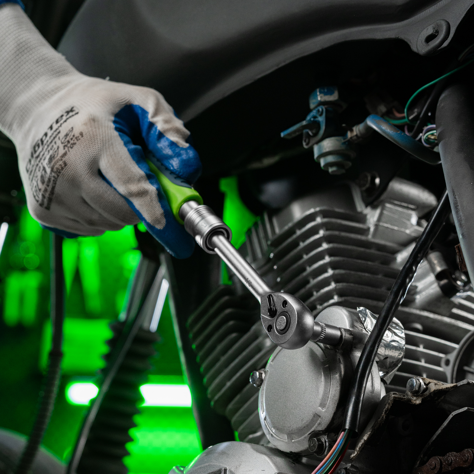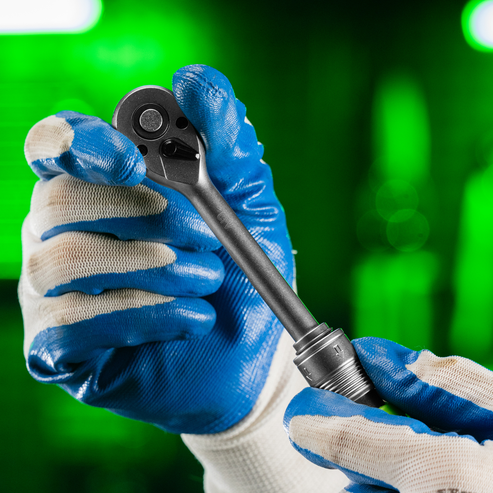 - Надежная фиксация насадок — шариковый замок крепко удерживает торцевую головку.