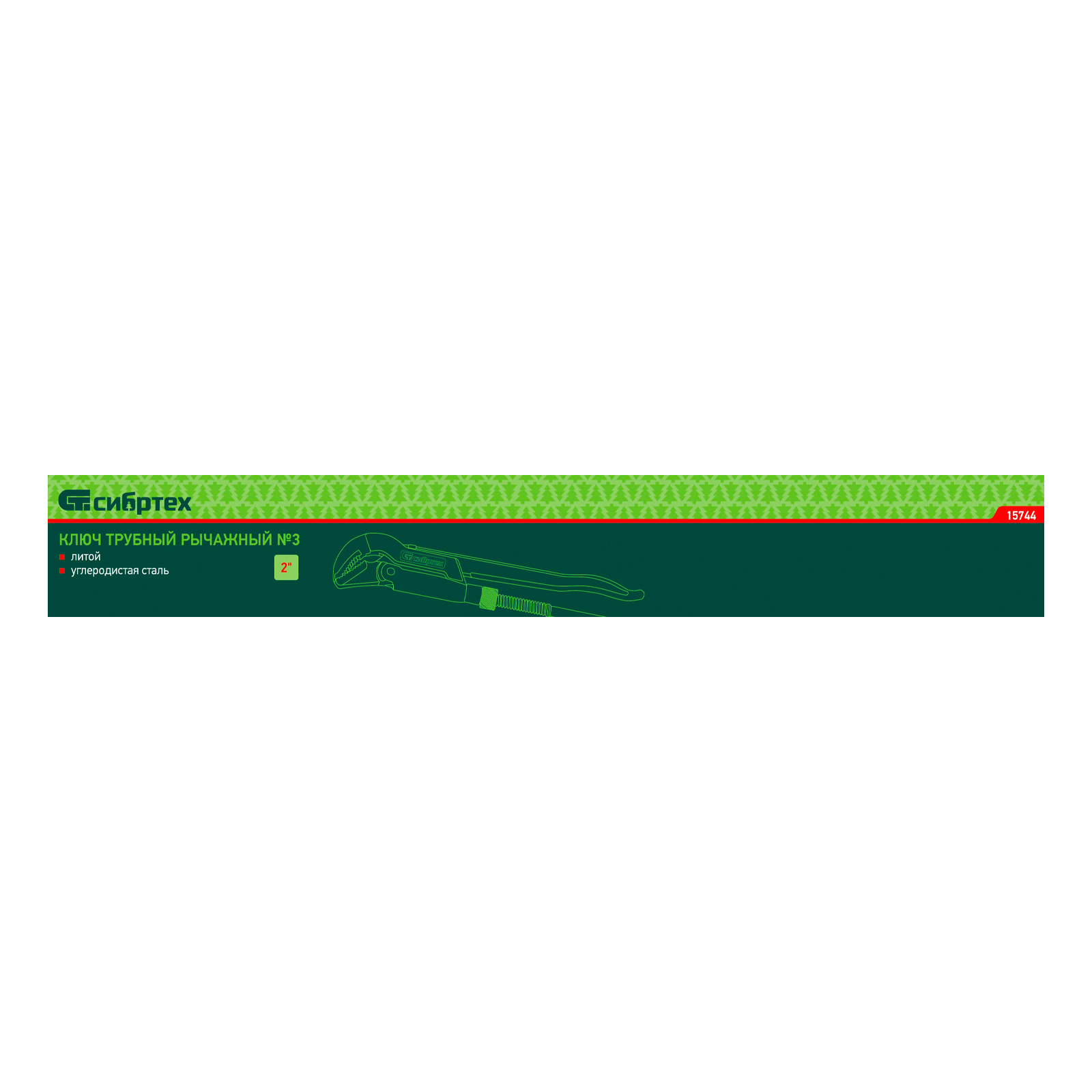 <p>Литой трубный рычажный ключ Сибртех №3 15744, тип «B», используется для захвата и вращения труб диаметром 2", а также других деталей со специальным профилем и без него. Рычажный механизм увеличивает рабочее усилие, снижая нагрузку на руки мастера. Инструмент рассчитан на бытовое и профессиональное применение.</p><h2>Преимущества</h2><ul><li>Прочность и долговечность — литая конструкция из закаленной легированной стали устойчива к нагрузке кручения, губки закалены до твердости 48-52 HRC.</li><li>Надежная фиксация — на регулировочном механизме с гайкой имеется стопорное кольцо.</li><li>Надежный захват — зубья прогрессивной формы наклонены против направления вращения.</li><li>Защита от коррозии — на инструмент нанесено порошковое покрытие.</li></ul>