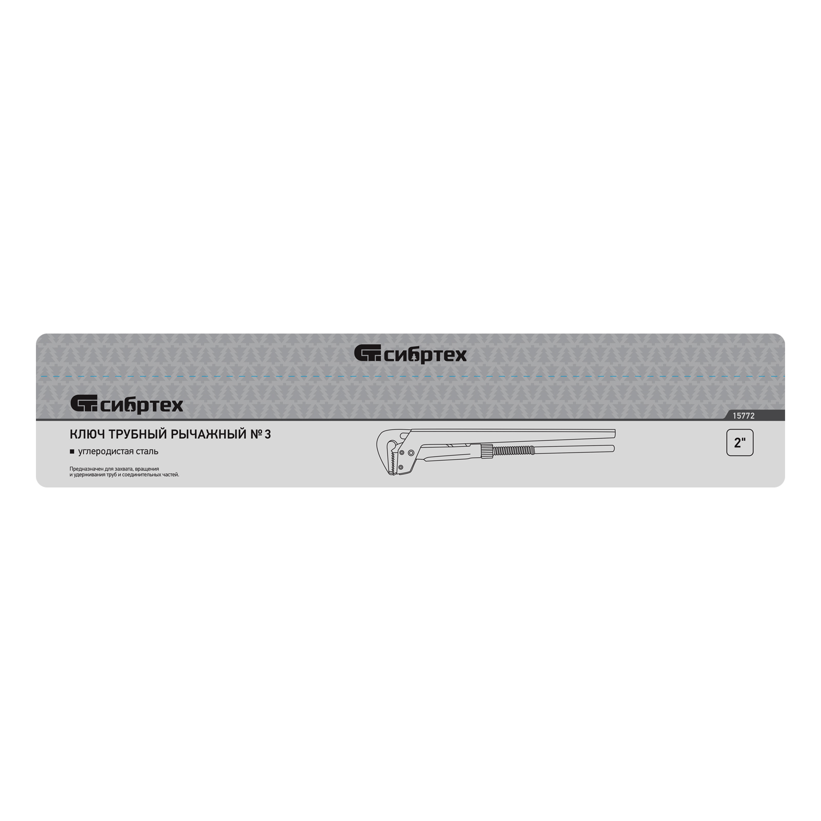 <p>Кованый трубный рычажный ключ Сибртех №3 15772, тип «L», используется для захвата и вращения труб диаметром 2", а также других деталей со специальным профилем и без него. Рычажный механизм увеличивает рабочее усилие, снижая нагрузку на руки мастера. Инструмент рассчитан на бытовое и профессиональное применение.</p><h2>Преимущества</h2><ul><li>Прочность и долговечность — кованая конструкция из закаленной легированной стали обеспечивает высокий рабочий ресурс, губки закалены до твердости 48-52 HRC.</li><li>Надежная фиксация — на регулировочном механизме с гайкой имеется стопорное кольцо.</li><li>Надежный захват — зубья прогрессивной формы наклонены против направления вращения.</li><li>Защита от коррозии — на инструмент нанесено эмалированное покрытие.</li></ul>