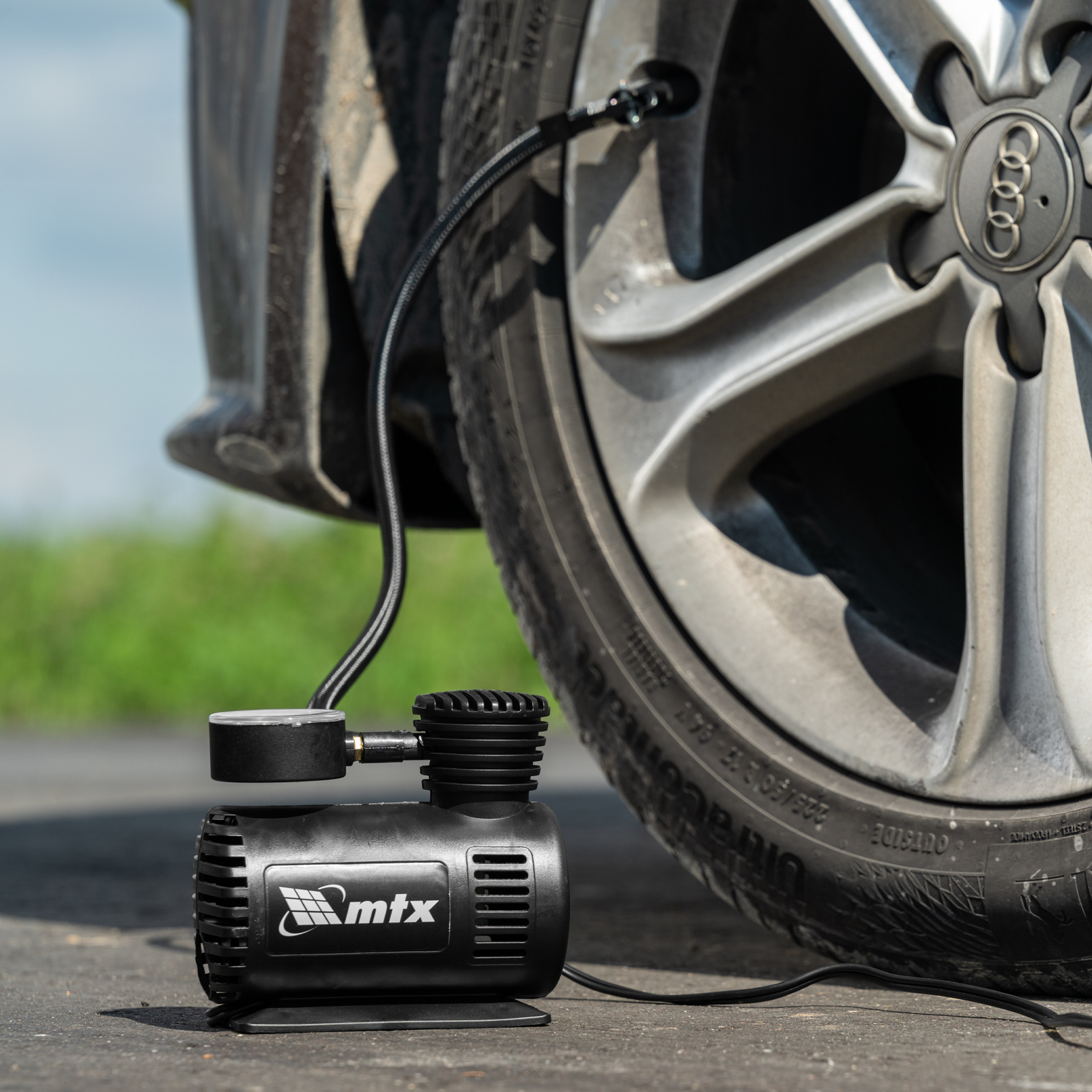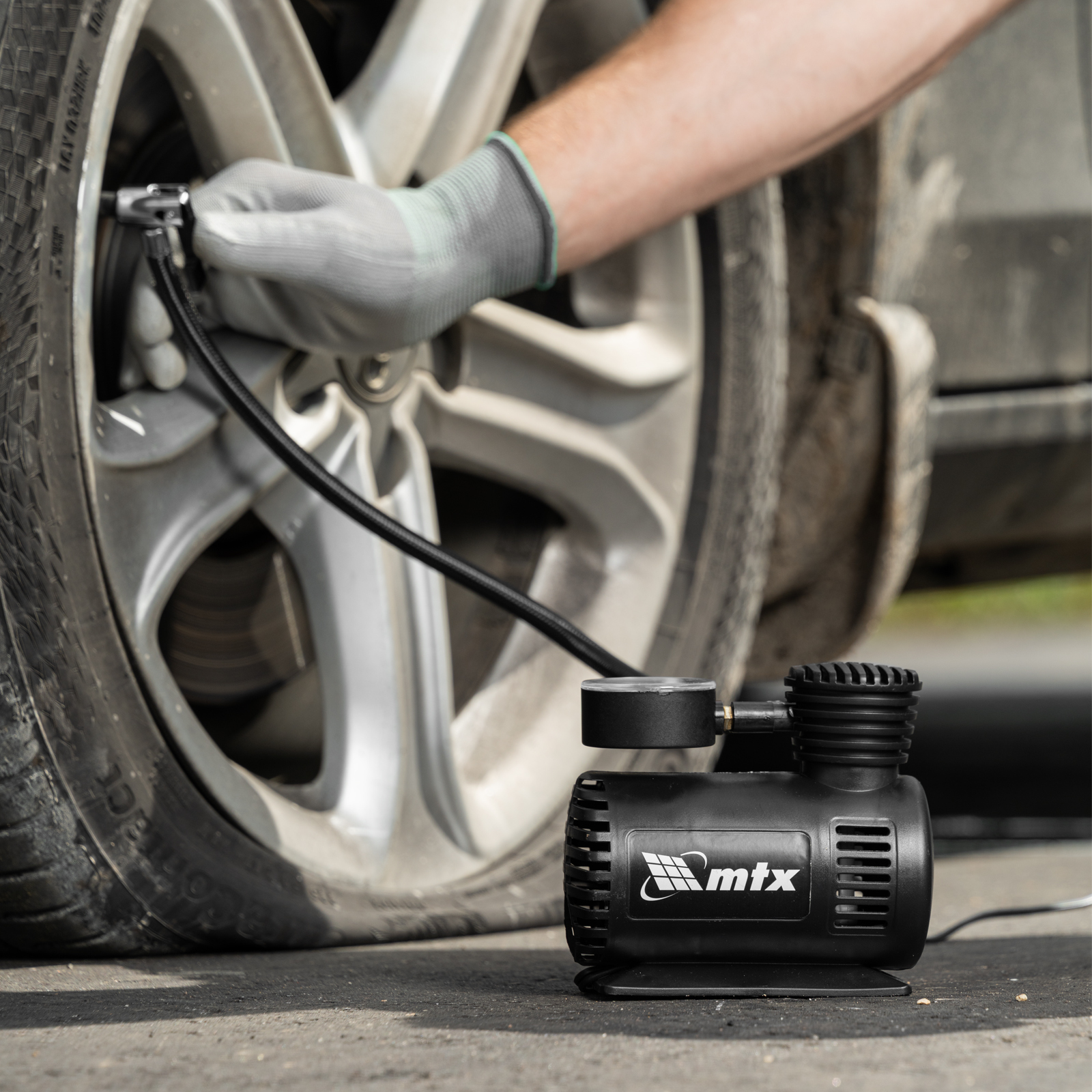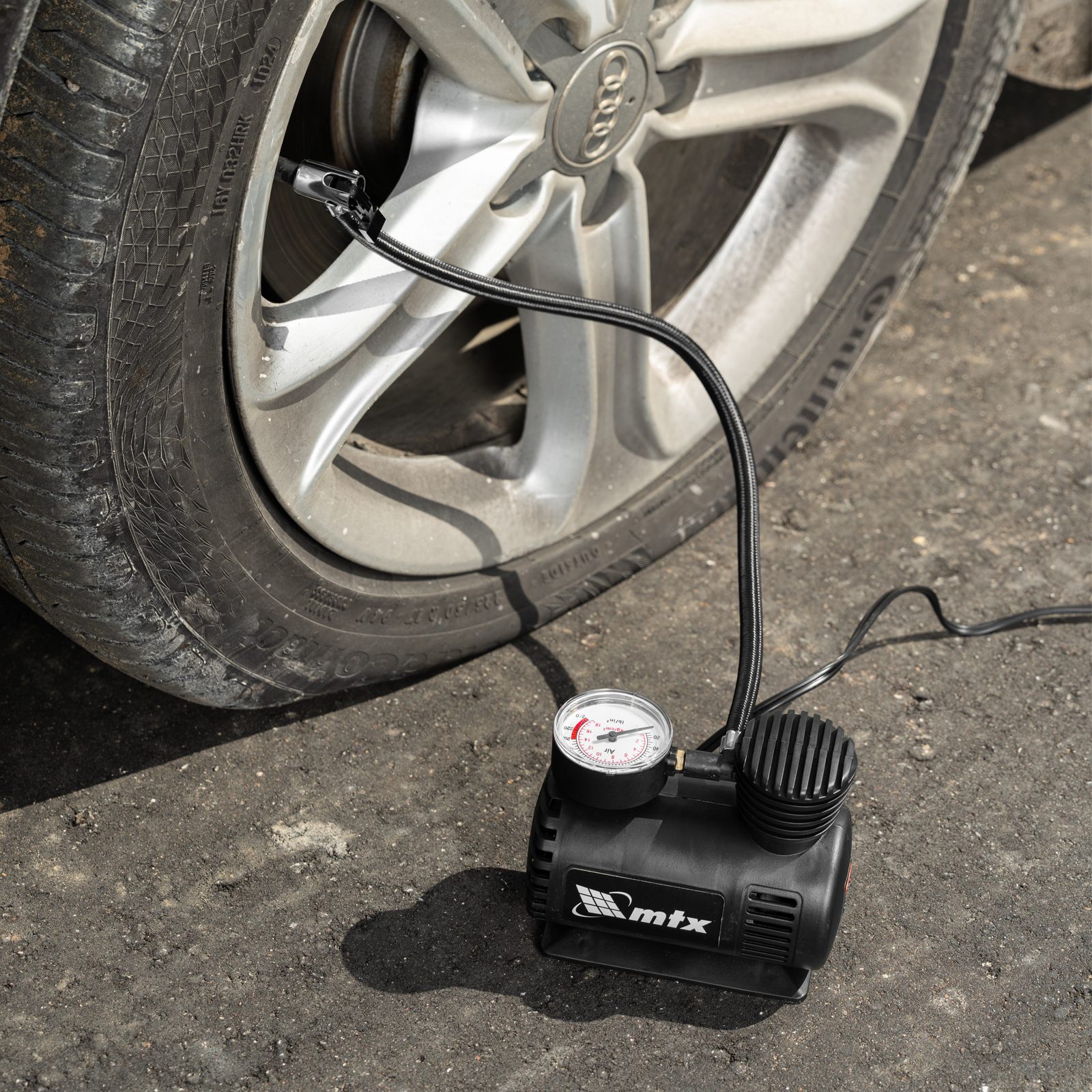 Автомобильный компрессор MTX C-12 58100 производительностью 12 л/мин обеспечивает давление до 17 атмосфер и питается от прикуривателя 12 В. Используется для накачки шин, а также мячей, матрасов, лодок и другого инвентаря. Компрессор поршневого типа способен накачать колесо R16 за 10 минут. Устройство пригодится в поездке, на даче, во время отдыха на природе.