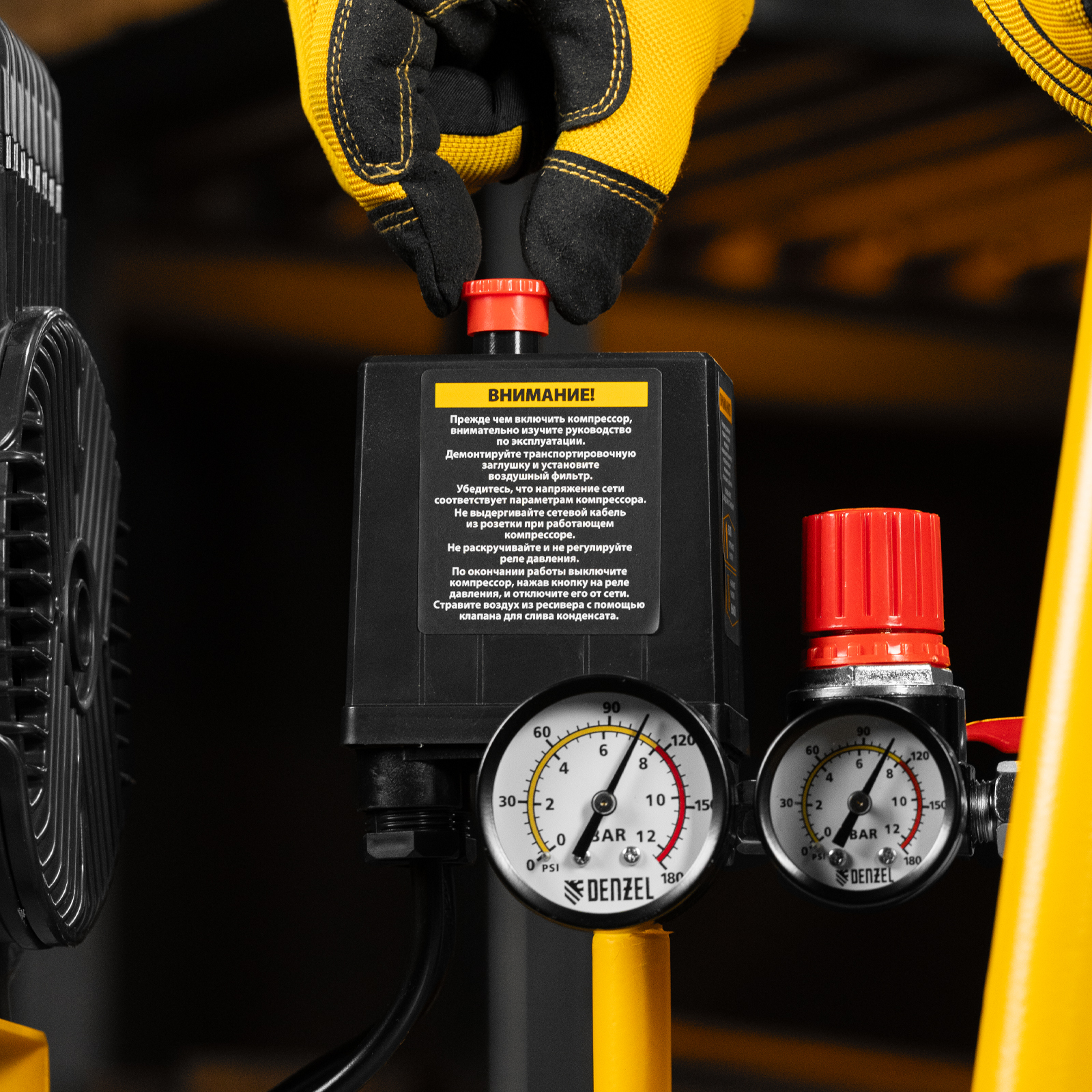 - Автономность — специальное реле останавливает компрессор по достижении максимального рабочего давления и запускает двигатель при падении давления до минимального уровня.