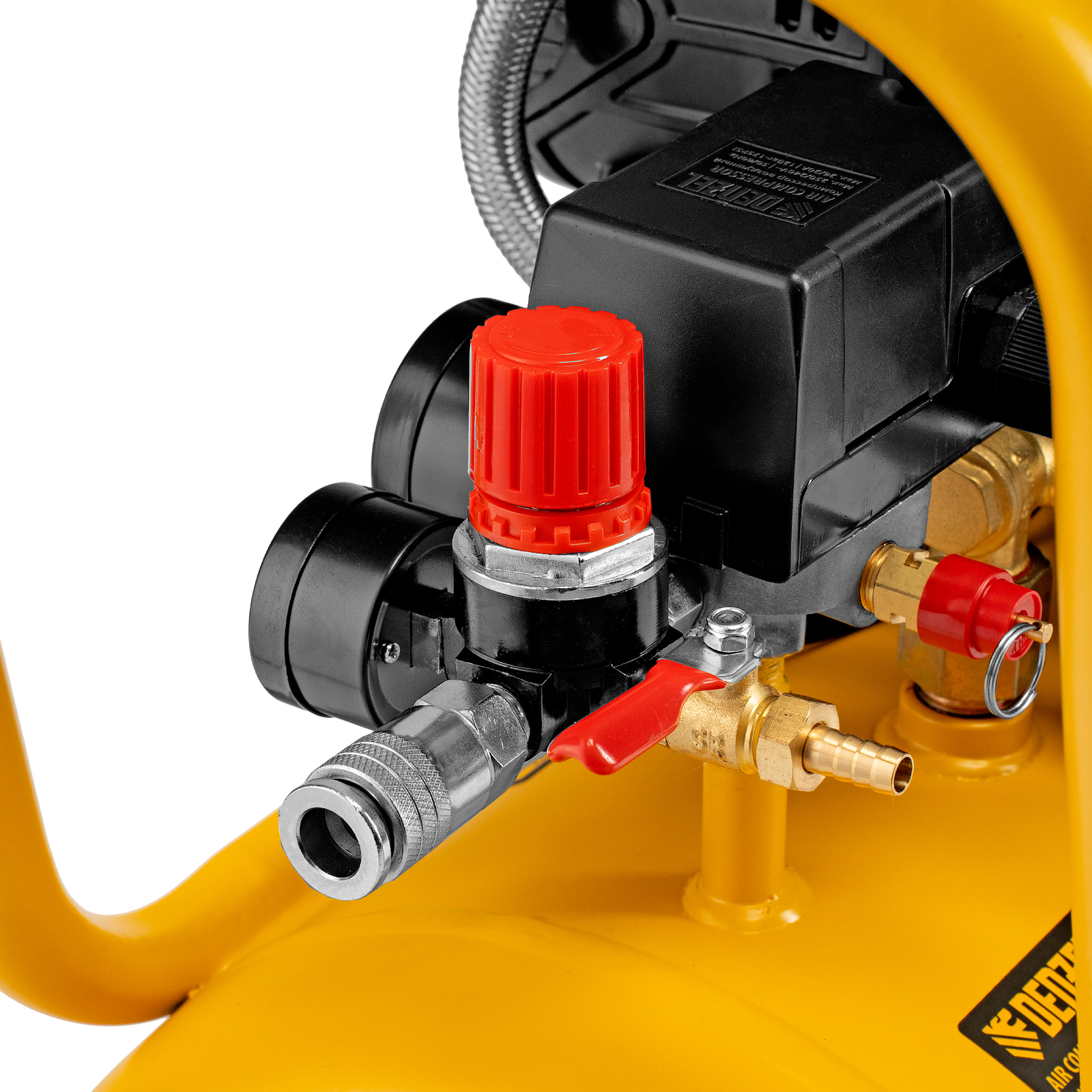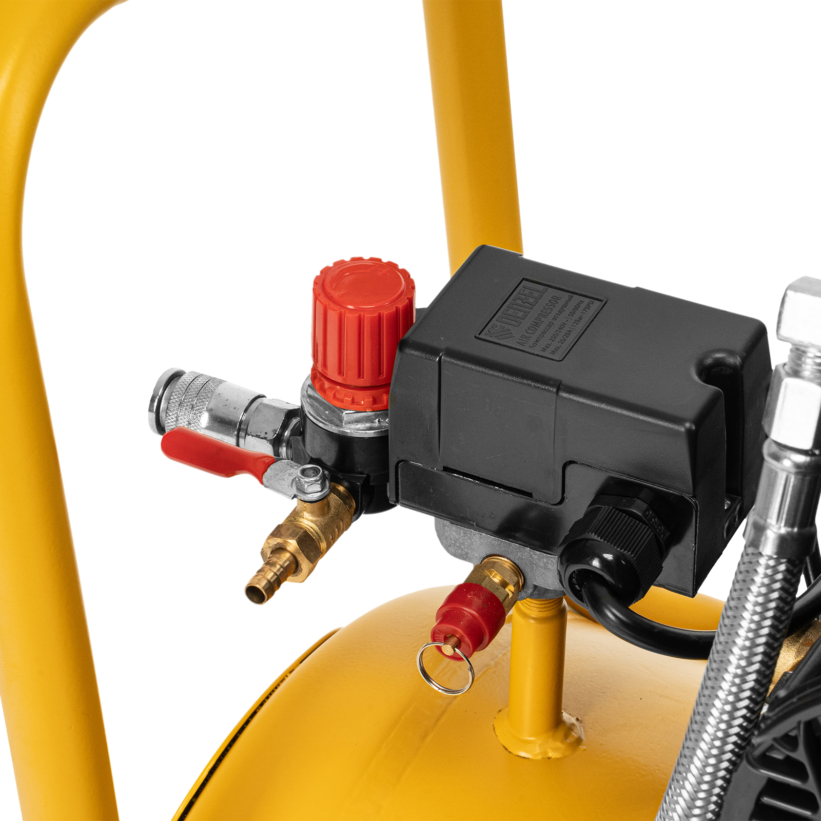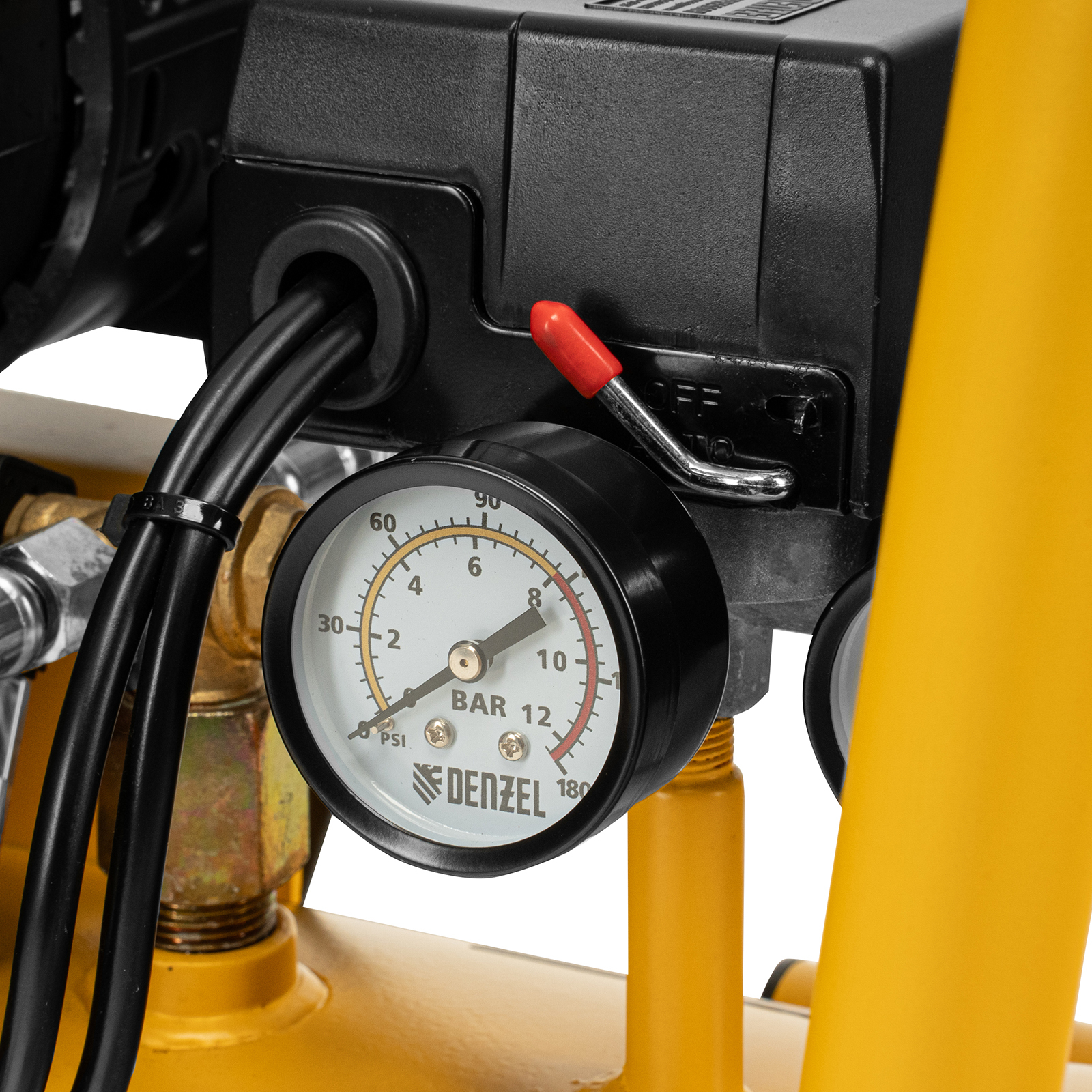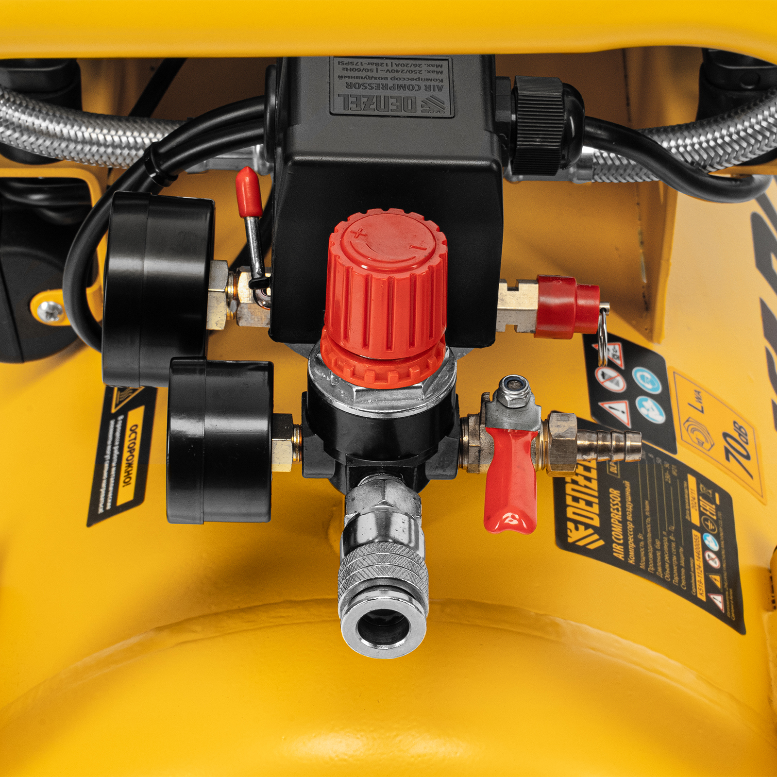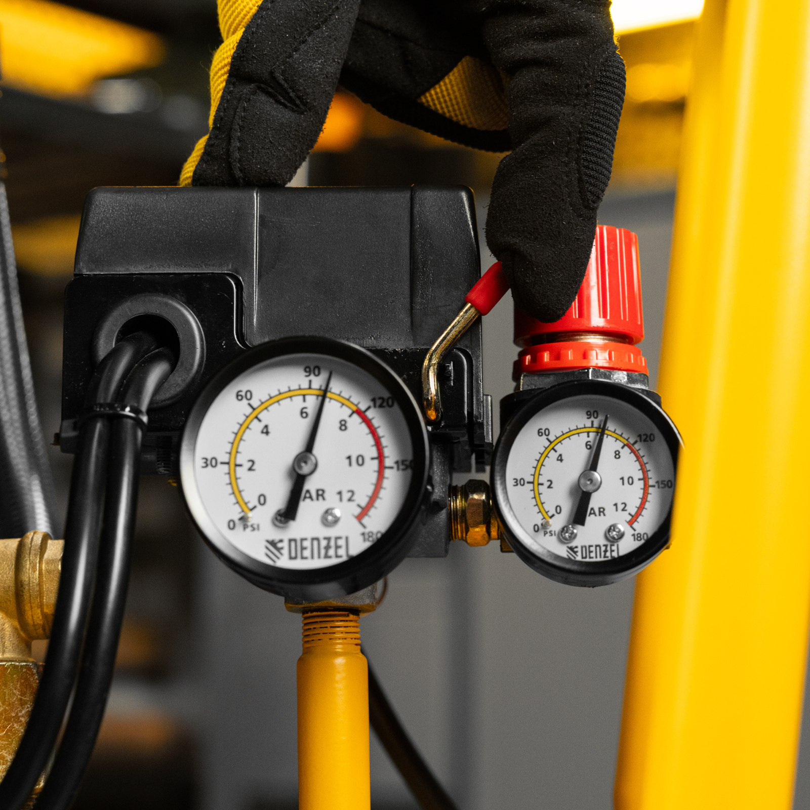 - Удобный контроль работы — компрессор оснащен 2 манометрами для отслеживания давления в ресивере и пневмолинии