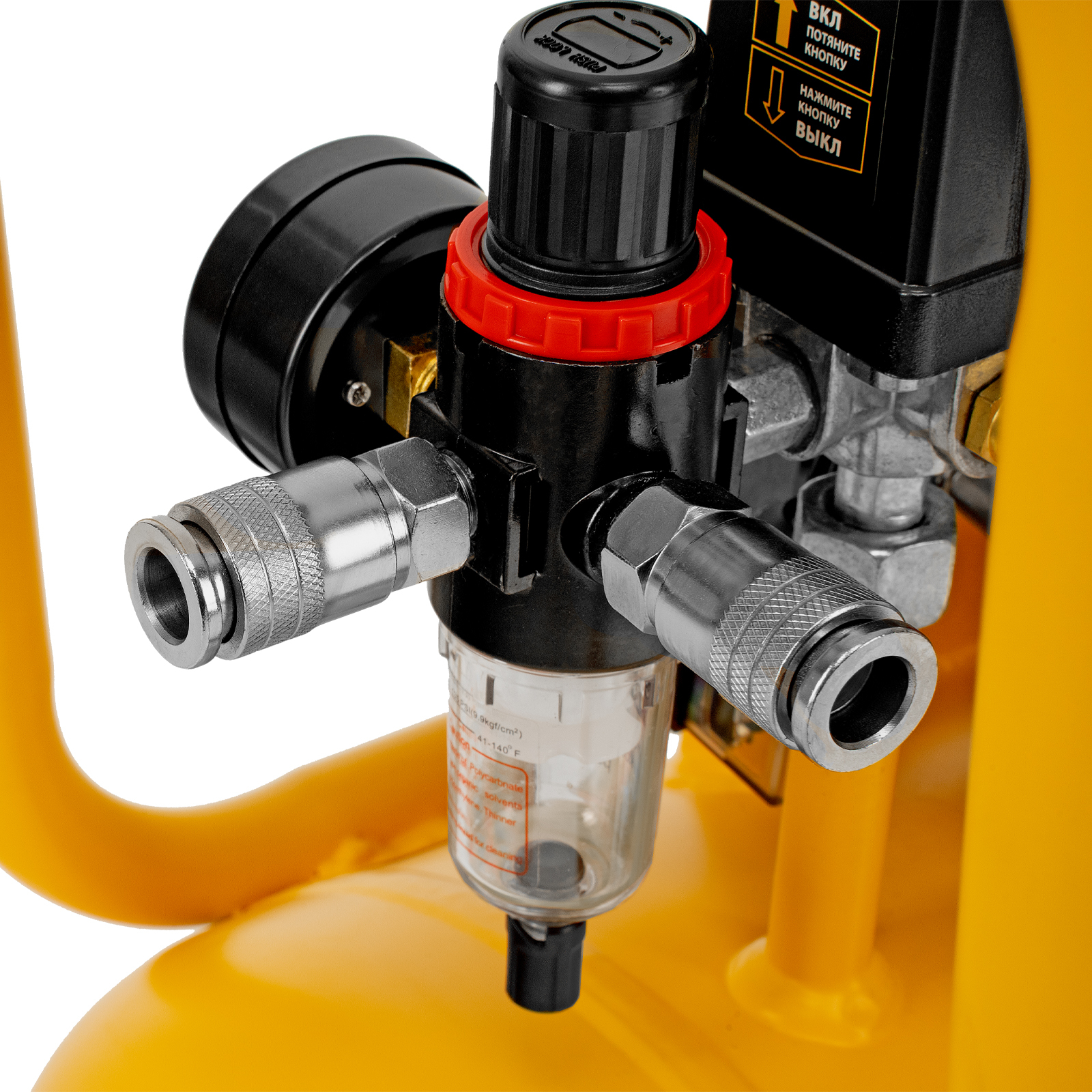 - Регулятор давления на выходе — можно выбрать оптимальный режим подачи воздуха в соответствии с характеристиками пневмоинструмента.