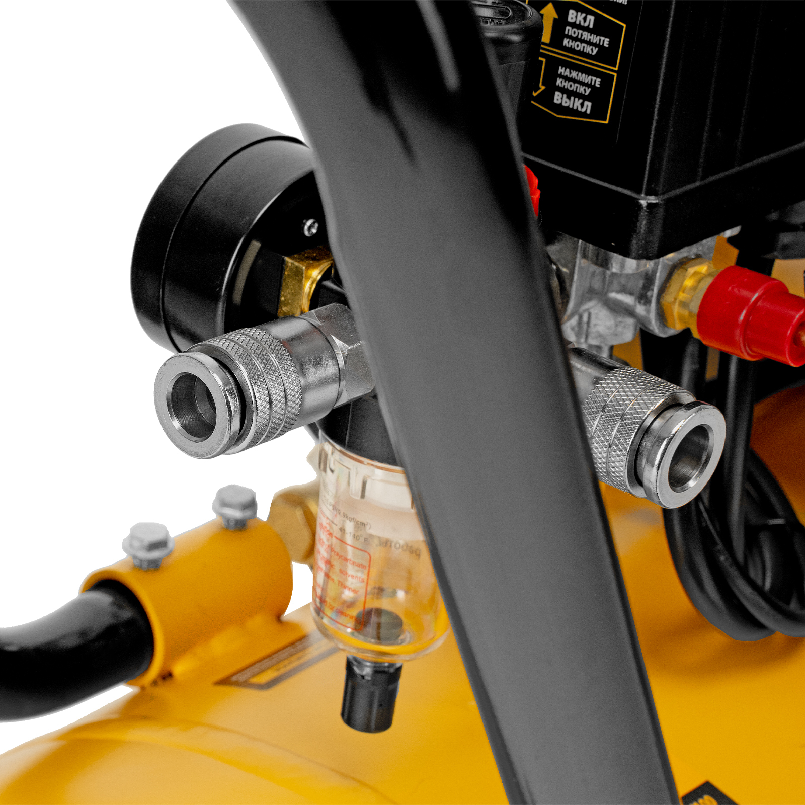 - Простая подготовка к работе — благодаря быстросъемному выходному коннектору подключение пневмоинструмента занимает несколько секунд.