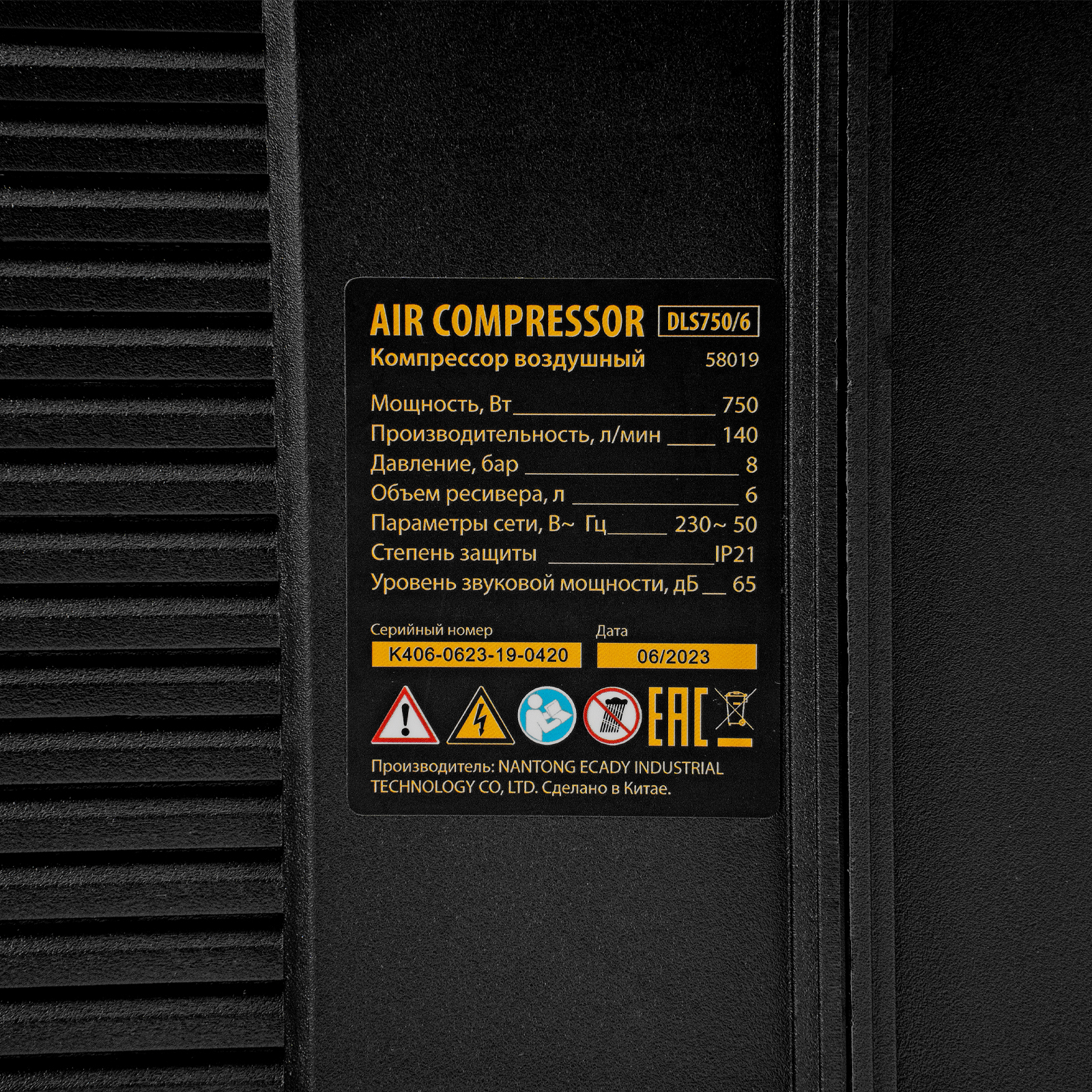 Компрессор DLS750/6 безмасляный малошумный 750 Вт, 140 л/мин,ресивер 6 л Denzel