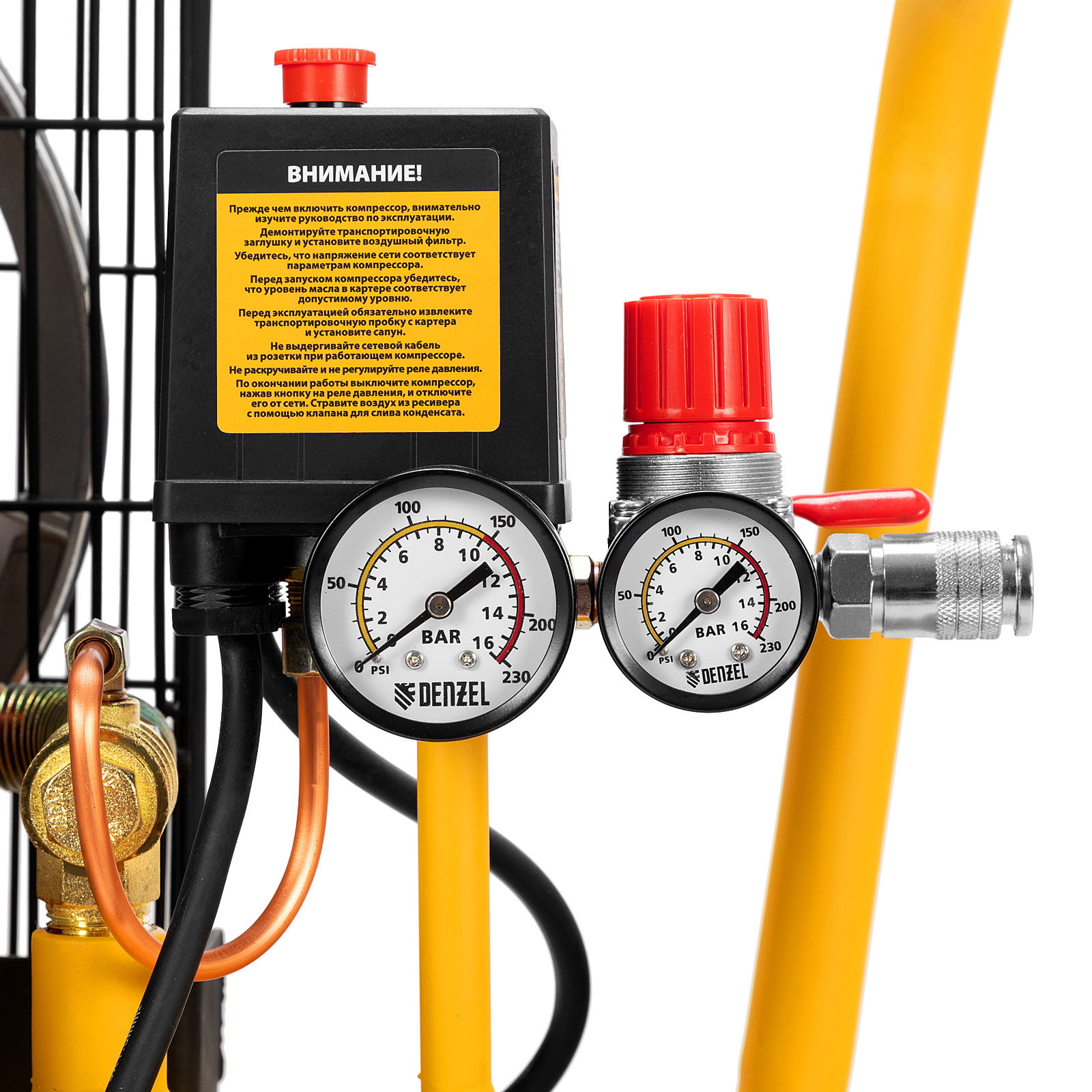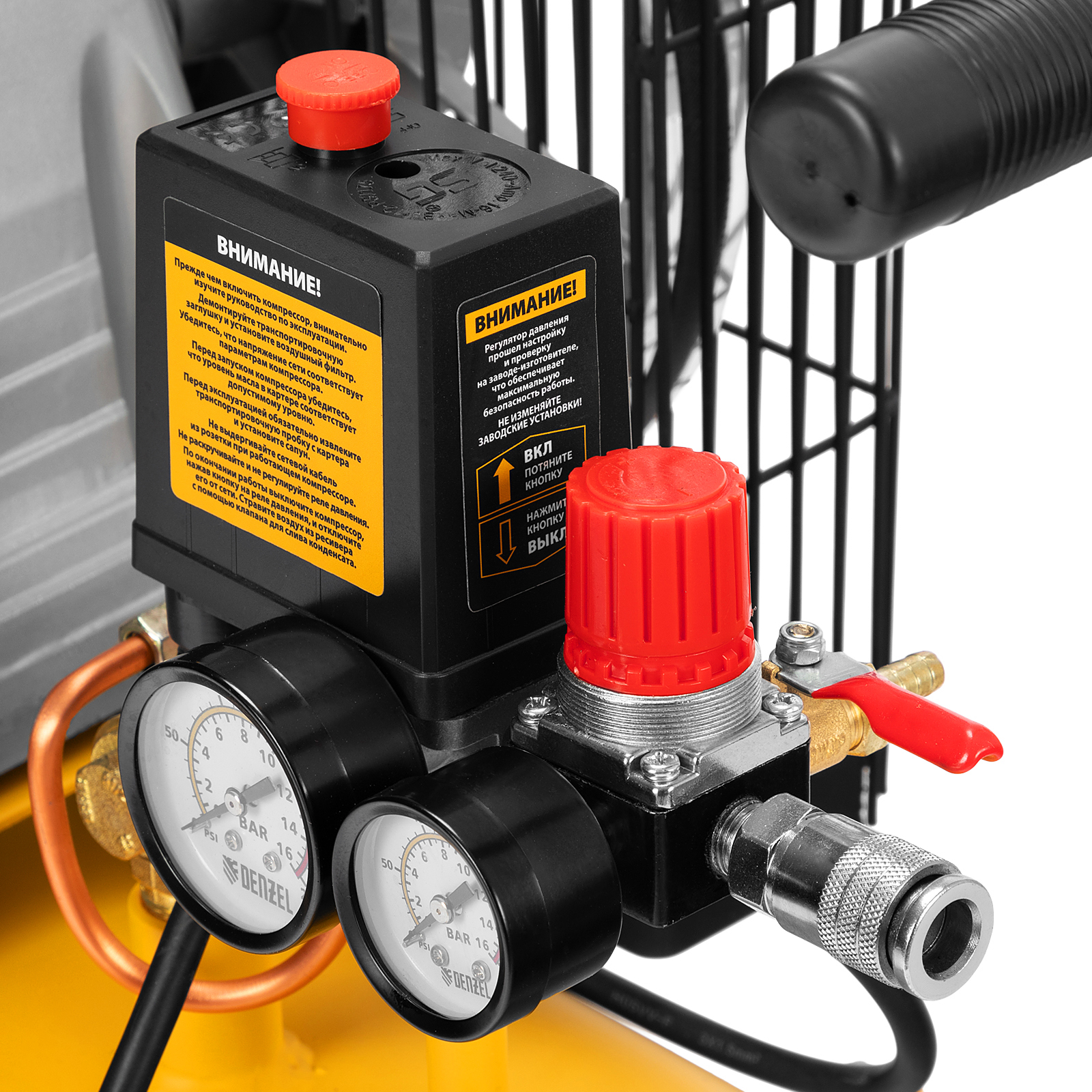 - Удобный контроль давления — компрессор оснащен 2-мя манометрами увеличенного диаметра.