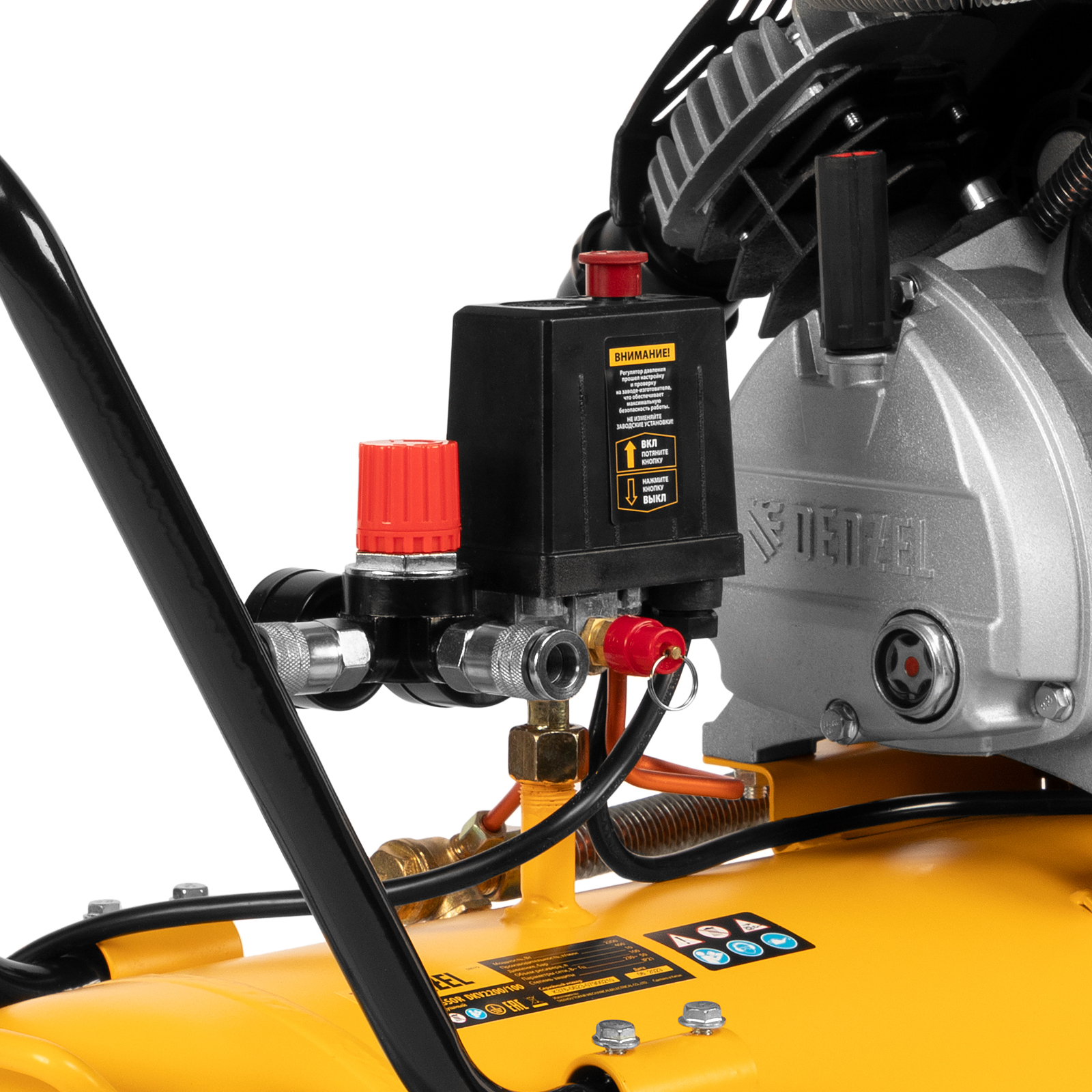 - Мобильность — большие колеса и П-образная ручка позволяют легко перемещать компрессор по рабочей площадке.