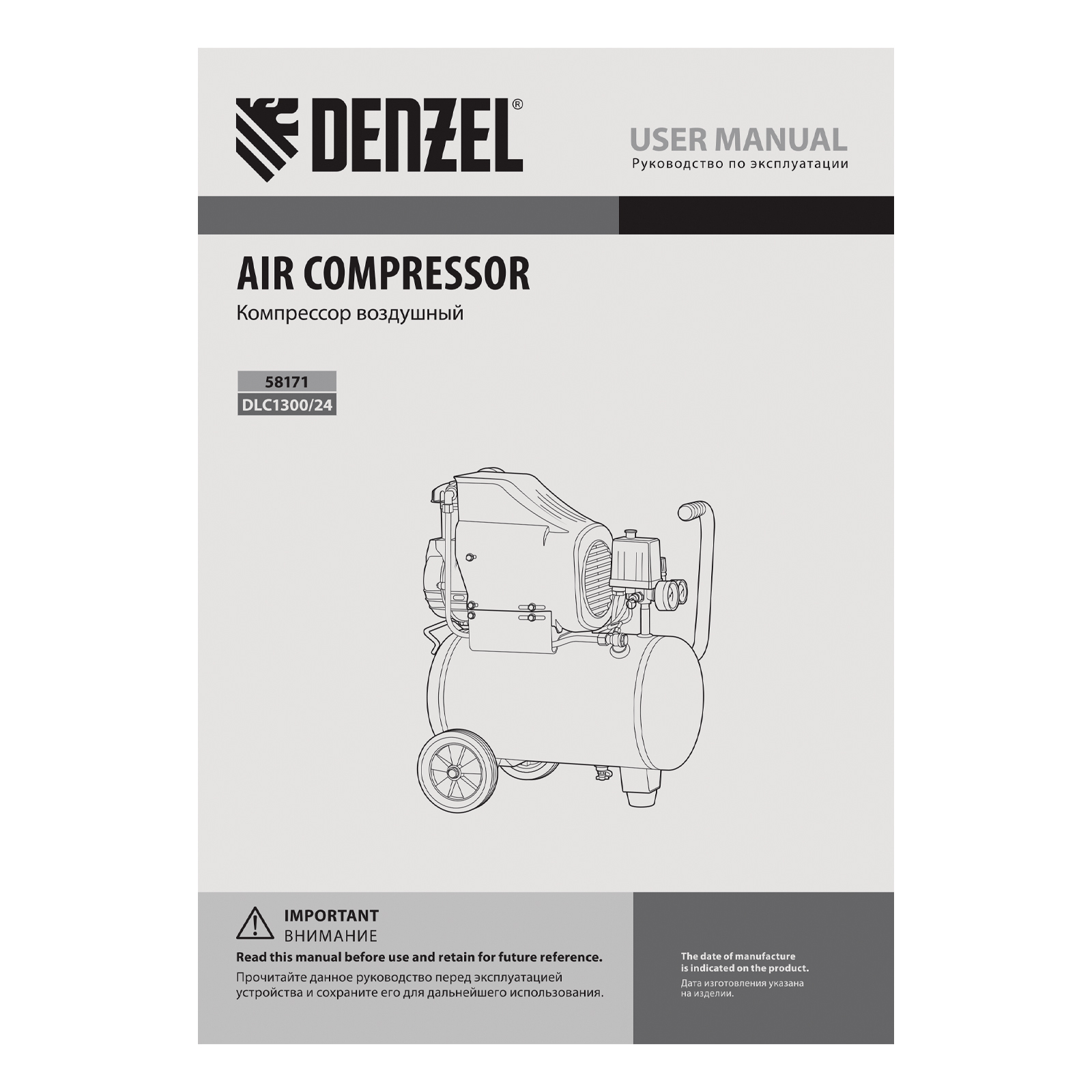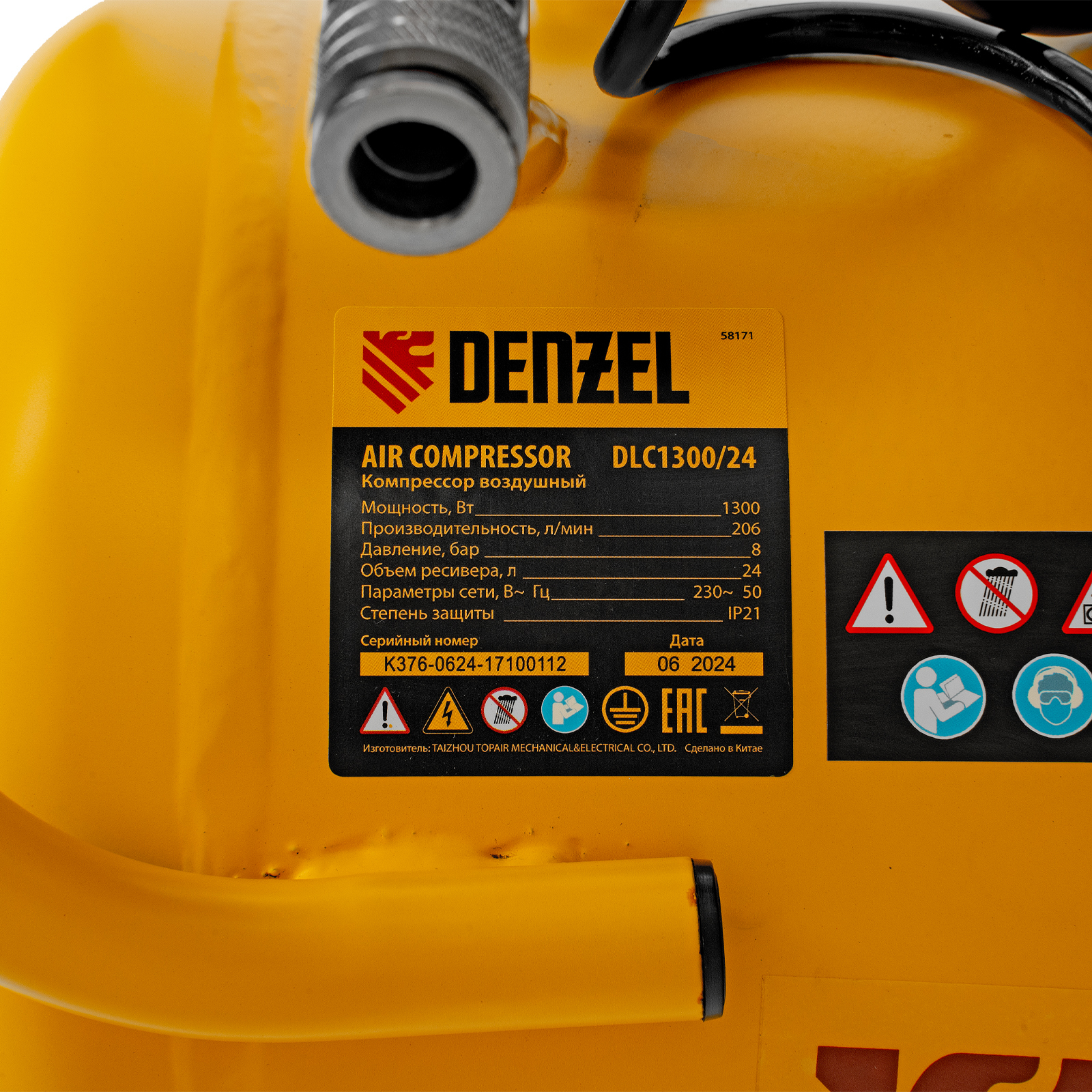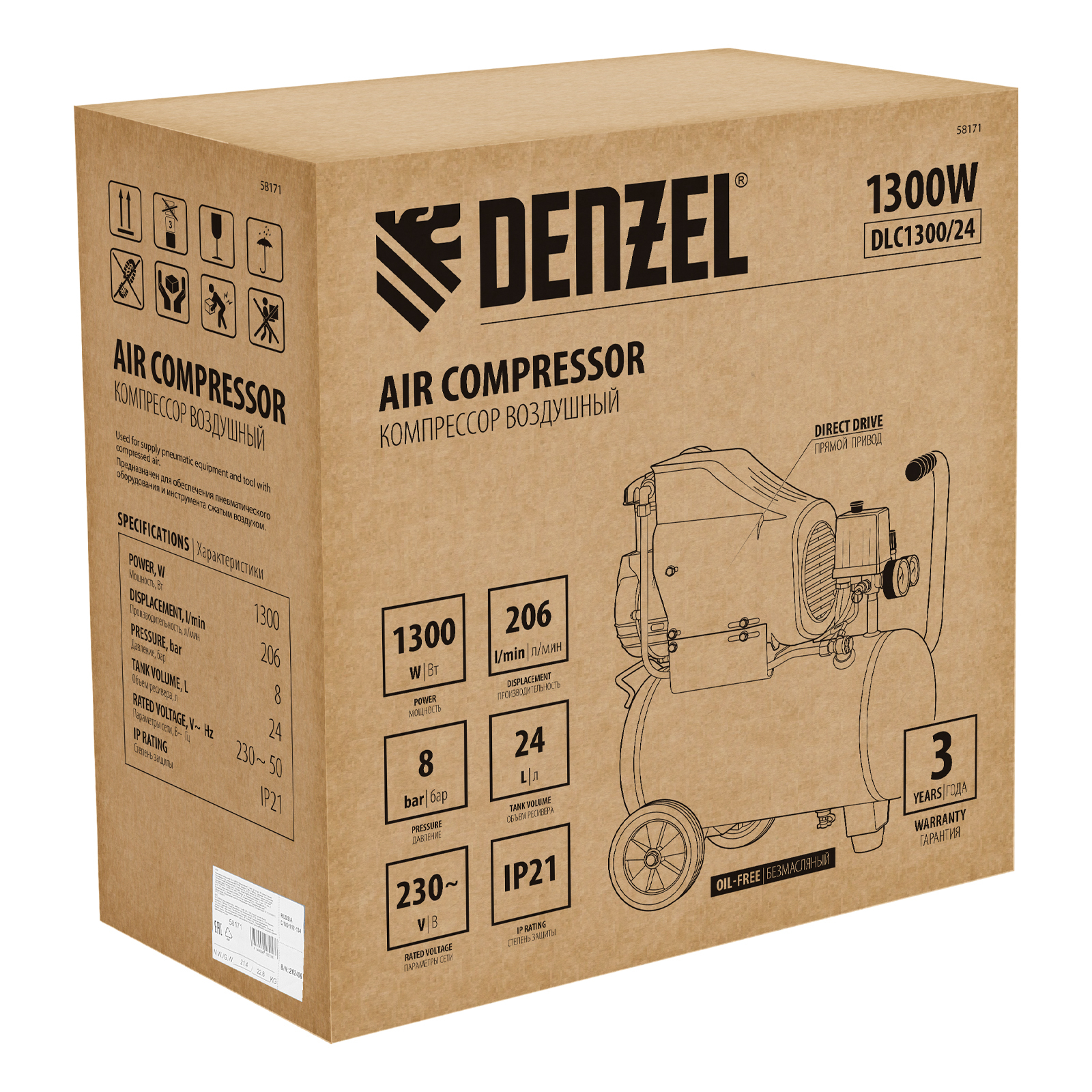 Компрессор воздушный DLC1300/24 безмасляный 1.3 кВт, 24 литра, 206 л/мин Denzel