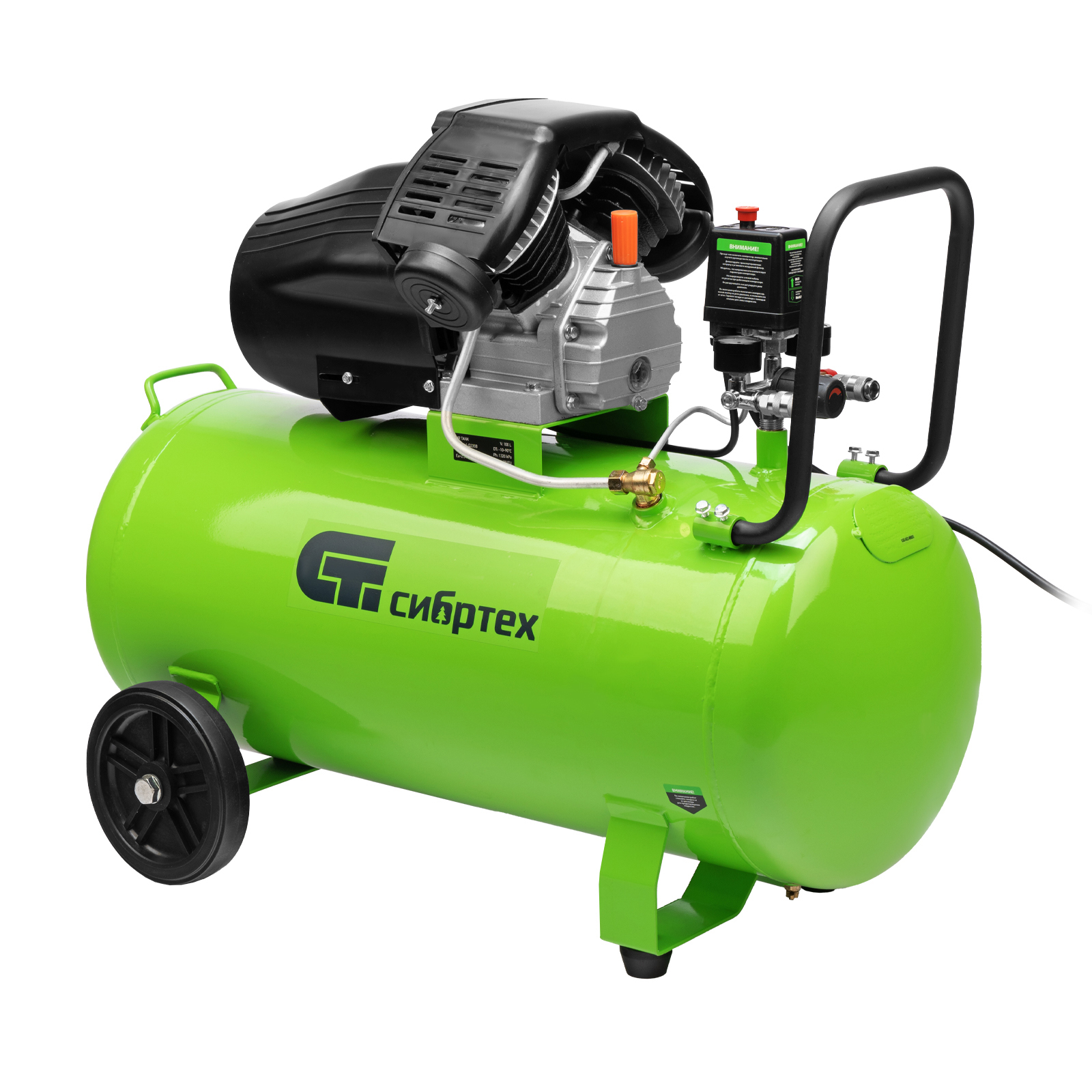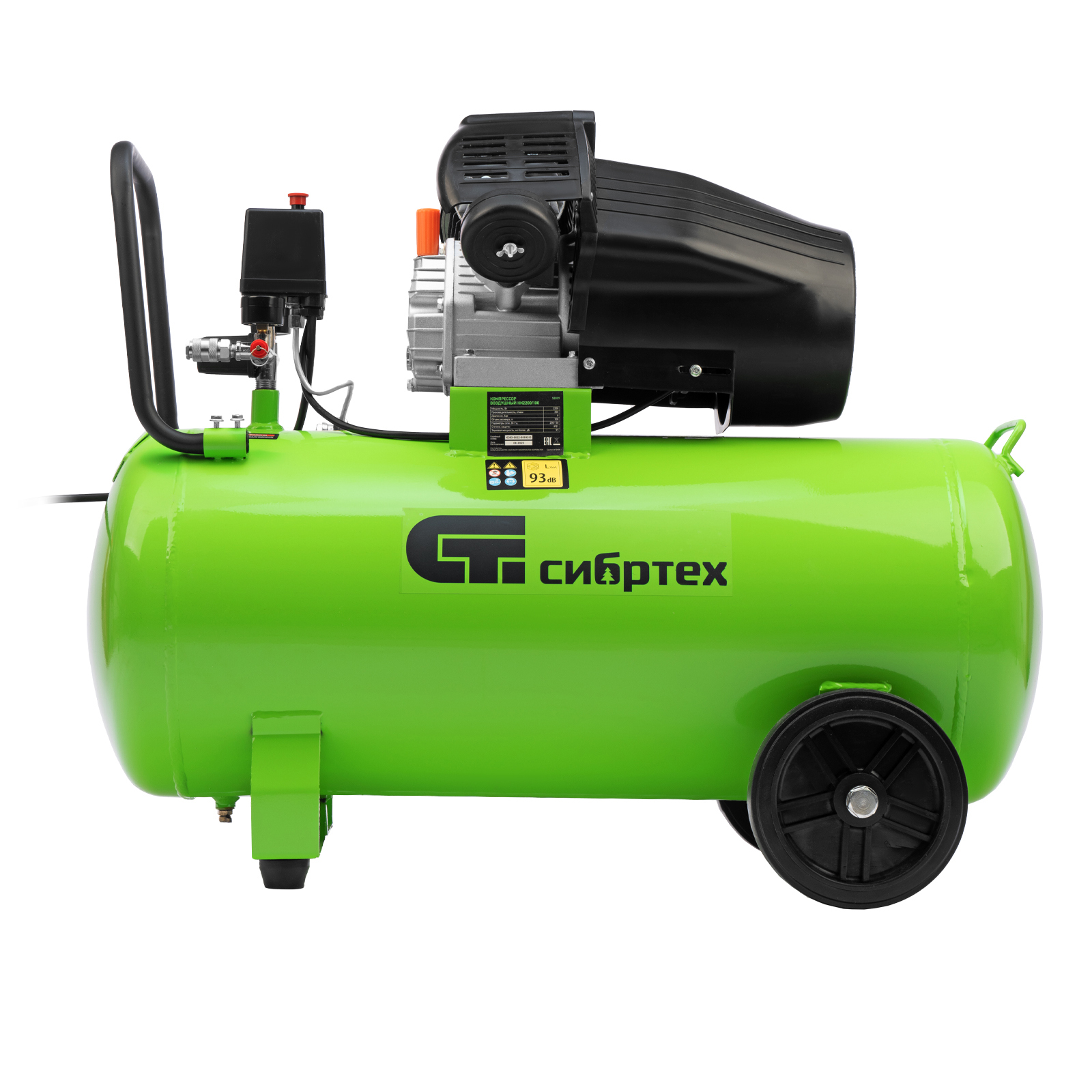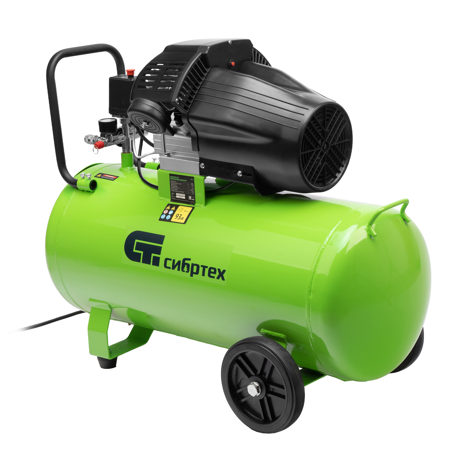 Компрессор воздушный масляный Сибртех КК-2200/100 58009 мощностью 2,2 кВт, с объемом всасываемого воздуха 350 л/мин, с прямым приводом, оборудован ресивером на 100 л. Обеспечивает подачу сжатого воздуха для бесперебойной работы краскораспылителя, гайковерта, продувочного пистолета или другого пневмоинструмента. Будет полезен в автосервисе, гараже, на строительной площадке и небольшом производстве.