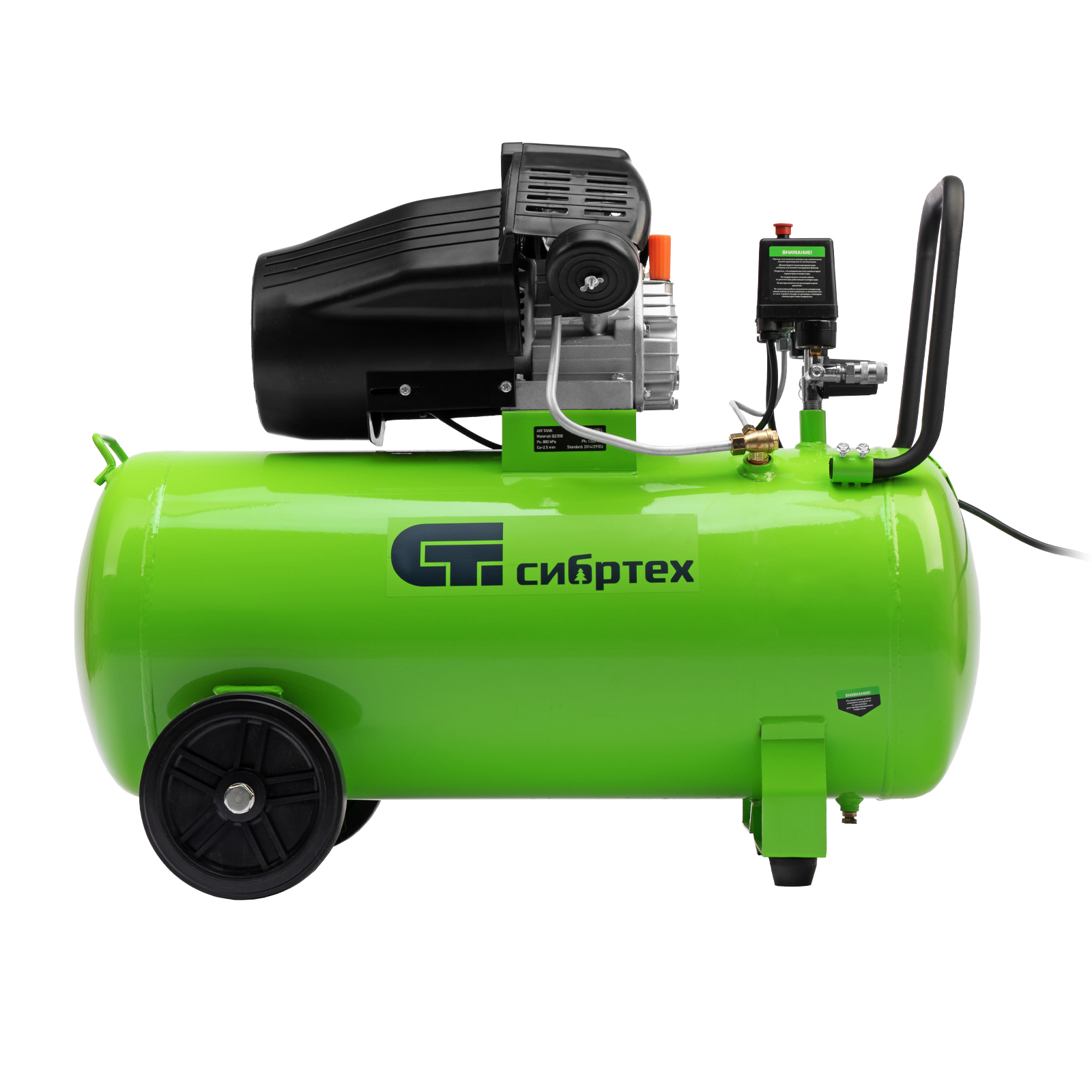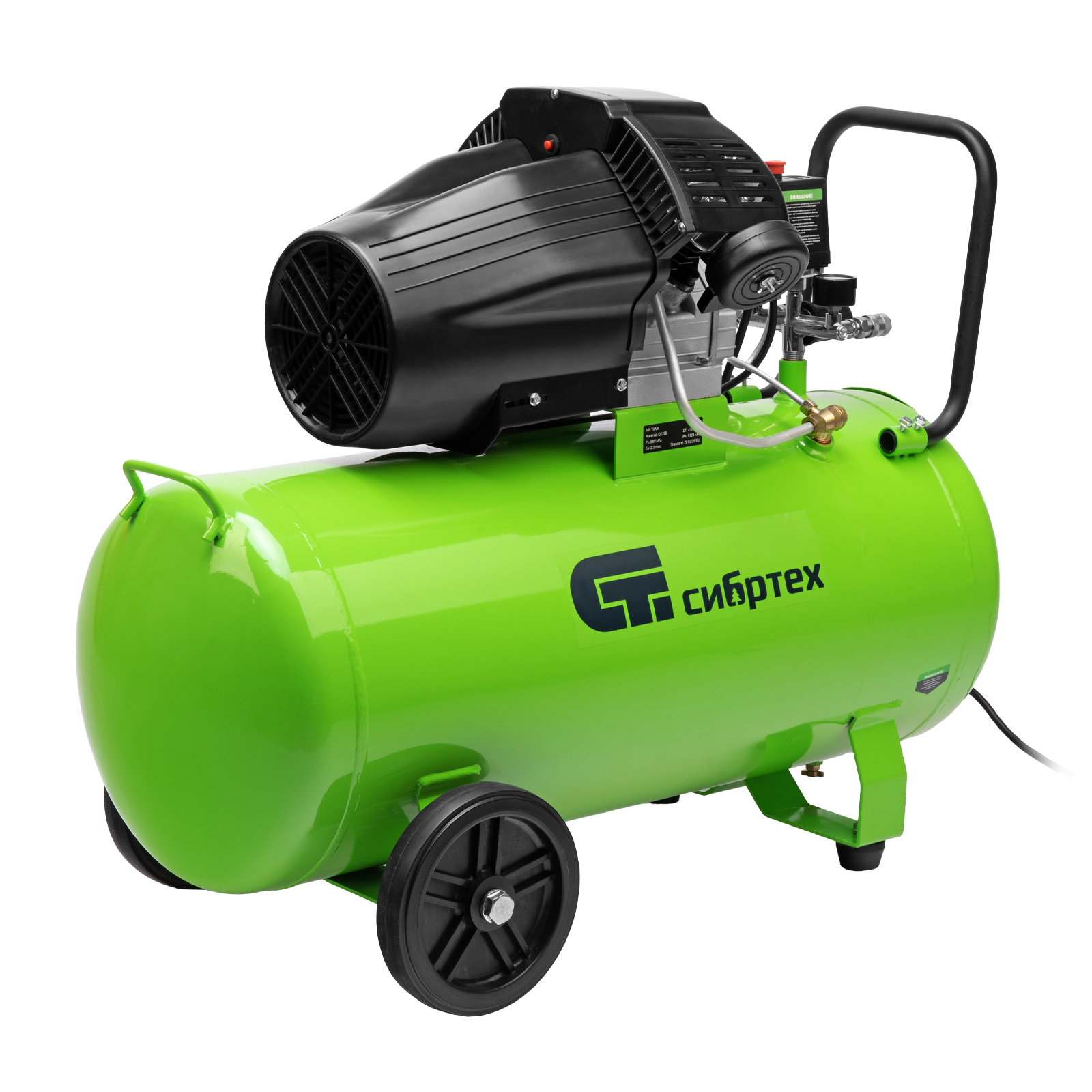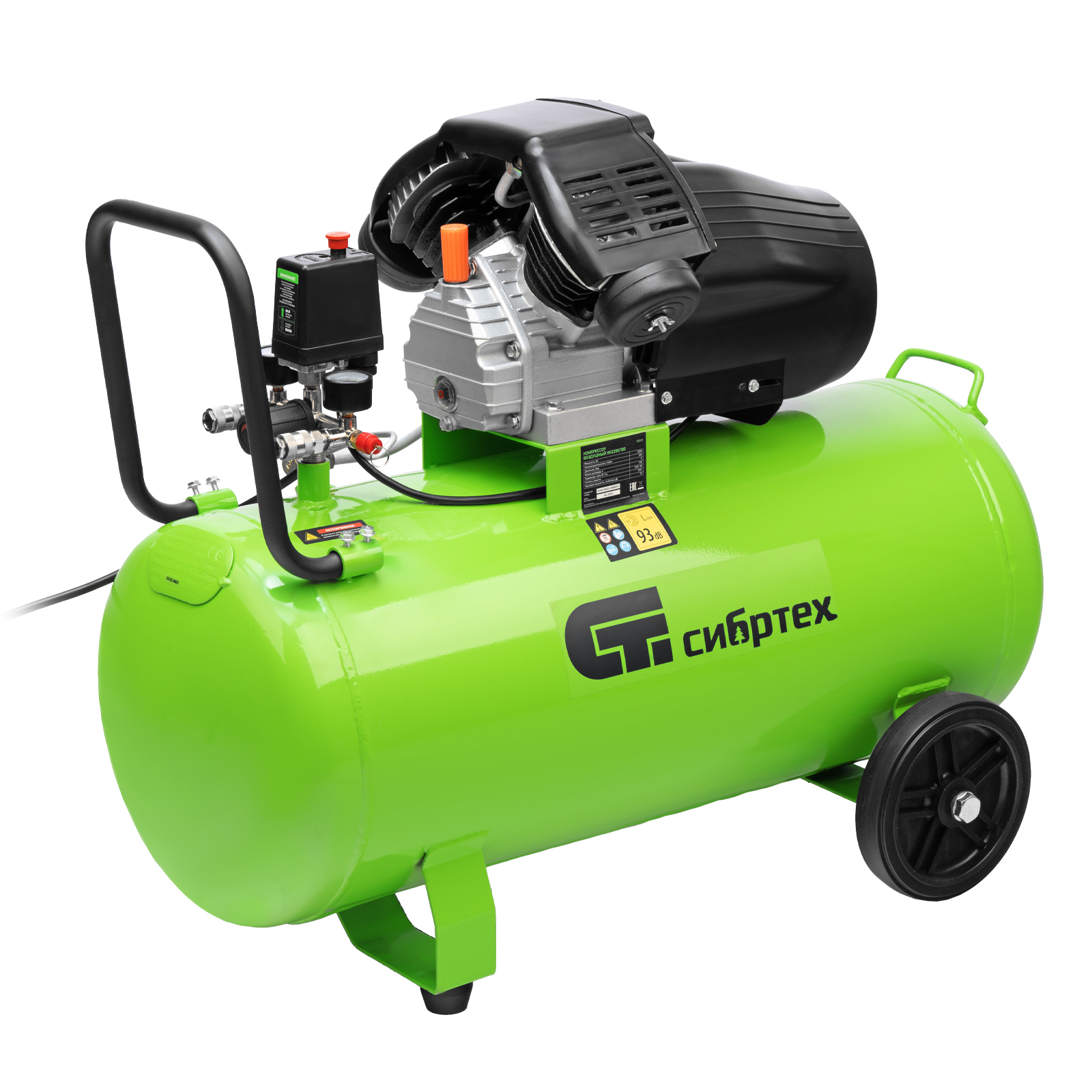 Компрессор воздушный масляный Сибртех КК-2200/100 58009 мощностью 2,2 кВт, с объемом всасываемого воздуха 350 л/мин, с прямым приводом, оборудован ресивером на 100 л. Обеспечивает подачу сжатого воздуха для бесперебойной работы краскораспылителя, гайковерта, продувочного пистолета или другого пневмоинструмента. Будет полезен в автосервисе, гараже, на строительной площадке и небольшом производстве.