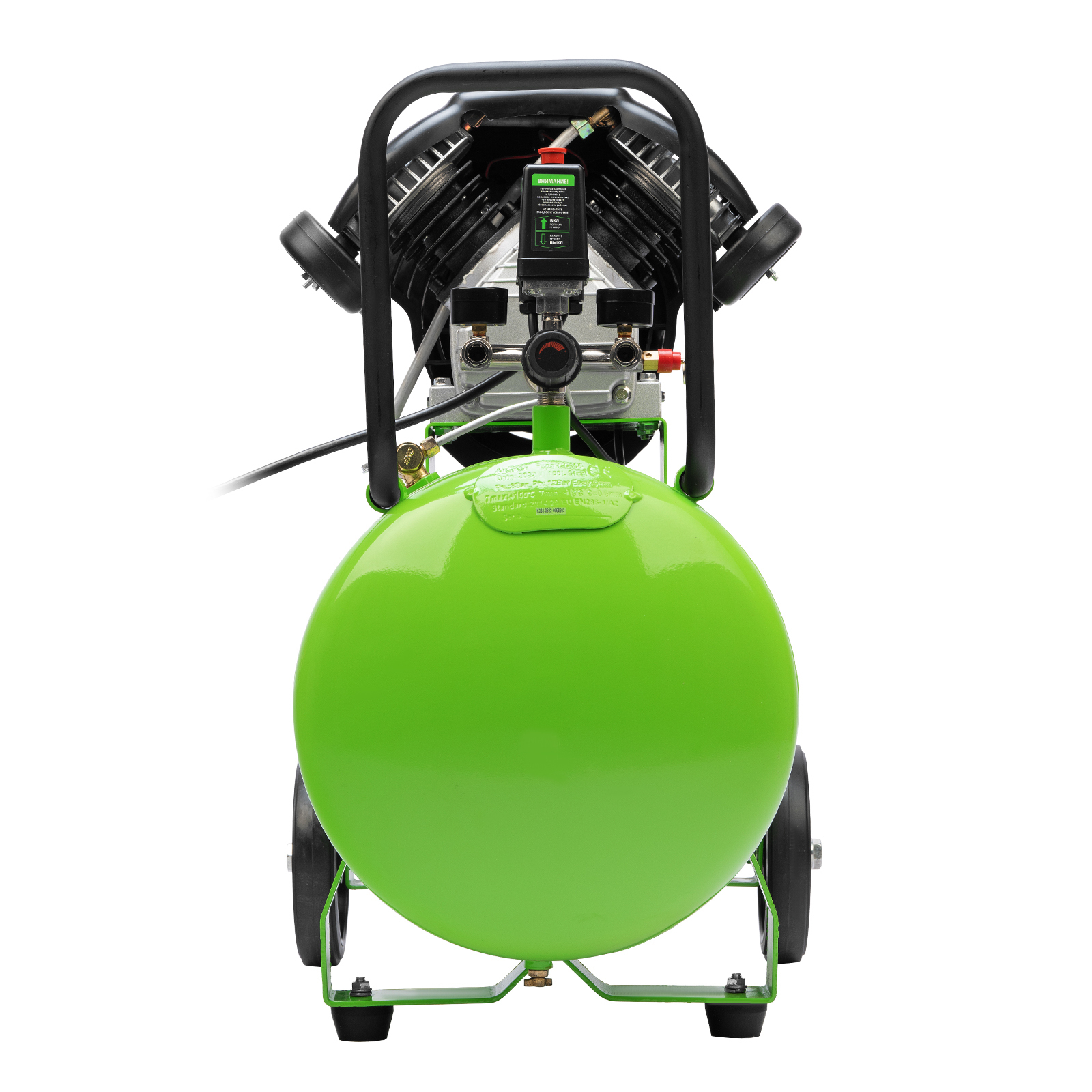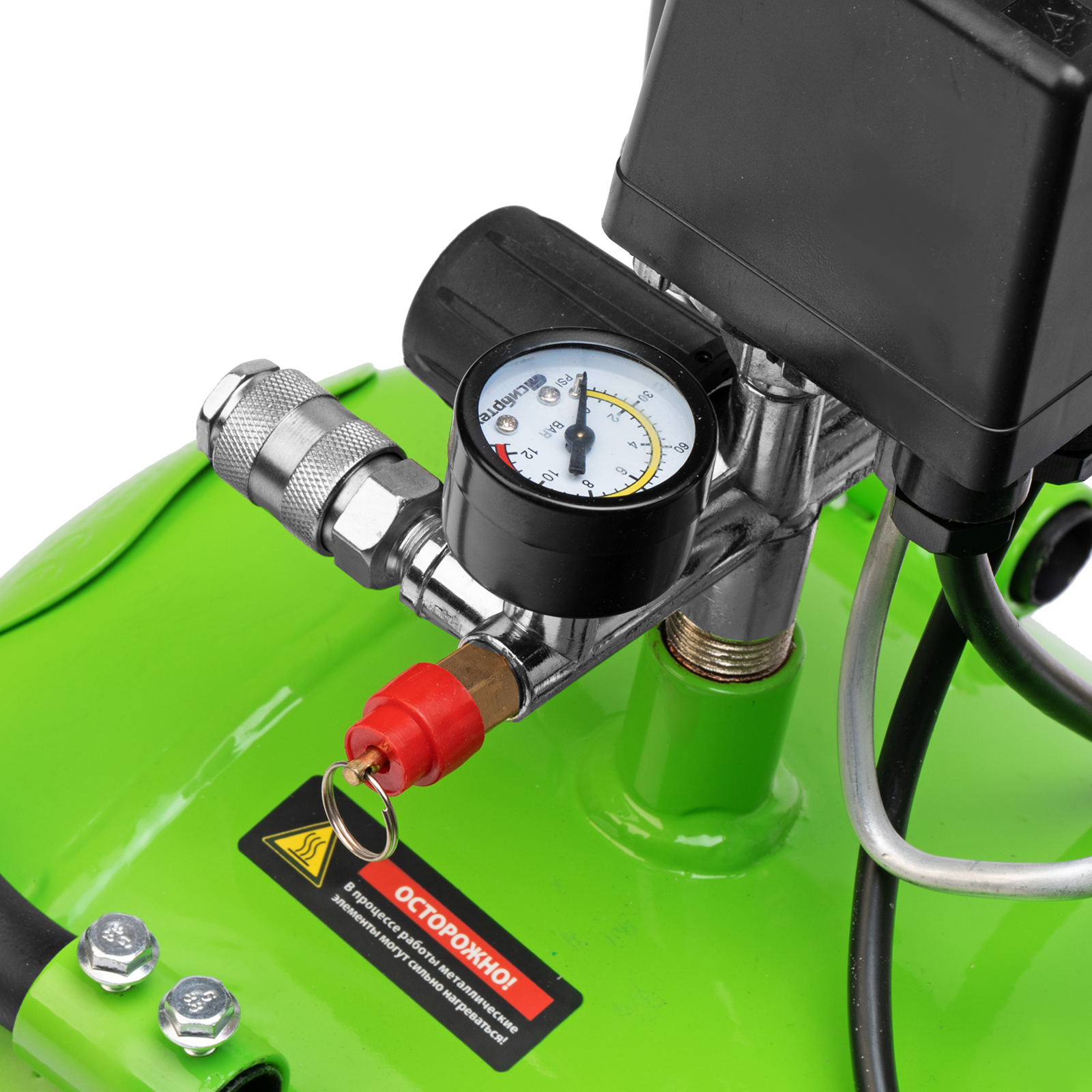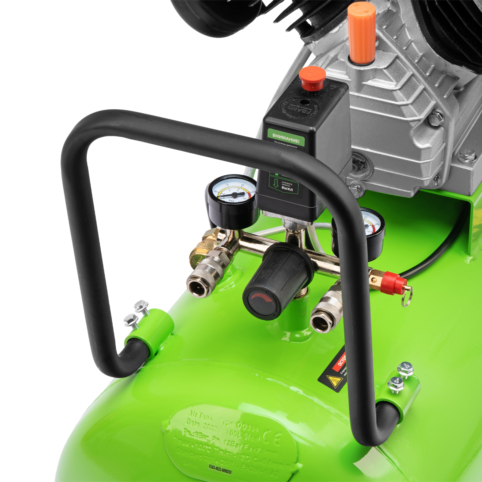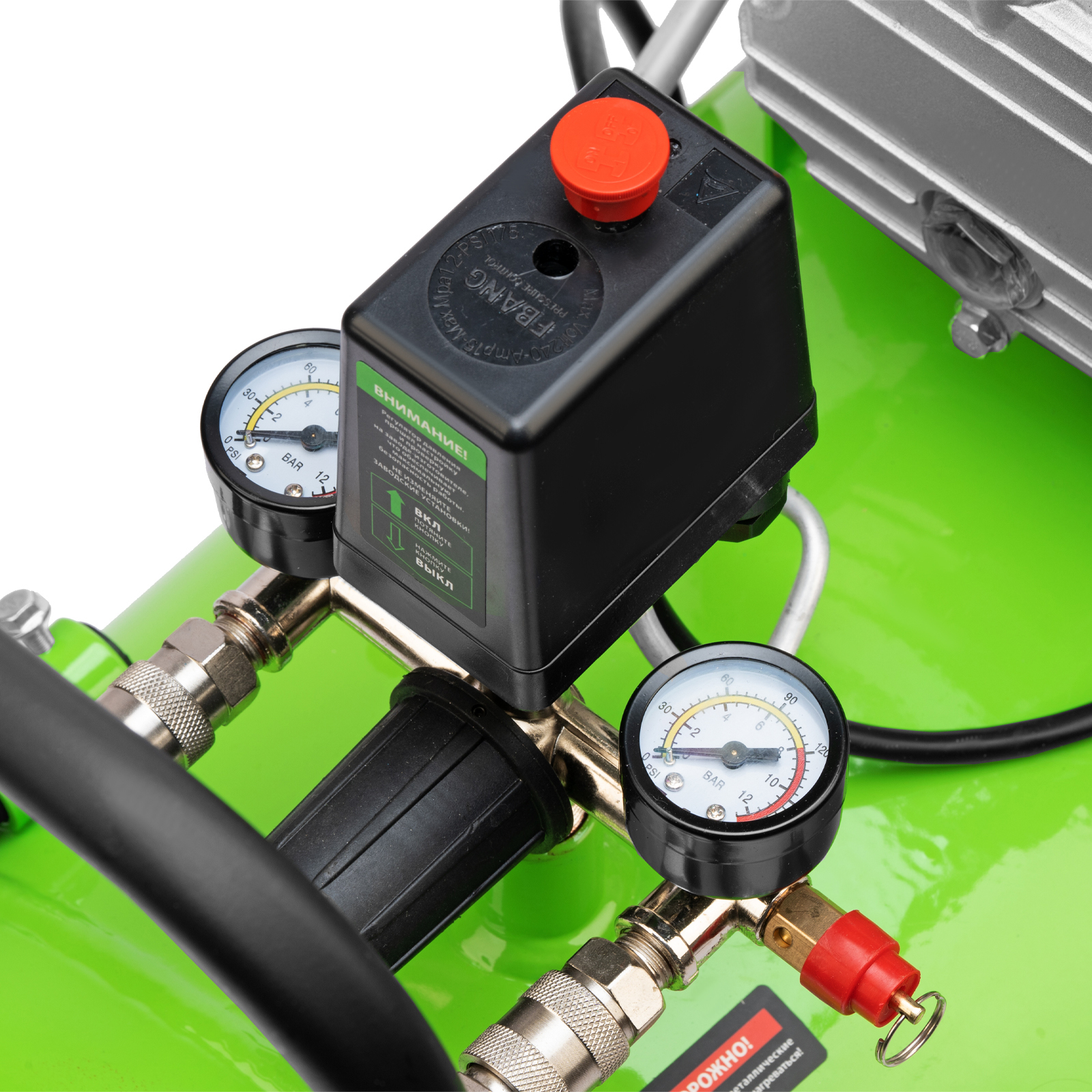- Контроль давления в ресивере и выходной магистрали — 2 манометра расположены максимально удобно для считывания показателей.