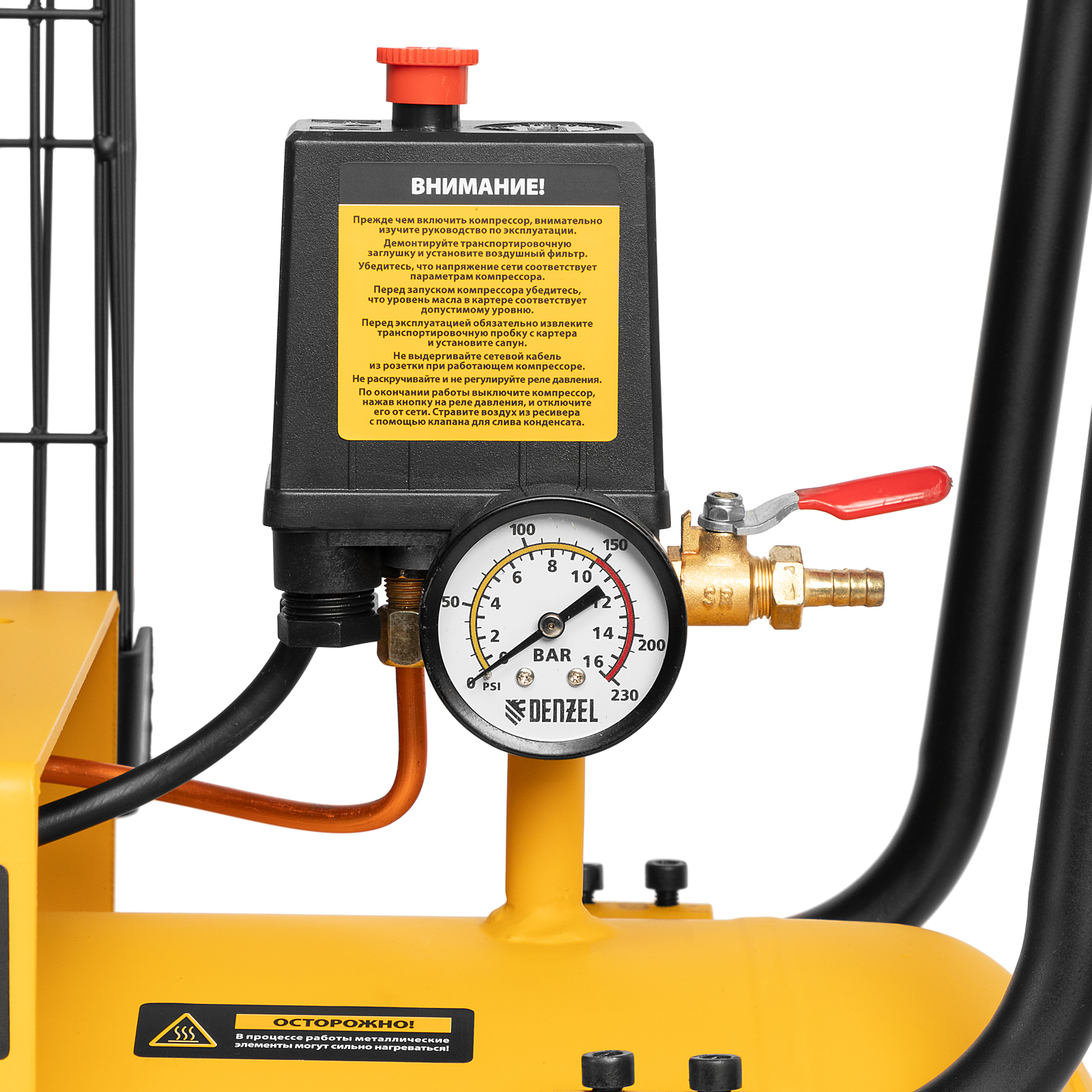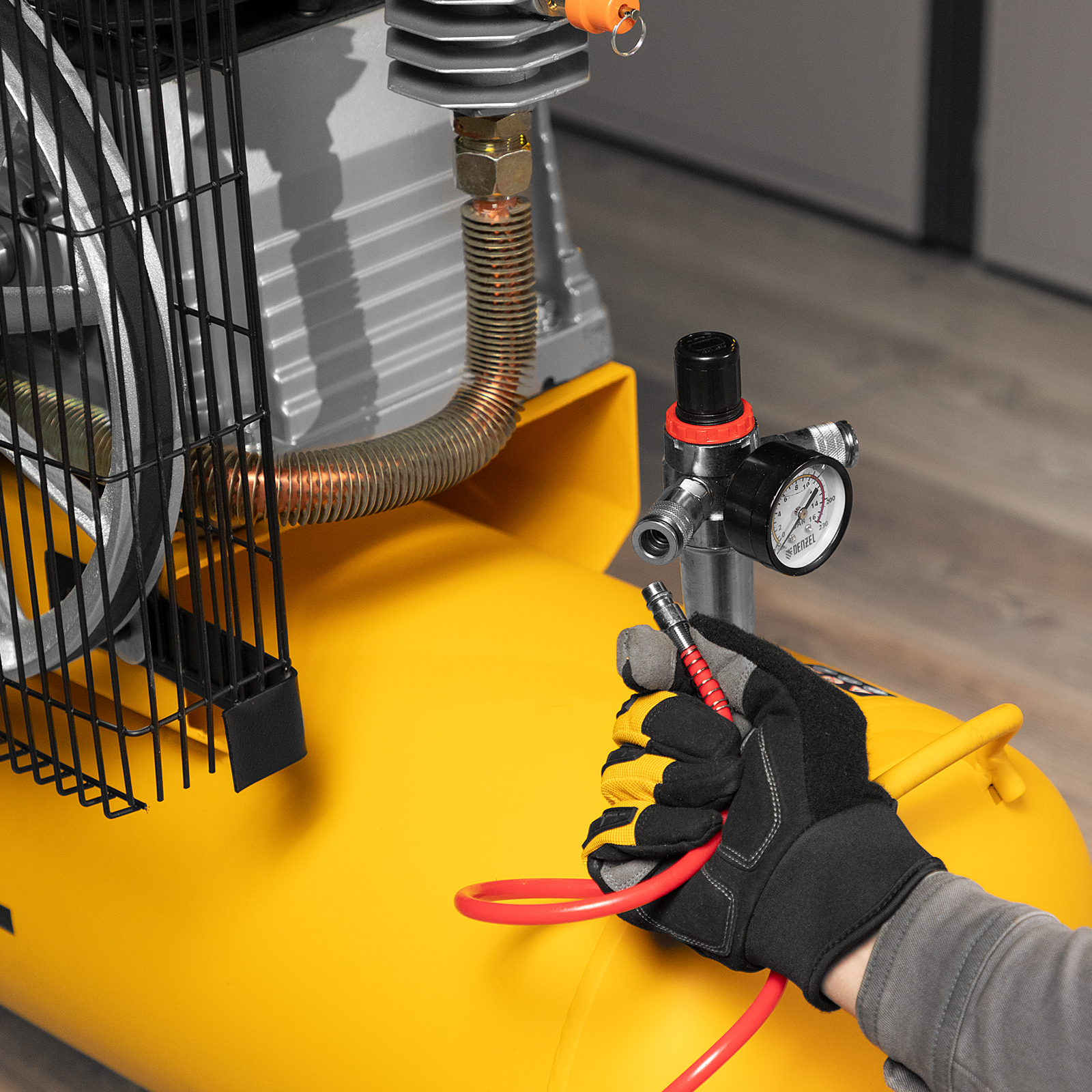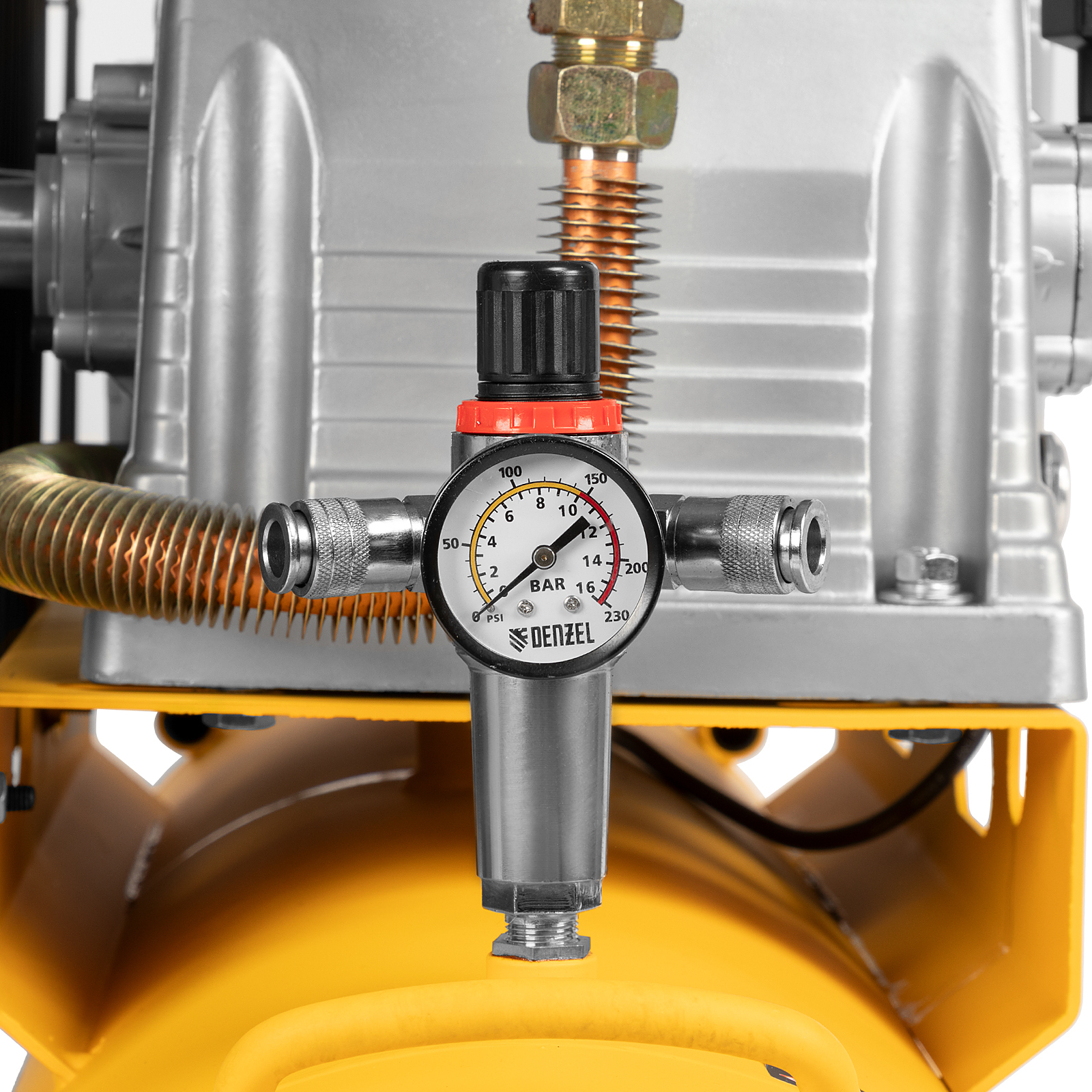 - Удобный контроль и корректировка работы — два манометра служат для отслеживания давления в ресивере и пневмолинии.