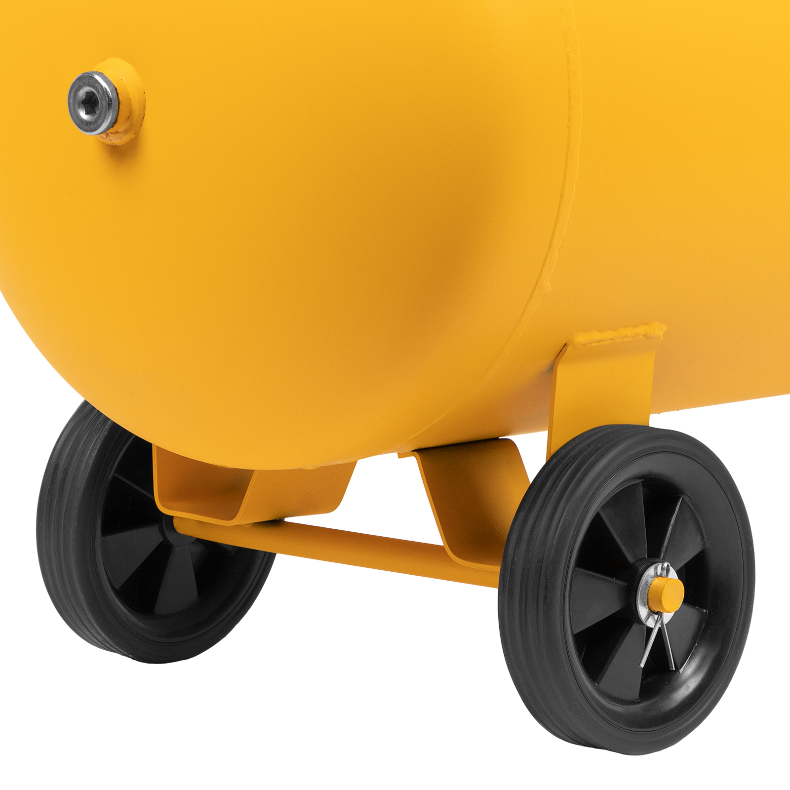 - Удобная транспортировка — на компрессоре установлены колеса, в т. ч. поворотные, и П-образная ручка.
