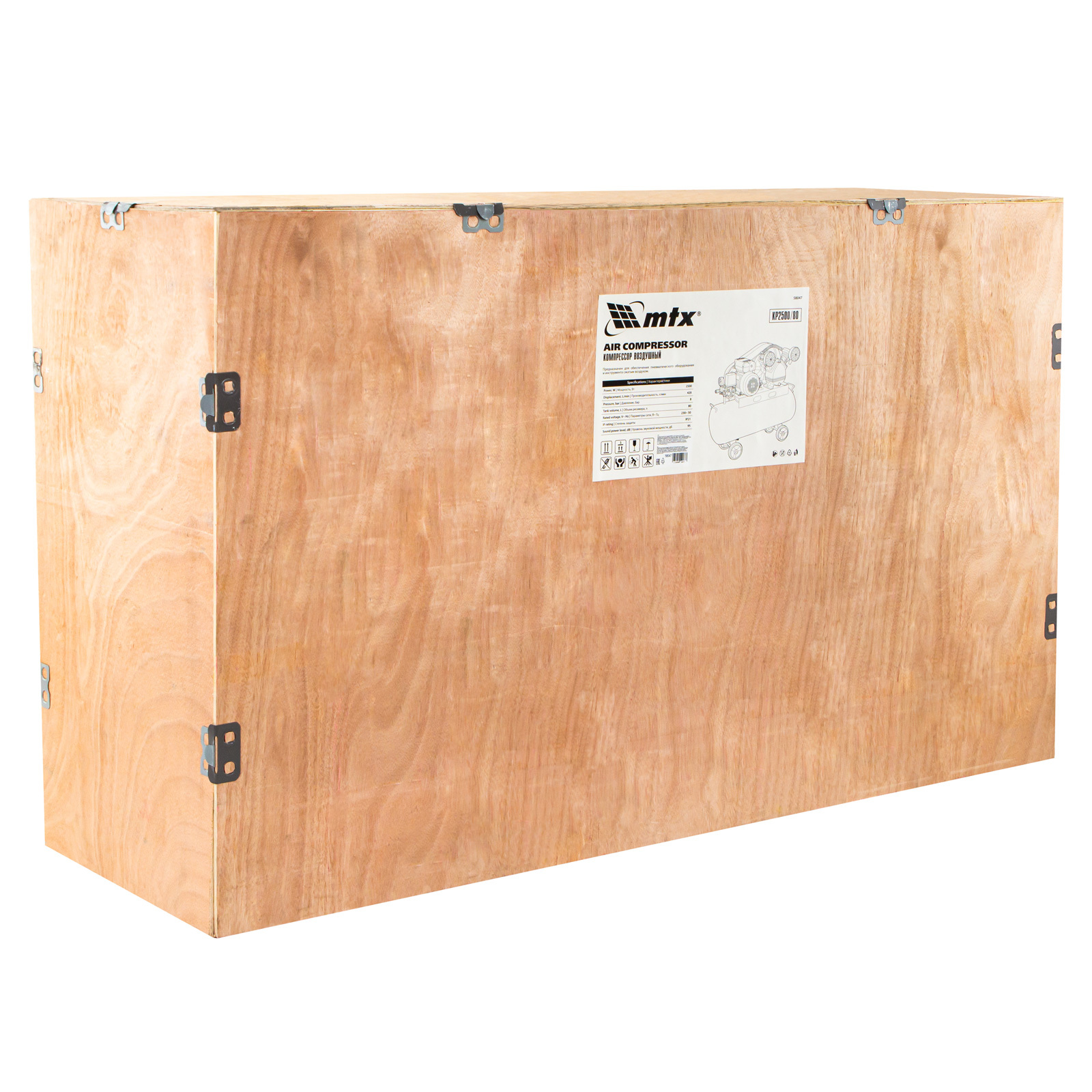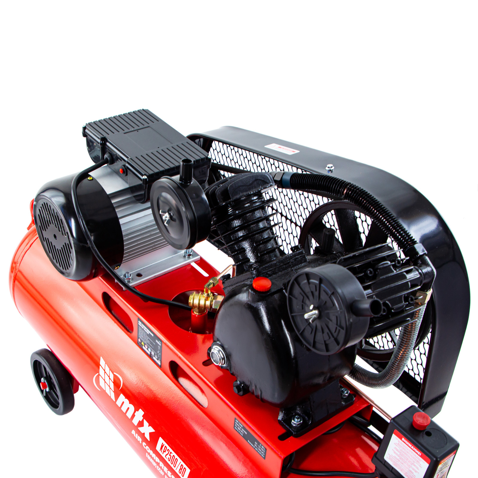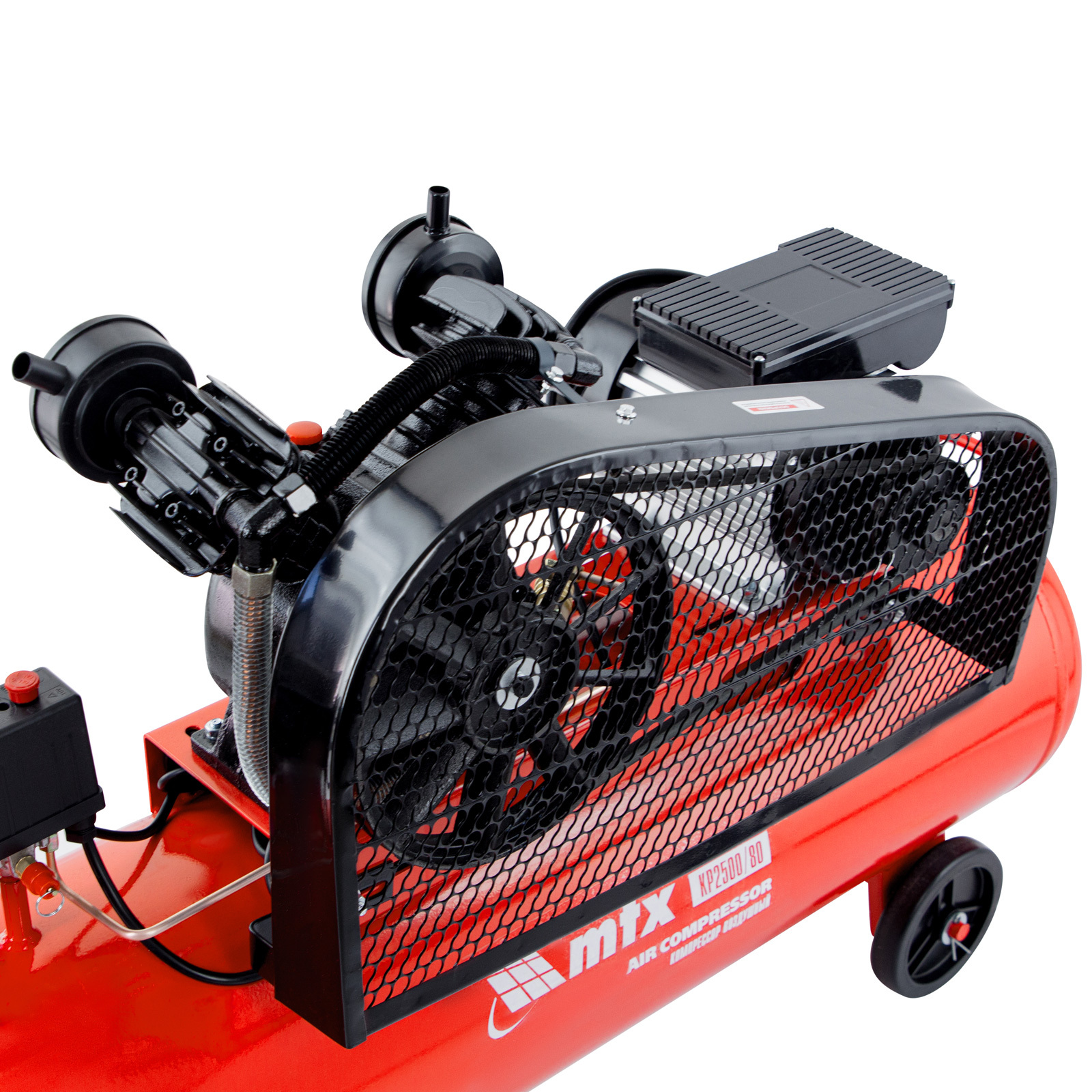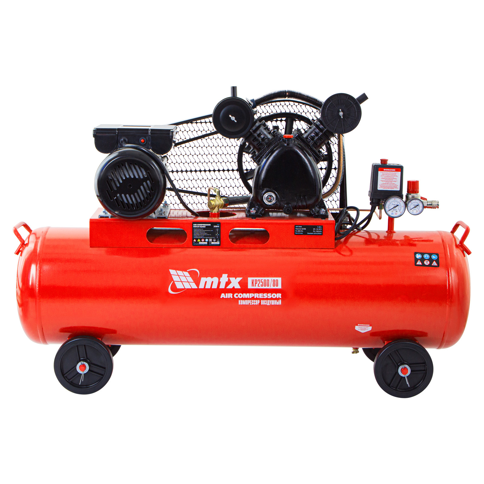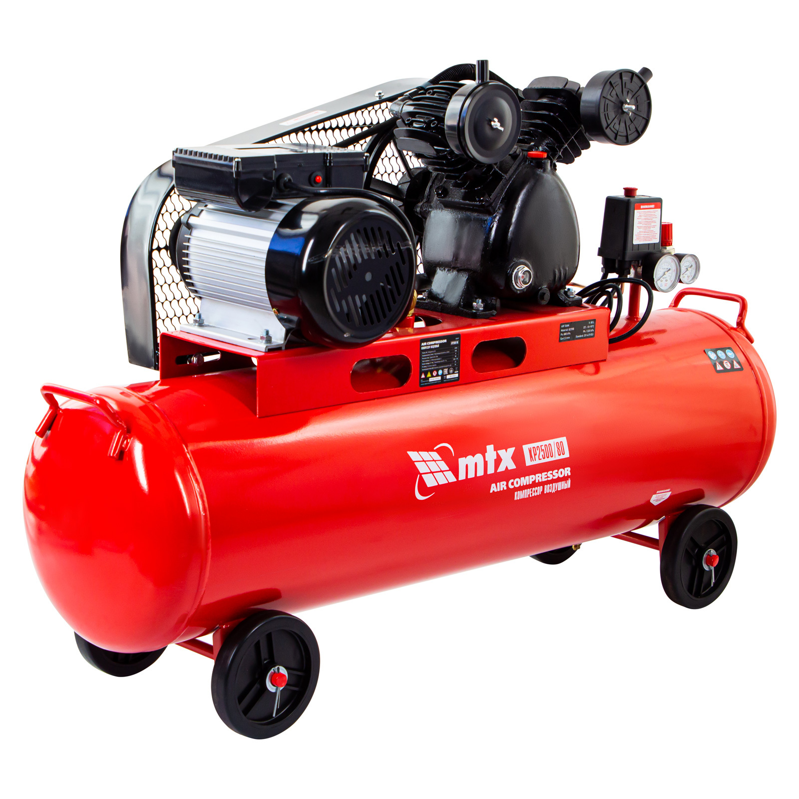 Компрессор воздушный МТХ КР2500/80 58047 с ременным приводом от электродвигателя, мощностью 2,5 кВт и производительностью 420 л/мин, с ресивером объемом 80 литров, применяется для подачи сжатого атмосферного воздуха в пневматические инструменты. К нему можно подключать гайковерт, дрель, степлер, краскопульт, продувочный пистолет и т.п.