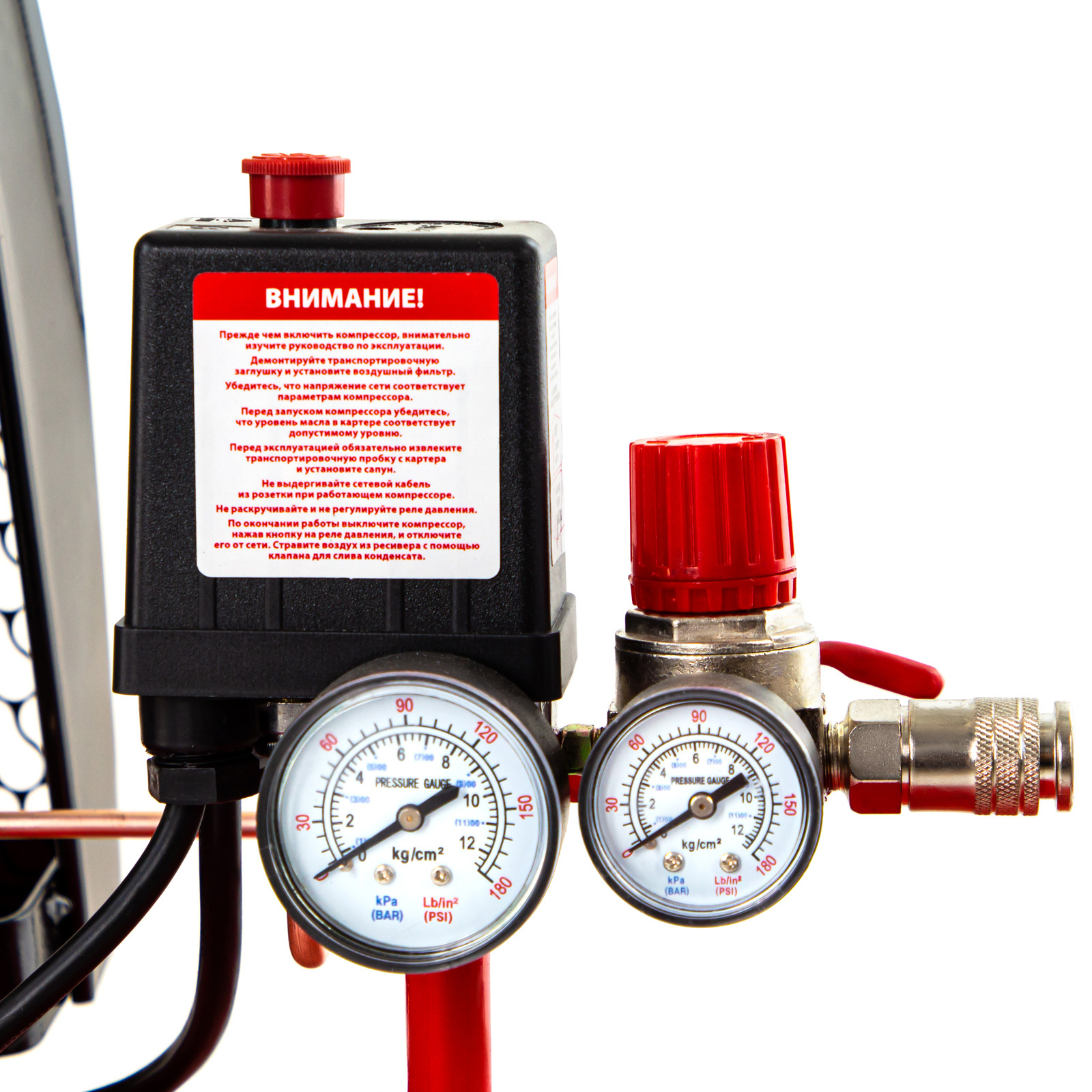 - Защитный клапан — превышение максимально допустимого давления в ресивере исключено.