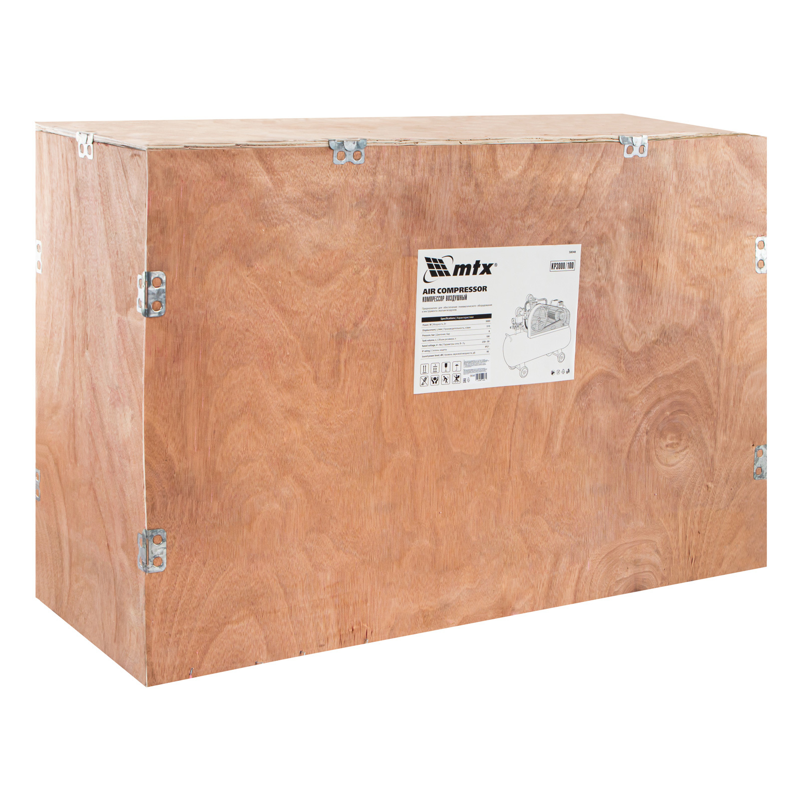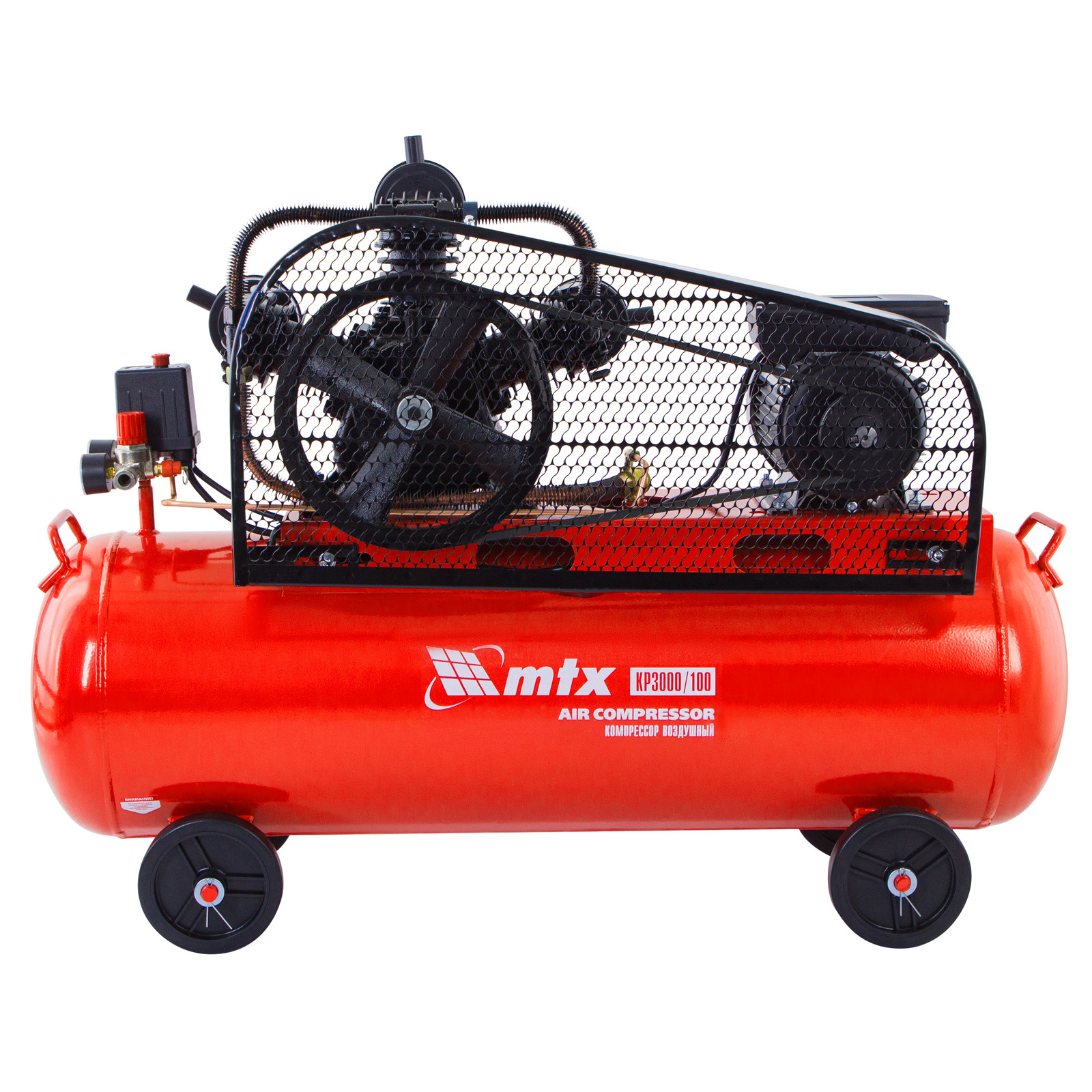 Компрессор воздушный МТХ КР3000/100, 58048, с ременным приводом от электродвигателя, мощностью 3,0 кВт и производительностью 510 л/мин, с ресивером объемом 100 литров, применяется для подачи сжатого атмосферного воздуха в пневматические инструменты. К нему можно подключать гайковерт, дрель, степлер, краскопульт, продувочный пистолет и т.п.