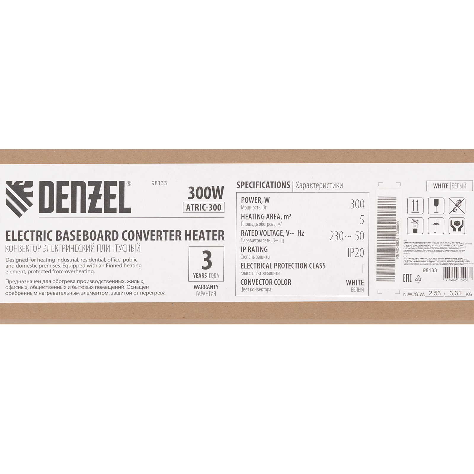 Конвектор электрический плинтусный ATRIC-300, 230 В, 300 Вт, ТЭН Denzel