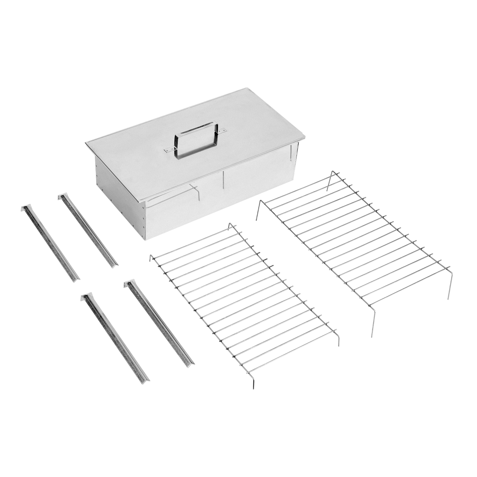 Корпус коптильни - 1 штКрышка - 1 штРешетка - 2 штНожки - 4 штПоддон - 1 штКрышка - 1 штПоддон для сбора жира - 1 штРешетка - 1 шт