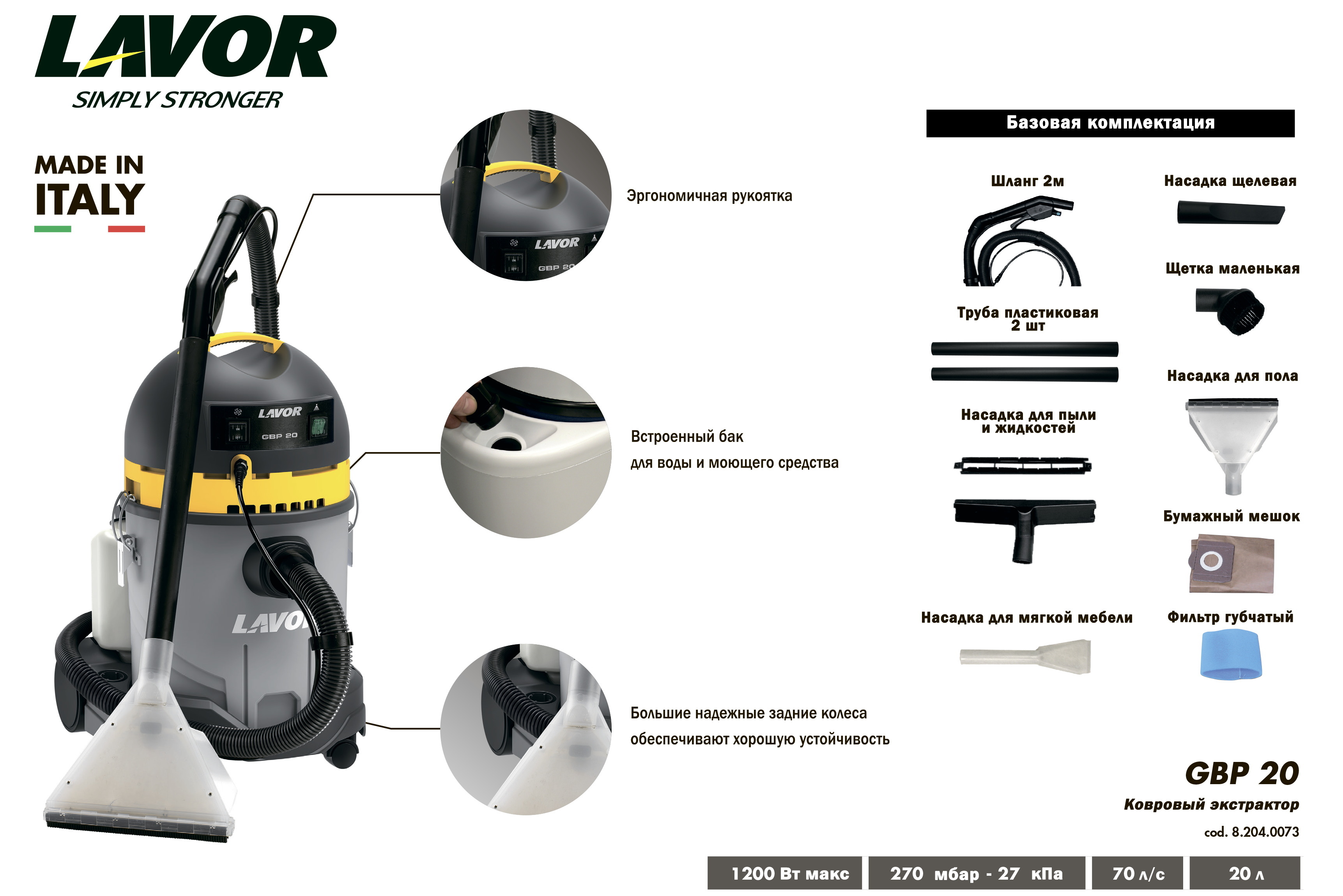 Ковровый экстрактор Lavor (Лавор) Pro GBP 20 New подойдет для удаления пятен и придания аккуратного вида коврам и ковровым покрытиям. Профессиональный пылесос LavorPro GBP 20 для чистки ковров имеет 2-литровый бак для моющего раствора, который он может в нужном количестве наносить по всей площади ковра.