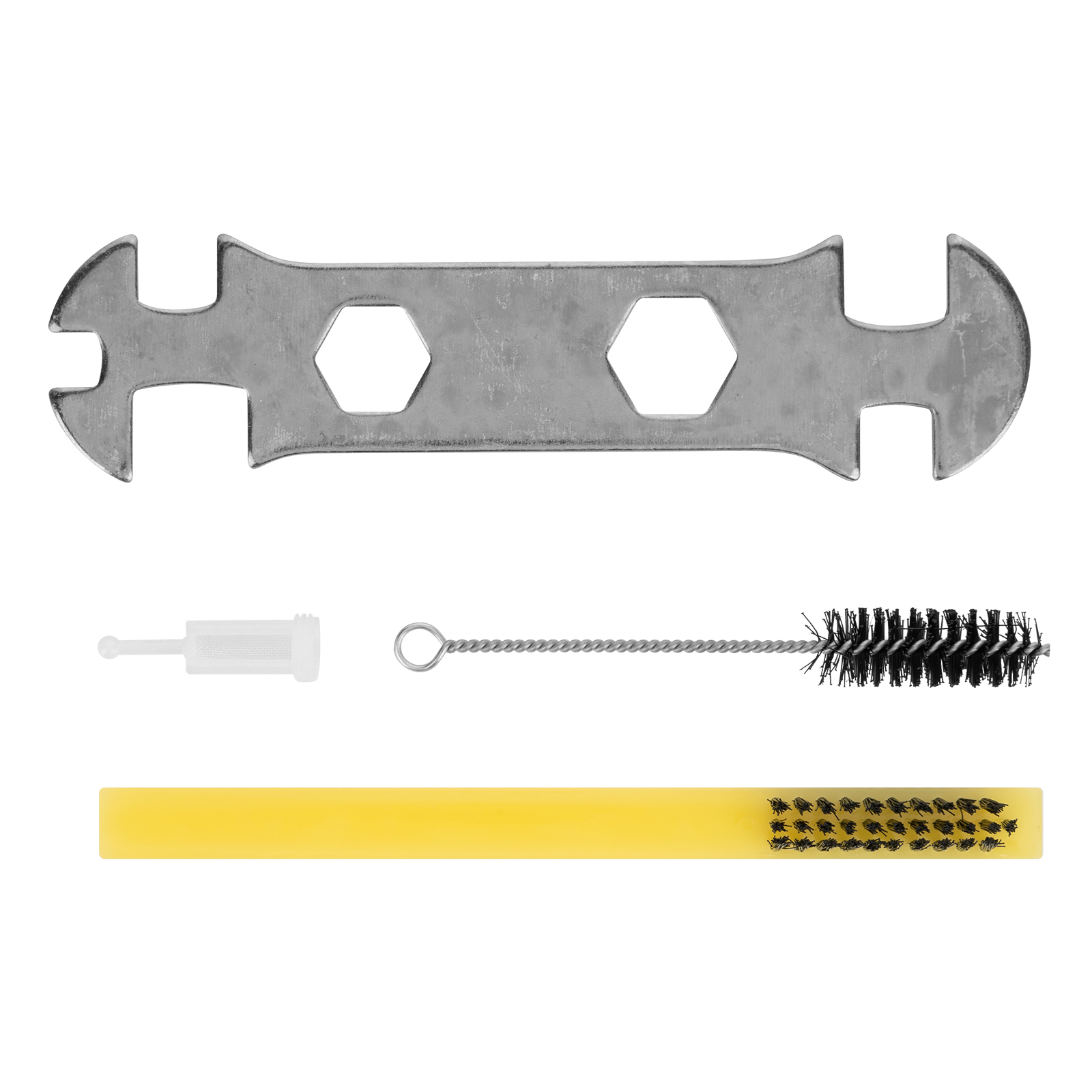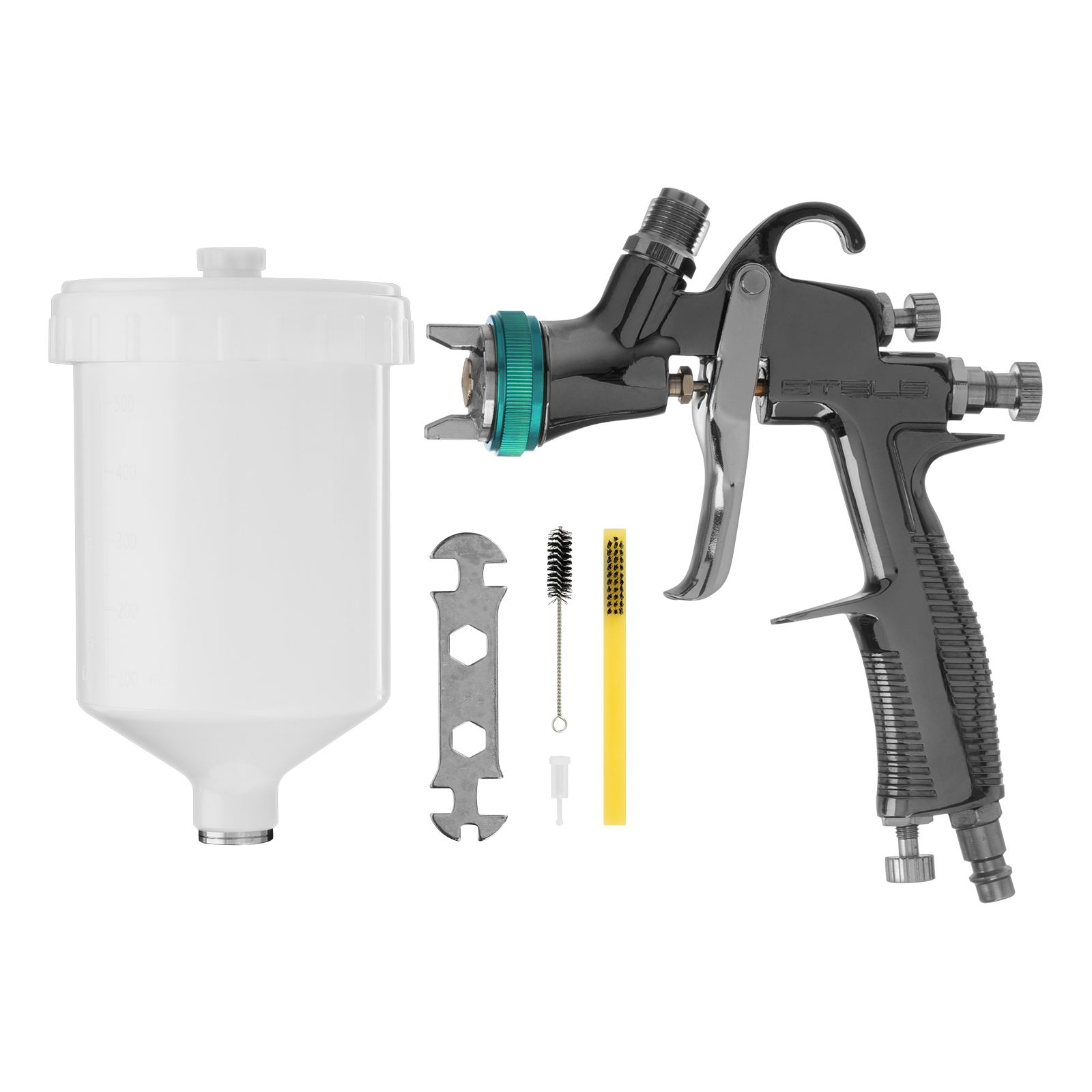 Краскораспылитель с бачком - 1 штШтуцер - 1 штСменное сопло диаметром 1,5 мм - 1 штРуководство по эксплуатации и гарантийный талон - 1 шт