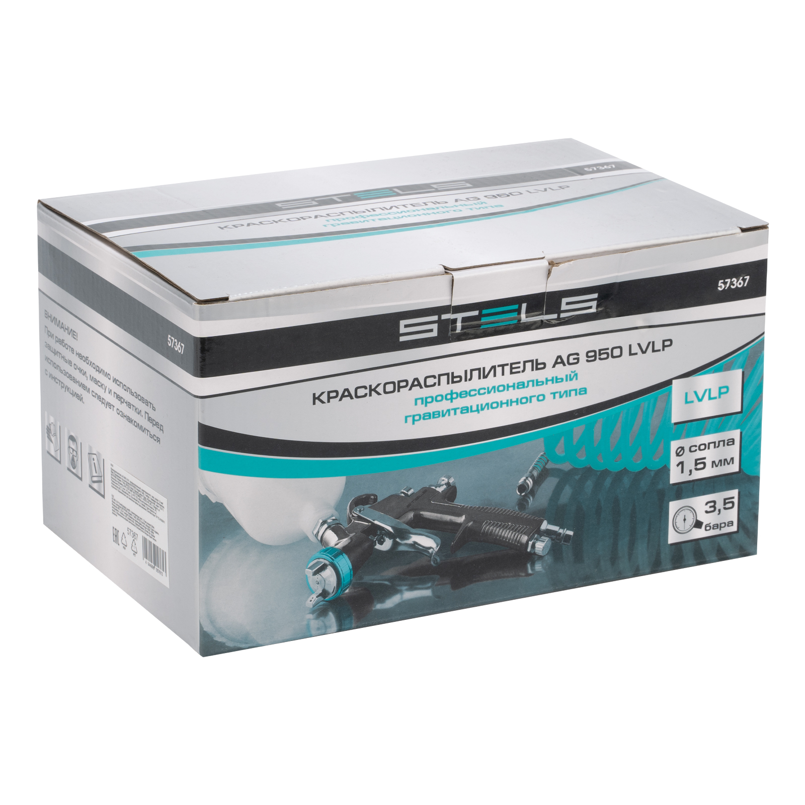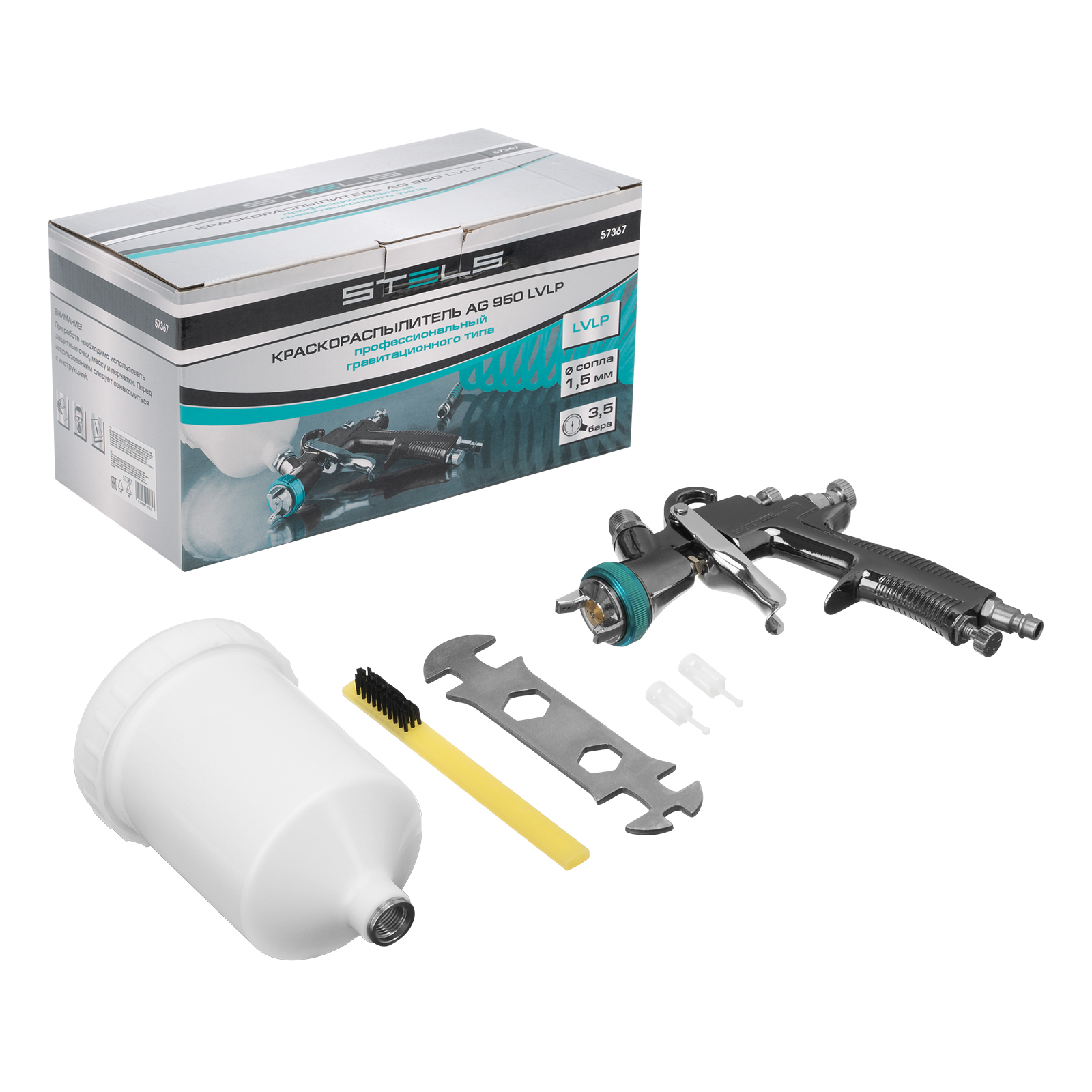 Профессиональный пневматический краскораспылитель гравитационного типа Stels AG 950 LVLP 57367 с соплом диаметром 1,5 мм подходит для проведения окрасочных работ, покрытия керамики глазурью, грунтовки стен, побелки потолков, лакирования дерева. Технология «Низкий объем, низкое давление» (Low Volume Low Pressure) позволяет уменьшить расход окрасочного материала до 140-190 мл/мин и добиться его 80-процентного переноса на обрабатываемую поверхность. Поэтому краскопульт отлично подойдет для применения как в быту, так и на производствах.