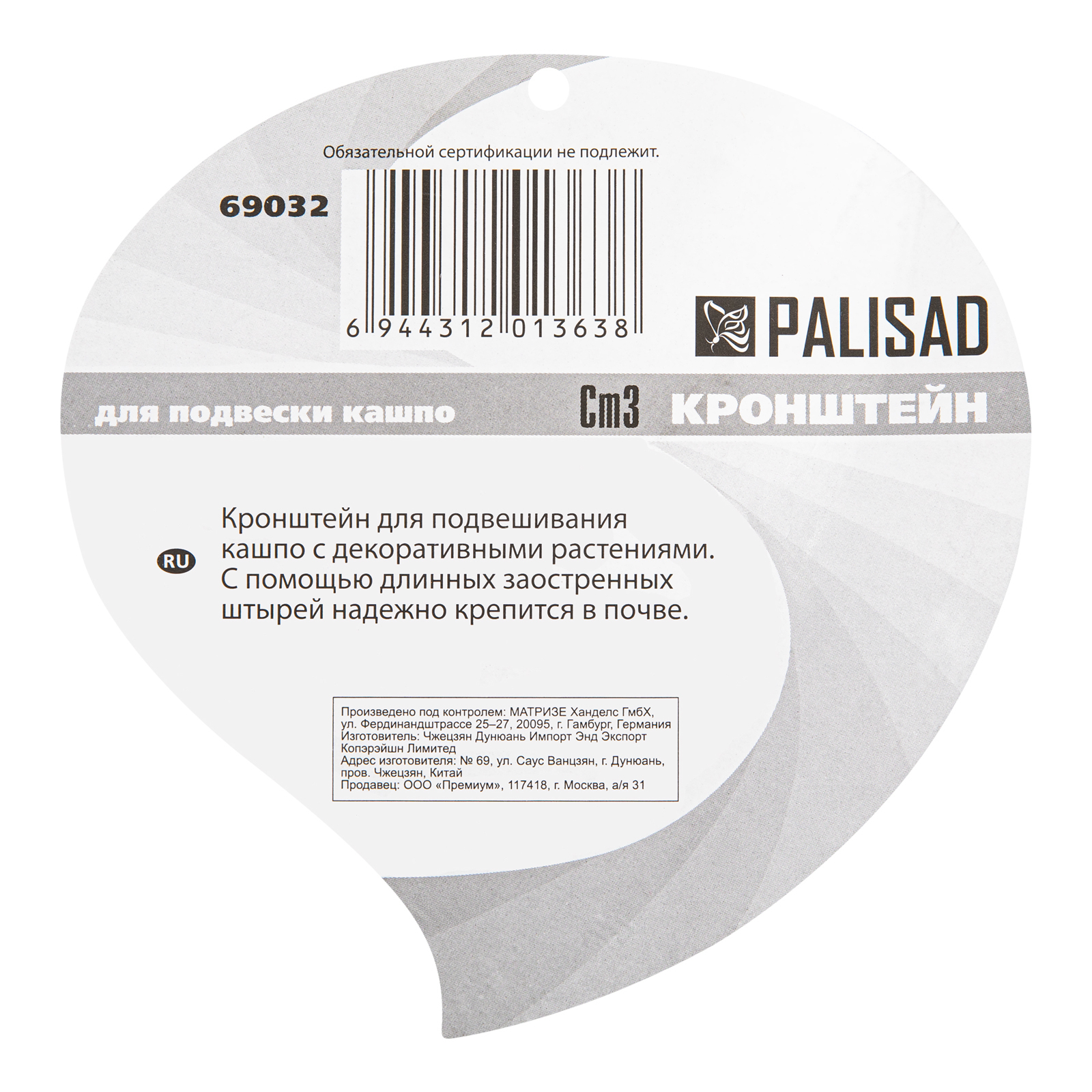 <p>Кронштейн для крепления подвесных корзин Palisad 69032 используется для установки на земле и подвешивания кашпо с декоративными цветами. Поможет оформить территорию и придать дачному участку оригинальный вид.</p><h2>Преимущества</h2><ul><li>Прочность и устойчивость к нагрузкам — кронштейн изготовлен из стали.</li><li>Долговечность и защита от коррозии — поверхность покрыта порошковой краской.</li><li>Простая и быстрая установка — достаточно погрузить в грунт длинные заостренные штыри в нижней части кронштейна.</li></ul>