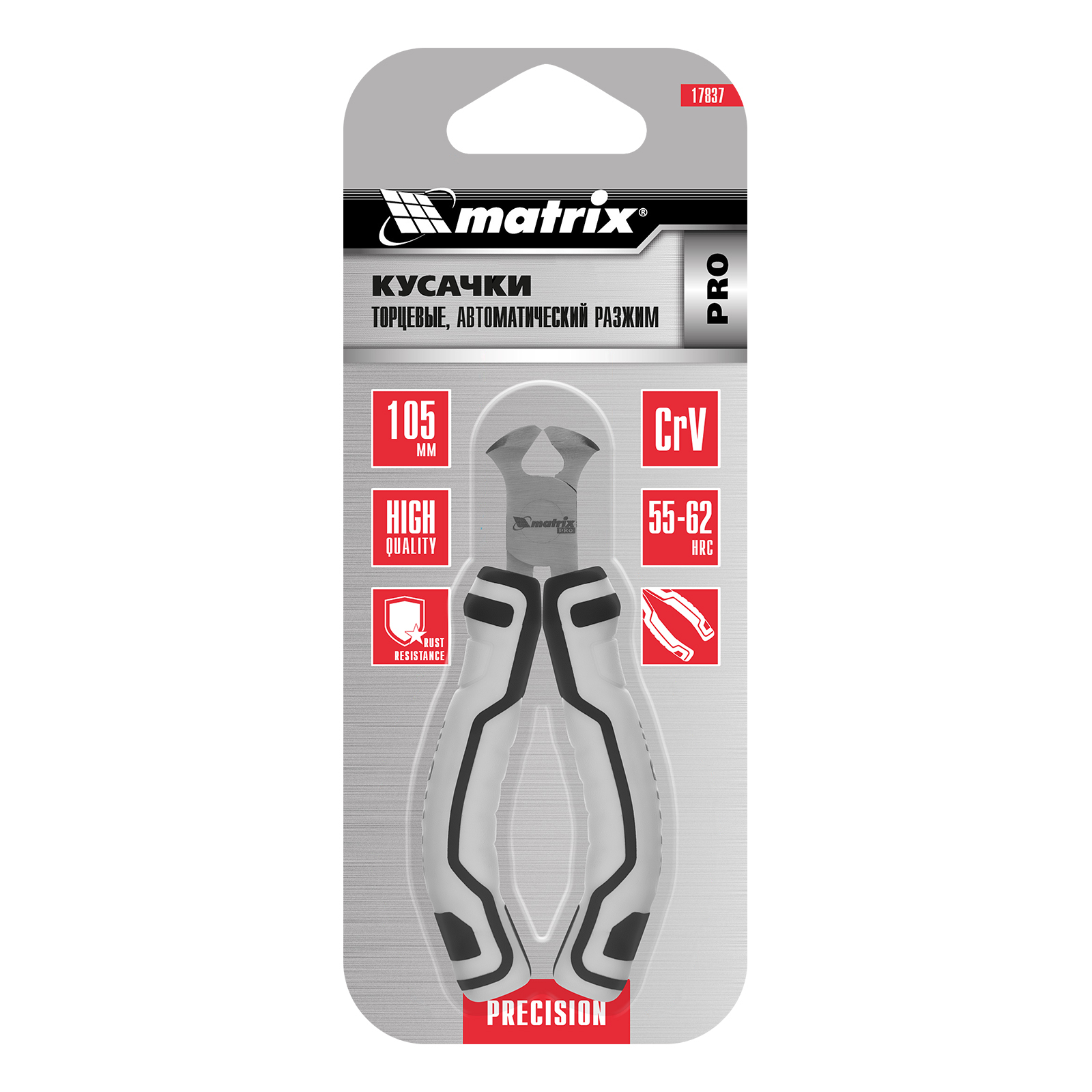 <p>Торцевые кусачки Matrix PRO Mini 17837 длиной 105 мм, с авторазжимом, легко и быстро перекусывают тонкие провода и проволоку. Авторазжим значительно упрощает работу. Кусачки используются для выполнения слесарных и электромонтажных работ во время строительства и ремонта, а также в быту.</p><h2>Преимущества</h2><ul><li>Прочность и долговечность — инструмент изготовлен из хромованадиевой стали.</li><li>Высокий ресурс — режущие кромки твердостью 55-62 HRC долго держат заточку.</li><li>Компактность — длина кусачек составляет всего 105 мм, поэтому их удобно носить с собой.</li><li>Комфортная работа — двухкомпонентные рукоятки удобно ложатся в руку.</li></ul>