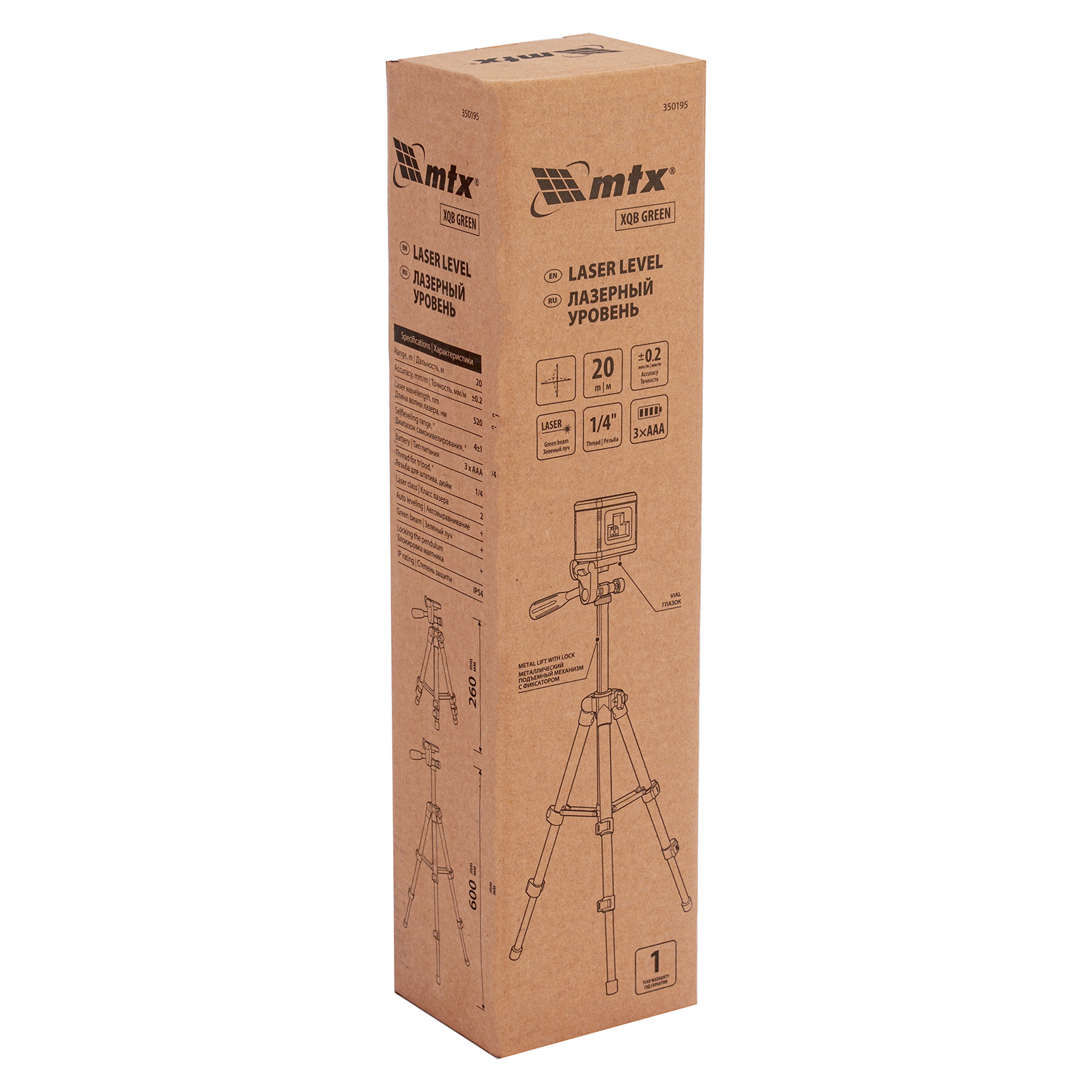 Лазерный уровень MTX XQB GREEN Pro SET 350195 с зеленым лучом, в комплекте с 3 батарейками ААА и штативом, проецирует на поверхность горизонтальную и вертикальную линии (крест) дальностью до 20 м. Незаменим при выполнении ремонтно-строительных работ в помещениях, подходит для бытового применения.