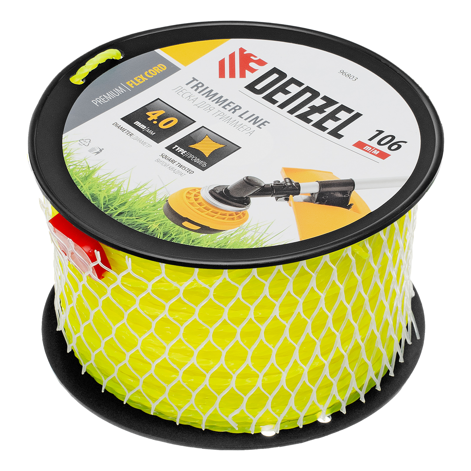 Леска для триммера Denzel FLEX CORD 96803 с сечением «витой квадрат», толщиной 4,0 мм и длиной 106 м, на DIN-катушке, предназначена для скашивания крупностеблевой растительности, сорняков, борщевика. Используется на бензиновых триммерах с объемом двигателя более 52 см3.