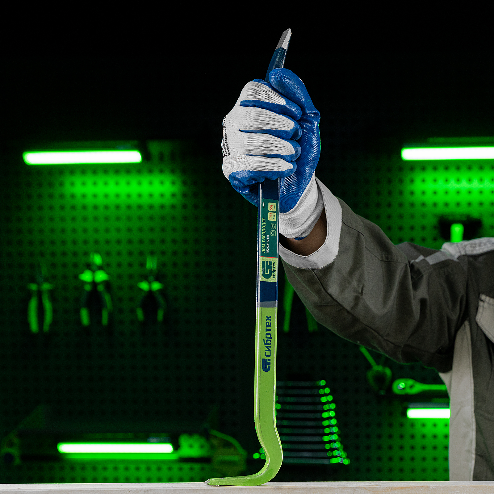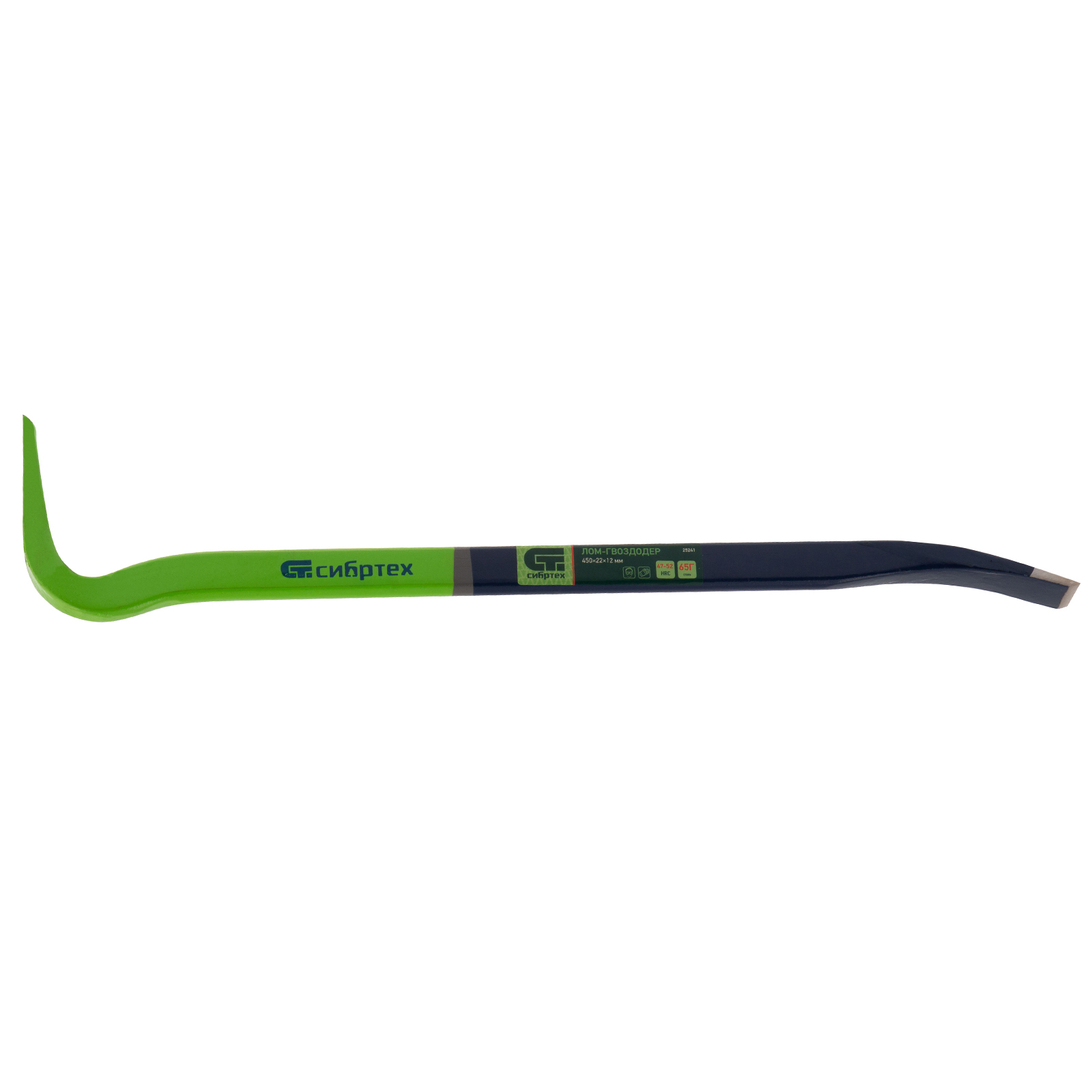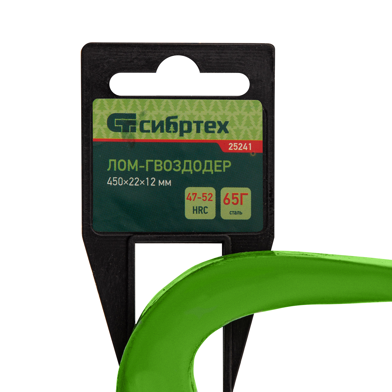 <p>Лом-гвоздодер Сибртех 25241 размером 450 х 22 х 12 мм позволяет удалять гвозди, а также срывать доски с пола, разбирать ящики, демонтировать заборы, вагонку со стен или шифер с крыши. Может служить рычагом для поднимания грузов, поскольку прямоугольно-овальный профиль значительно усиливает его на момент излома. Инструмент подходит для профессионального и бытового применения.</p><h2>Преимущества</h2><ul><li>Прочность — лом-гвоздодер из кованой стали 65 Mn, обладающей пружинными свойствами, не ломается при высоких нагрузках.</li><li>Устойчивость к повреждениям и износу — твердость рабочих частей составляет 42-44 HRC.</li><li>Защита от разрушения — на инструмент нанесено антикоррозийное покрытие.</li></ul>