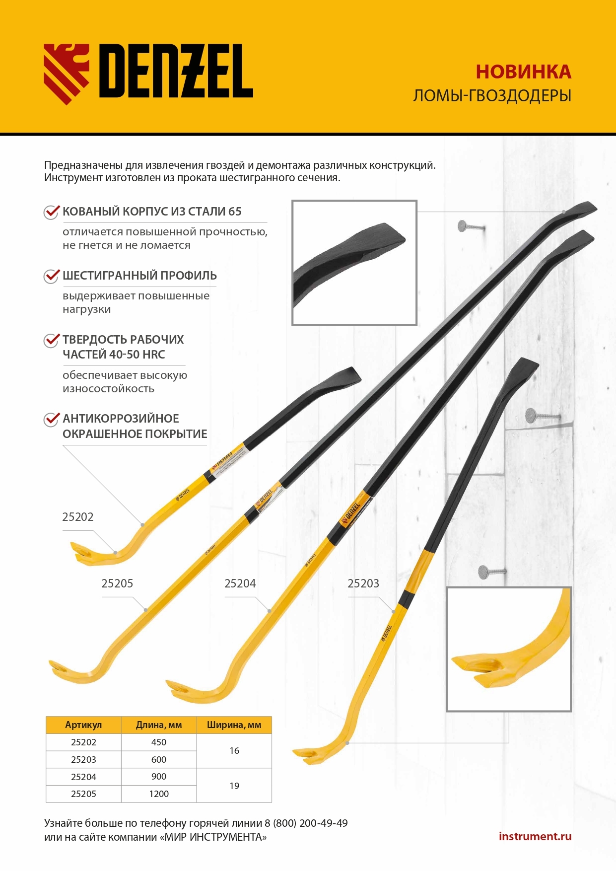 <p>Лом-гвоздодер Denzel 25203 из стали 65, длиной 600 мм, с шестигранным профилем шириной 16 мм и окрашенной поверхностью, предназначен для извлечения гвоздей и разрушения различных конструкций. Изготовлен из проката шестигранного сечения и выдерживает повышенные нагрузки. Используется для проведения строительных и демонтажных работ.</p><h2>Преимущества</h2><ul><li>Прочность — кованый корпус из стали 65 не гнется и не ломается при изгибающих нагрузках.</li><li>Высокий ресурс — рабочие части твердостью 40-50 HRC отличаются износостойкостью.</li><li>Защита от разрушения — корпус окрашен для предотвращения коррозии.</li><li>Яркий цвет — лом-гвоздодер хорошо заметен среди других инструментов.</li></ul>