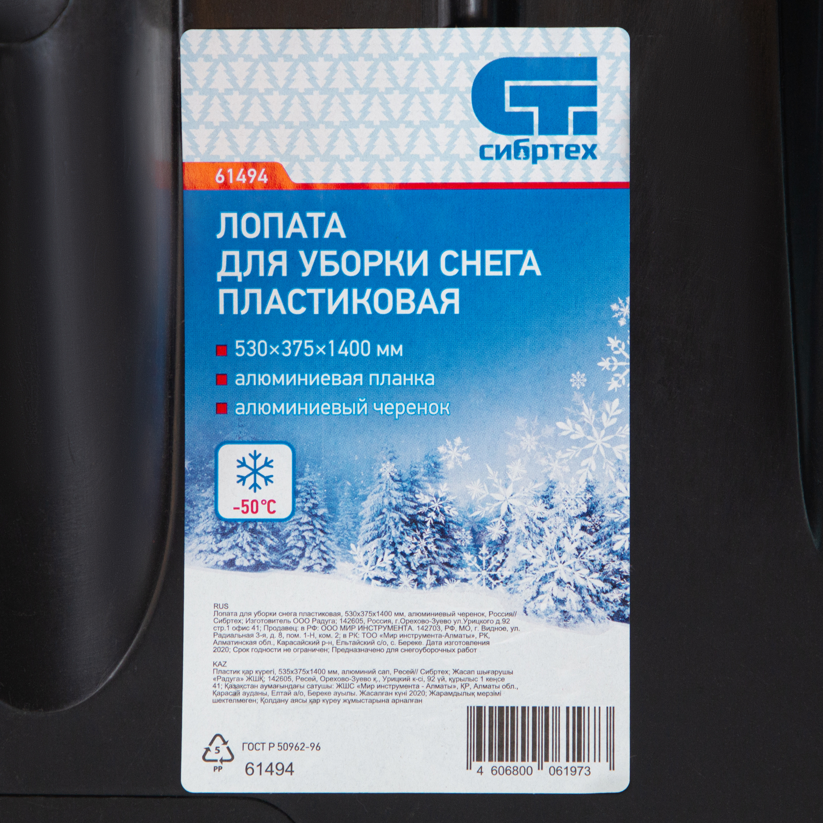 Лопата для уборки снега пластиковая, 530 х 375 х 1400 мм, алюминиевый черенок, Сибртех