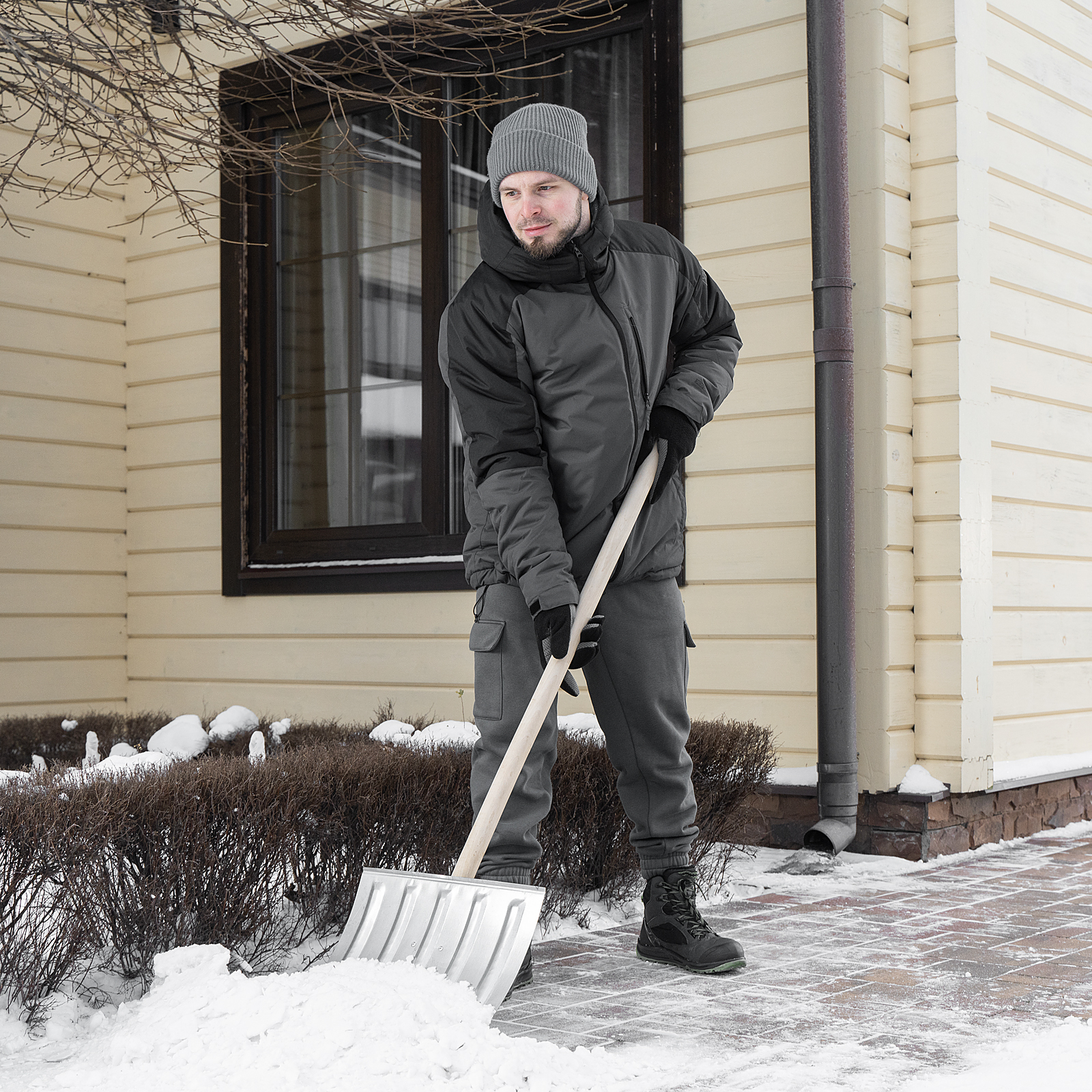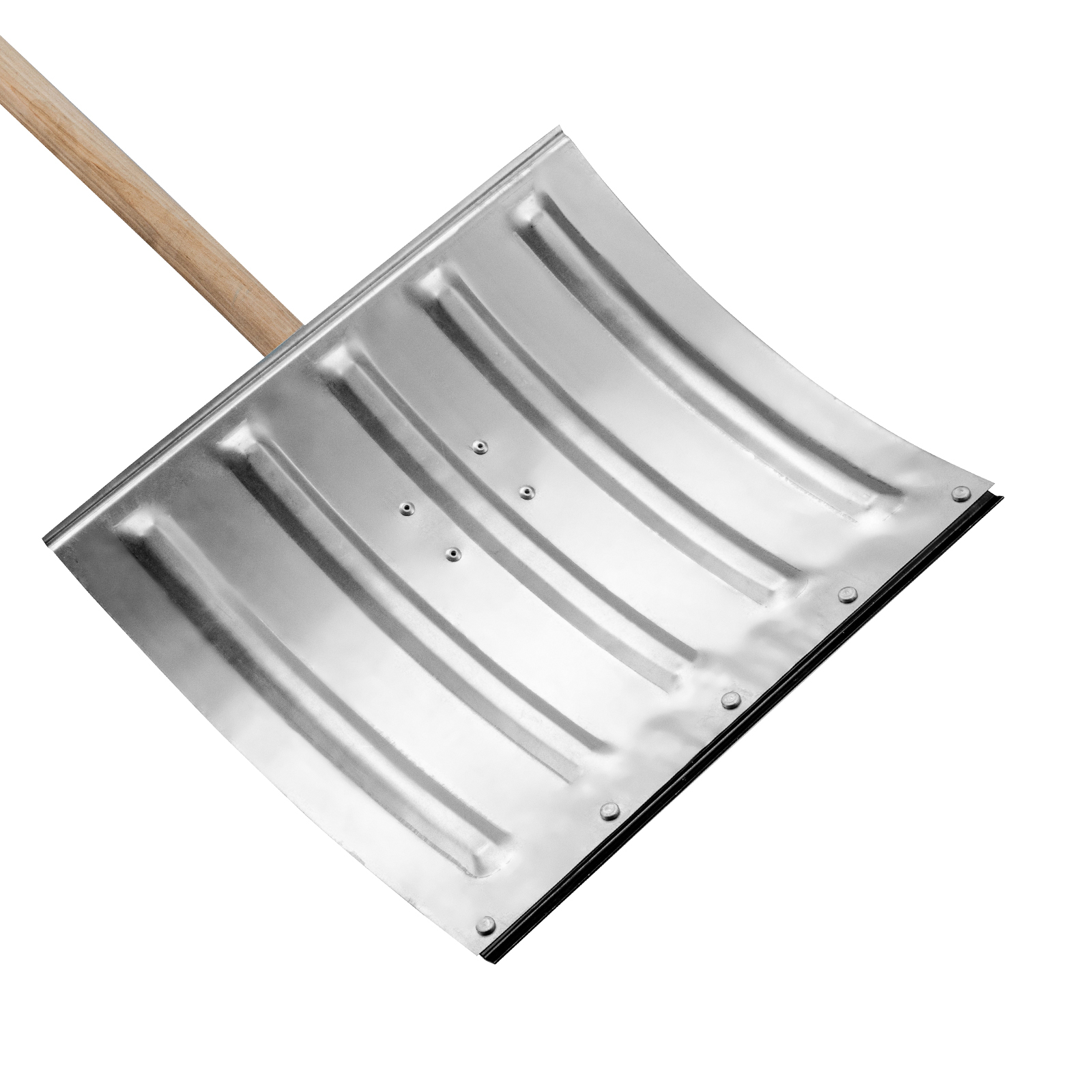 - Комфортная эксплуатация — деревянный черенок не доставляет дискомфорта рукам при выполнении работ на морозе, а легкий вес лопаты 1,43 кг позволяет работать без усталости.