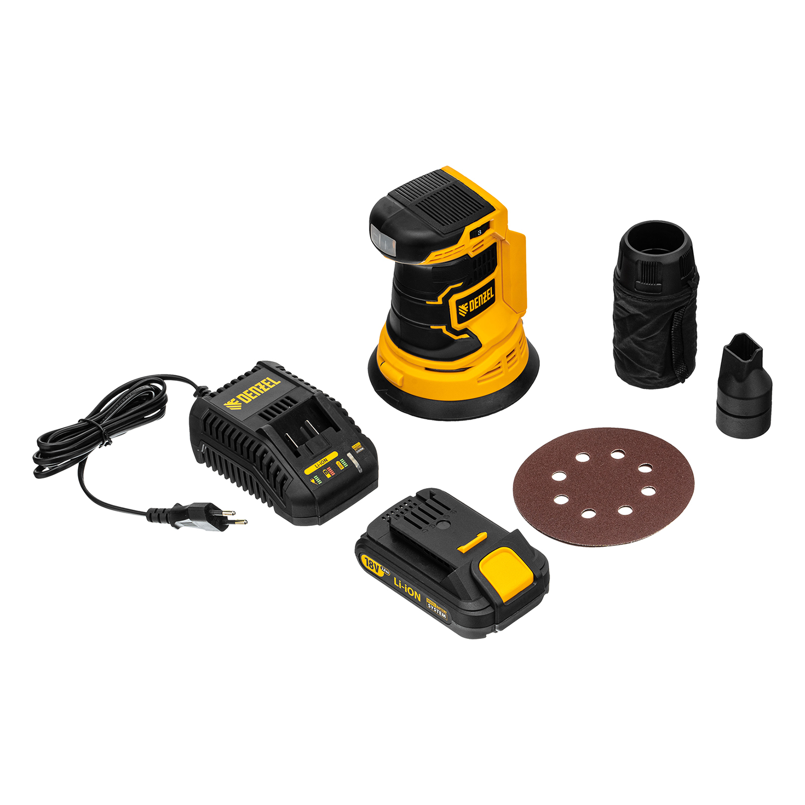 Машина шлифовальная эксцентриковая - 1 штАдаптер для пылесоса - 1 штМешок для сбора пыли - 1 штАдаптер пылесоса - 1 штШлифовальный лист - 2 штБатарея аккумуляторная - 1 штЗарядное устройство - 1 штРуководство по эксплуатации с гарантийным талоном - 1 шт