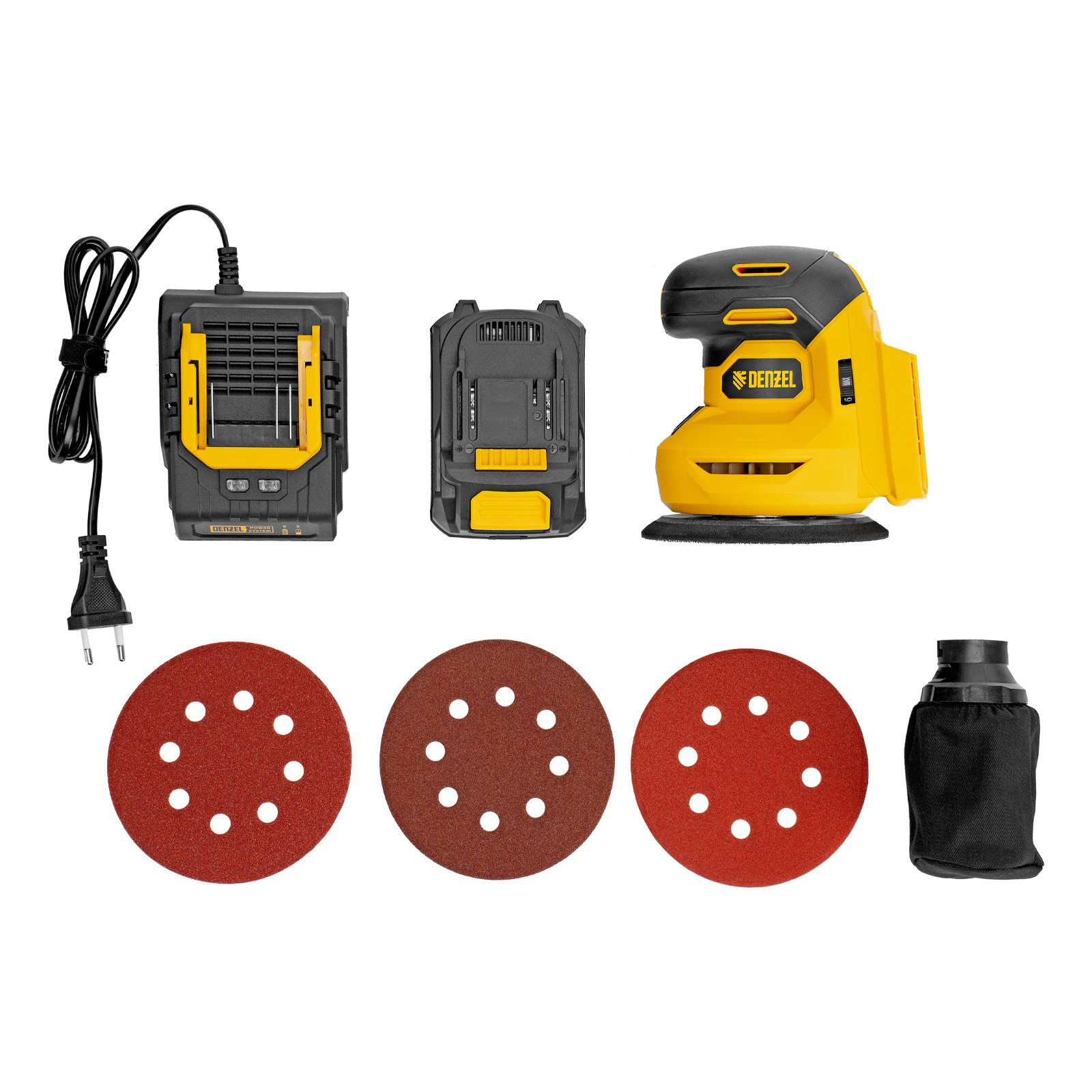 Машина шлифовальная эксцентриковая - 1 штБатарея аккумуляторная - 1 штЗарядное устройство - 1 штПылесборный мешок - 1 штНабор бумаги шлифовальной (P80, P100, P120) - 1 штРуководство по эксплуатации с гарантийным талоном - 1 шт