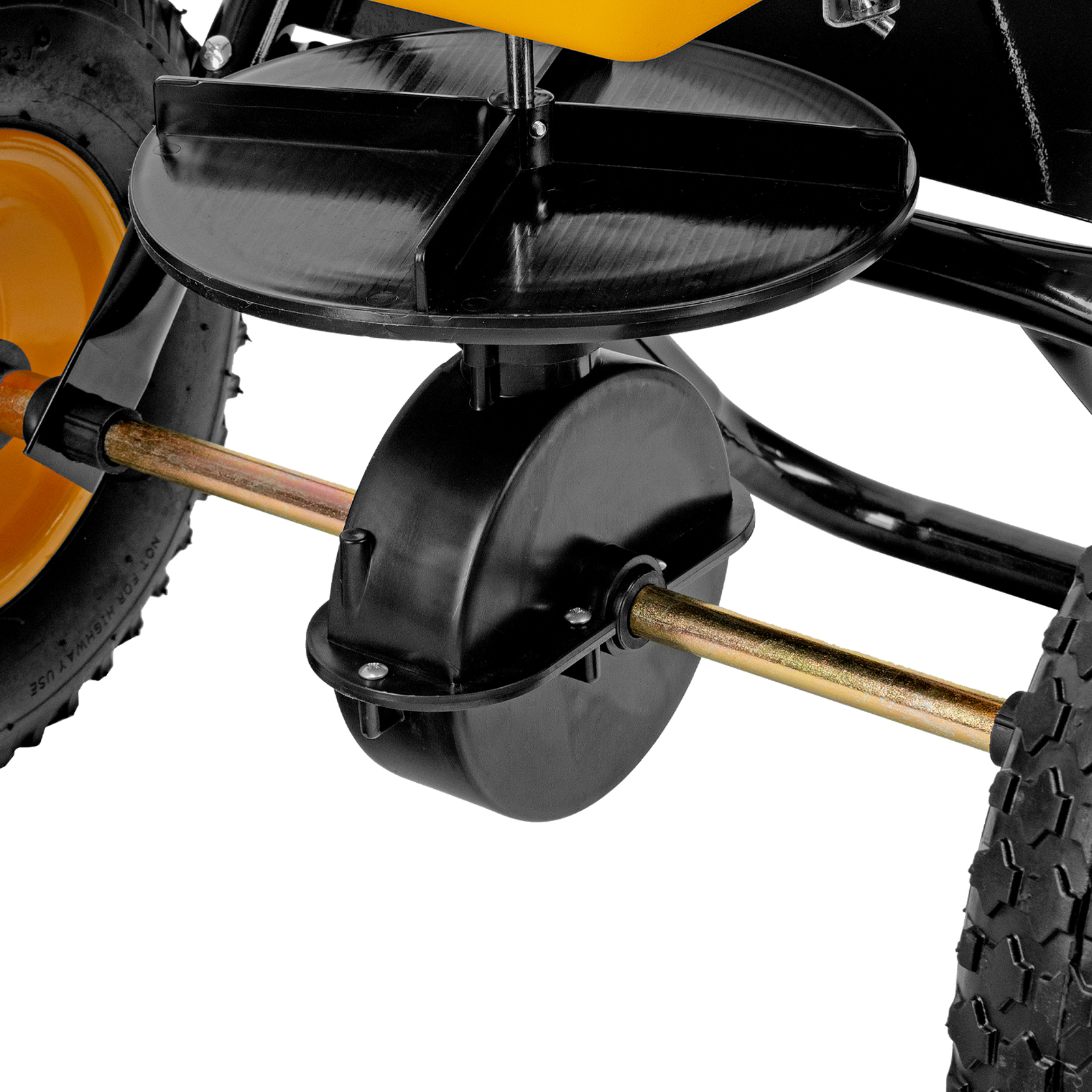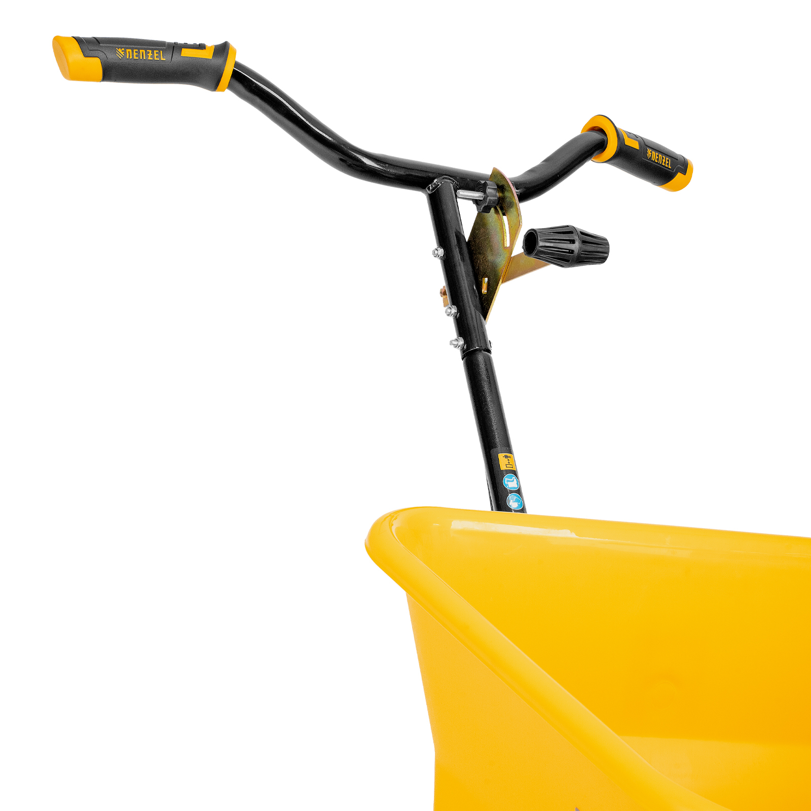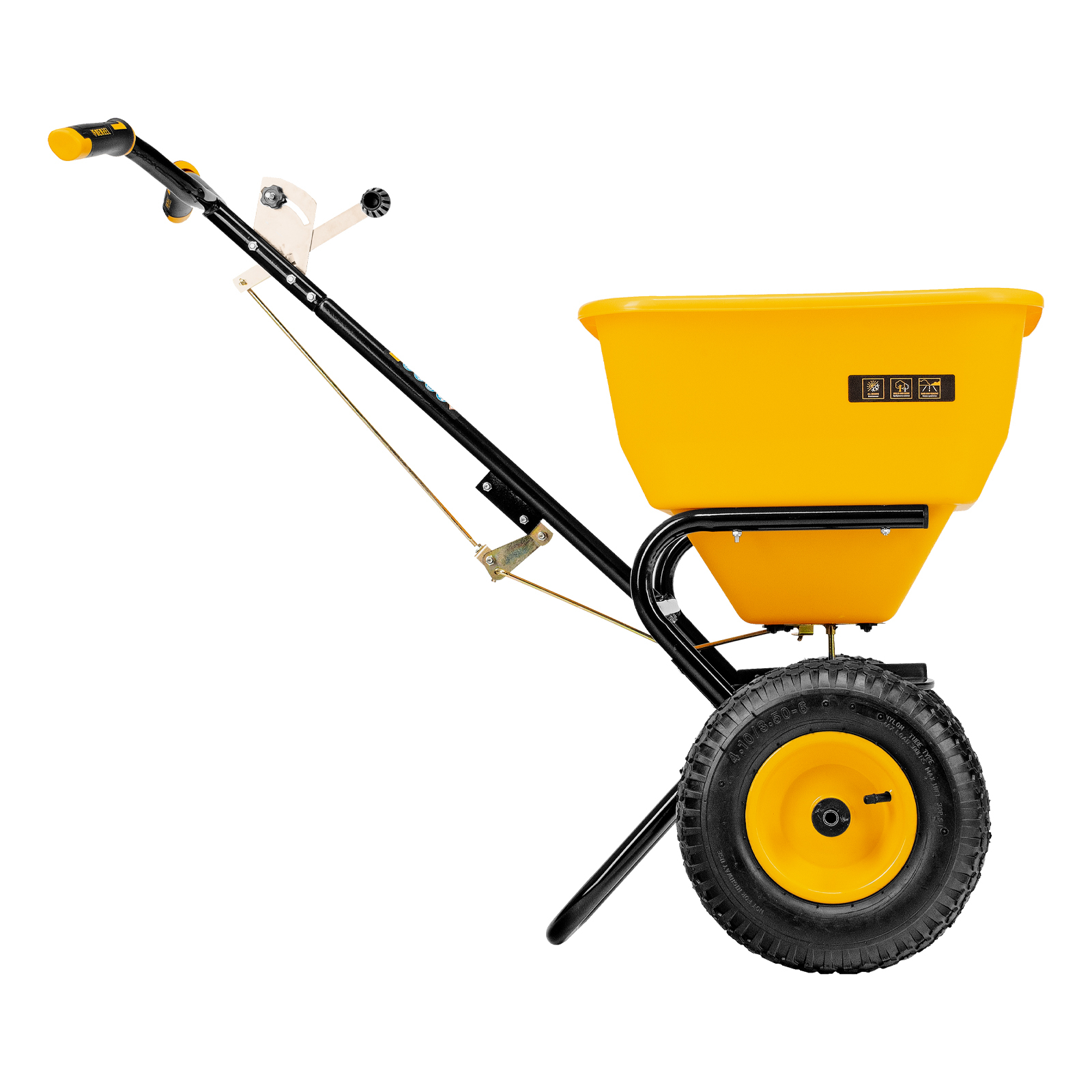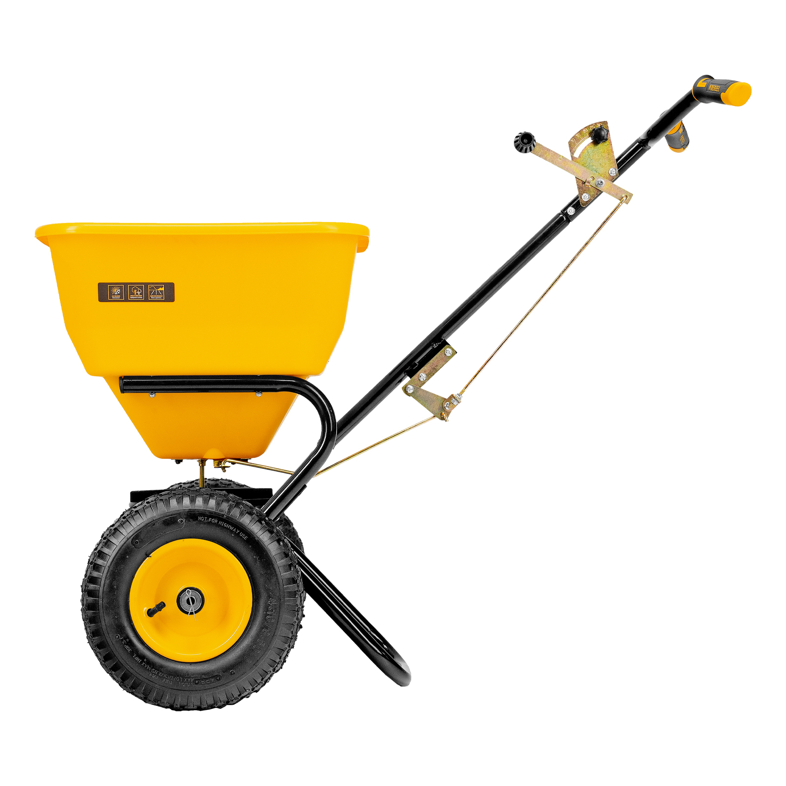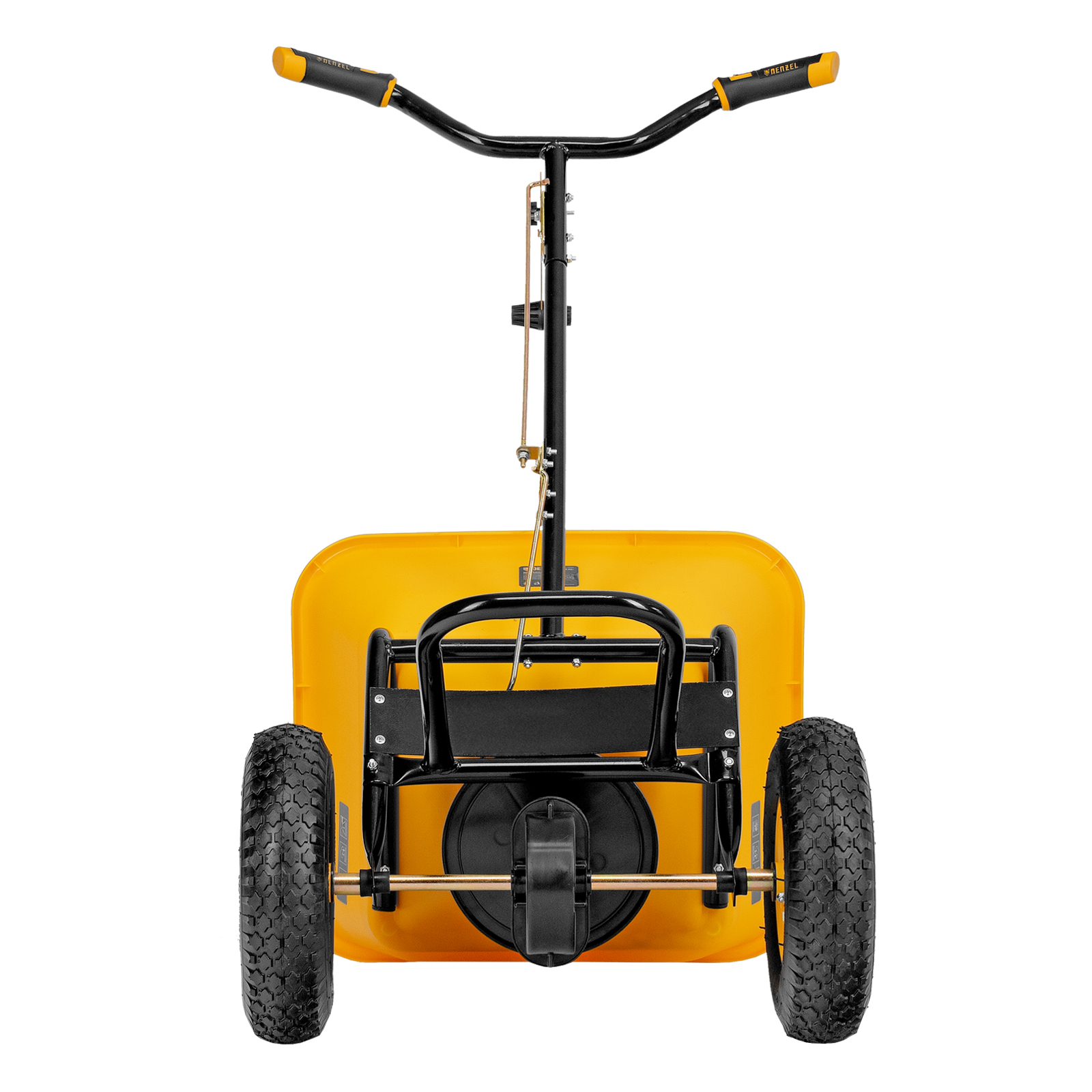 - Комфортная работа — разбрасывание материалов начинается одновременно с вращением колес, эргономичный руль с двухкомпонентными рукоятками обеспечивает удобный хват.