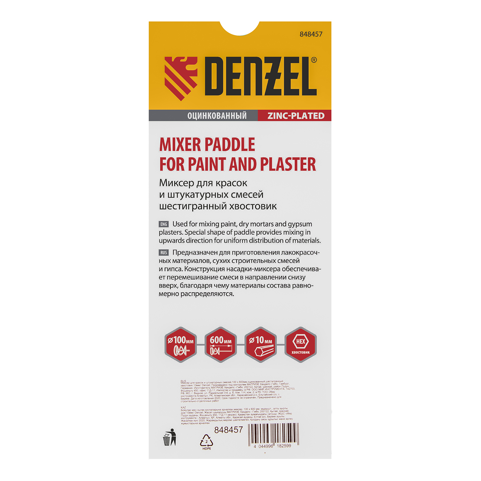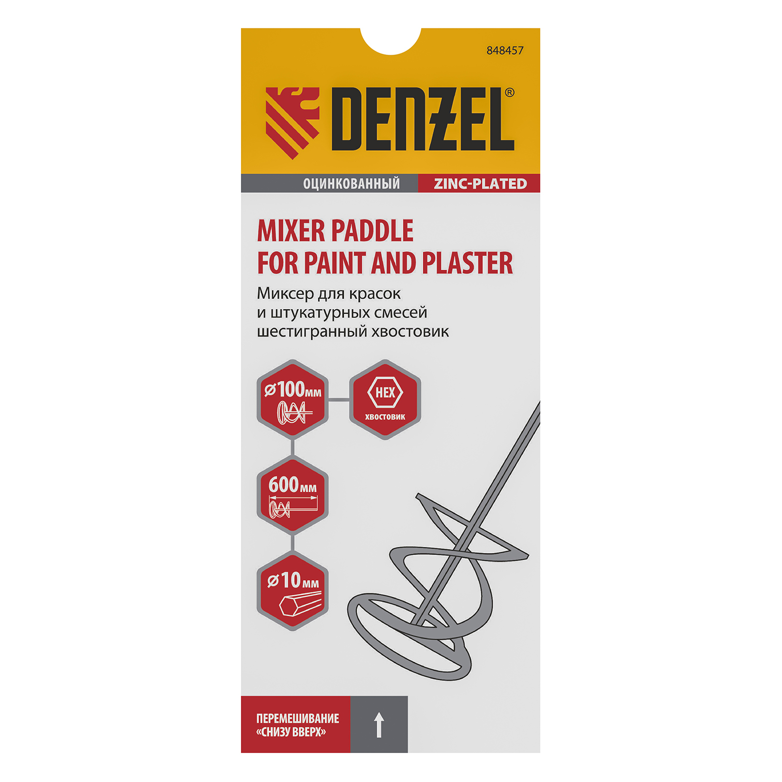 <p>Оцинкованный миксер для красок и штукатурных смесей Denzel 848457 длиной 600 мм, с шестигранным хвостовиком 10 мм, имеет венчик диаметром 100 мм и используется для приготовления строительных растворов. Насадка перемешивает состав снизу вверх, что позволяет добиться полной однородности готовой смеси. Защитное кольцо предотвращает повреждение емкости, в которой готовится раствор. Миксер пригодится во время строительства и ремонта.</p><h2>Преимущества</h2><ul><li>Деформационная стойкость — прочная сварная конструкция выдерживает активное использование.</li><li>Долговечность — оцинкованная поверхность миксера устойчива к механическим повреждениям и образованию коррозии.</li><li>Надежная фиксация в зажимном патроне — насадка подходит для установки на дрели и миксеры средней и высокой мощности.</li></ul>