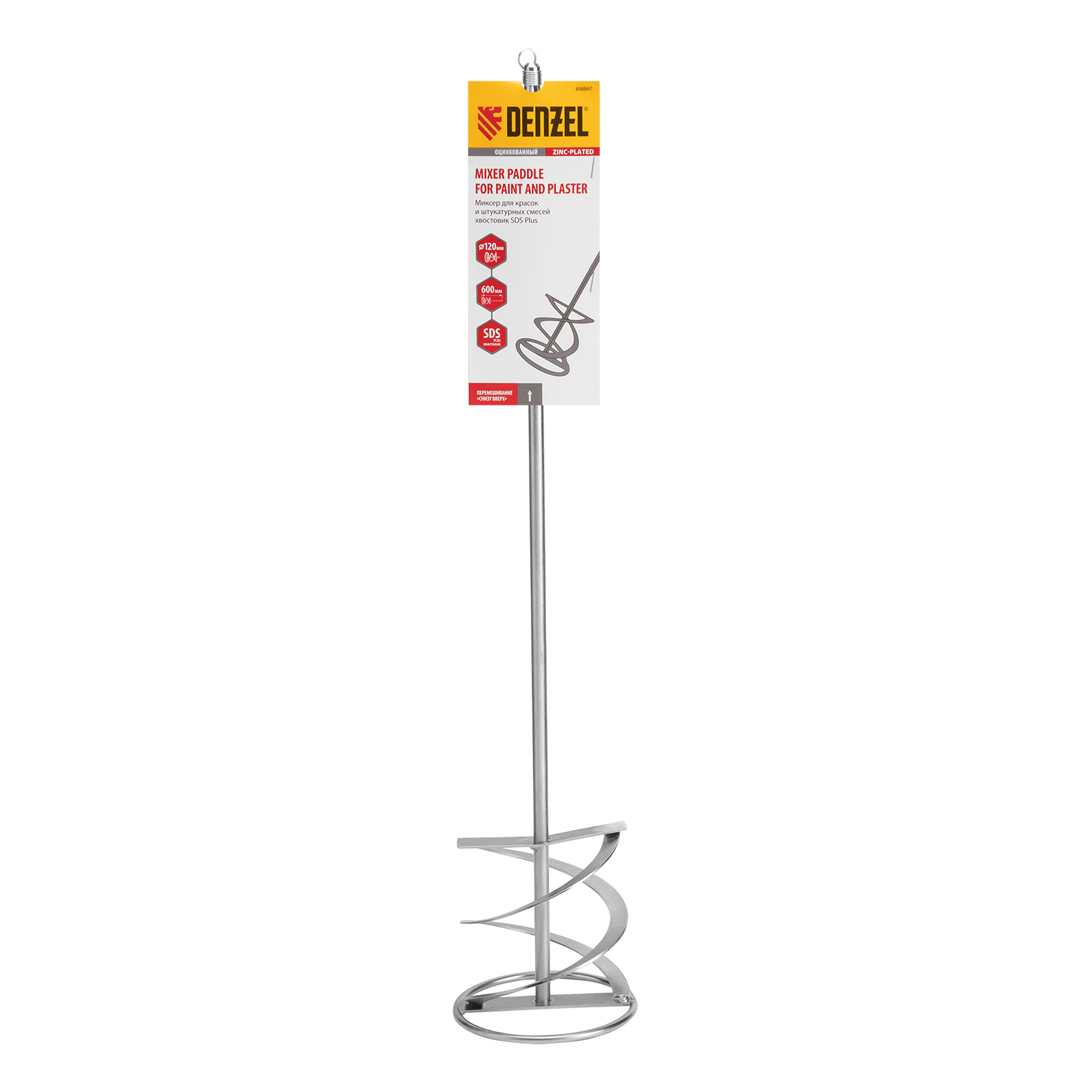 <p>Оцинкованный миксер для красок и штукатурных смесей Denzel 848847 размером 120 х 600 мм, с хвостовиком SDS Plus, используется для замешивания строительных растворов. Спиралевидная рабочая часть перемешивает состав снизу вверх, поэтому все компоненты распределяются в нем равномерно. Защитное кольцо предотвращает повреждение емкости для размешивания состава. Штукатурный миксер устанавливается в патрон перфоратора SDS Plus и применяется во время проведения строительных и отделочных работ.</p><h2>Преимущества</h2><ul><li>Прочность — сварная конструкция стального миксера устойчива к динамическим нагрузкам и выдерживает интенсивное применение.</li><li>Защита от коррозии и механических повреждений — насадка-миксер оцинкована.</li><li>Простая установка — хвостовик быстро и надежно фиксируется в патроне перфоратора.</li></ul>