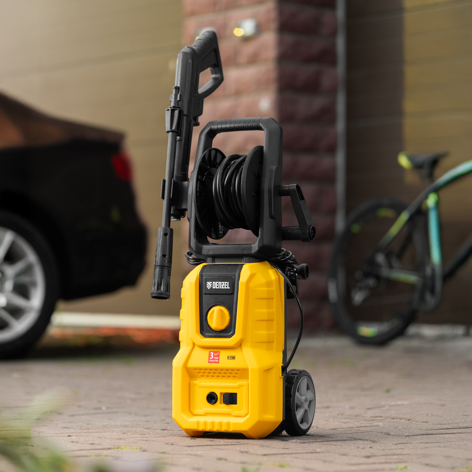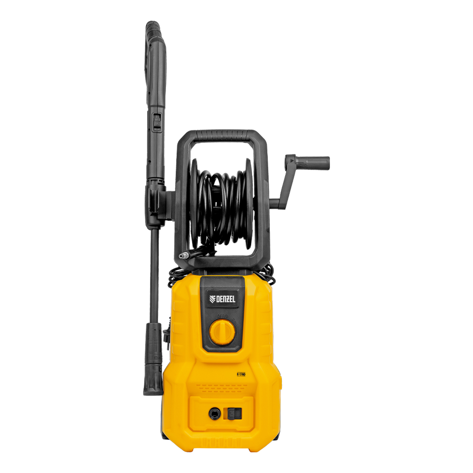 - Комфортная эксплуатация — барабан для шланга высокого давления упрощает работу, длина кабеля и шланга высокого давления составляет 5 м, что позволяет свободно передвигаться по участку.