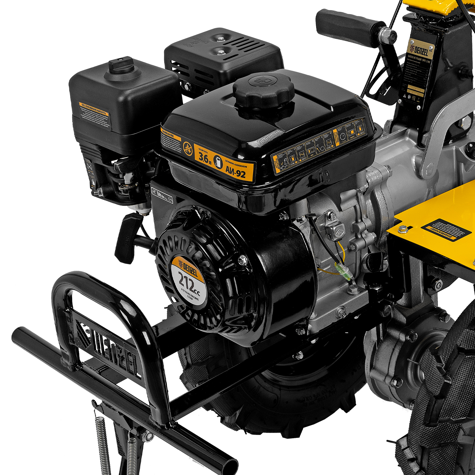 Мотоблок Denzel 56406 DPT-370X мощностью 7 л.с., с дисковым сцеплением, фрезами 3 х 4, валом отбора мощности (ВОМ), передачами 3В/1Н, имеет ширину вспахивания 90 см и глубину обработки 35 см. Предназначен для обработки почвы: рыхления, боронования, выравнивания, прополки и выполнения других задач на приусадебных и садовых участках, уверенно справляется с плотной глинистой почвой.,Мощный и экономичный одноцилиндровый четырехтактный двигатель Denzel серии Long Life с рабочим объемом 212 см3 отличается надежностью и продолжительным ресурсом. Многодисковый механизм сцепления обеспечивает передачу высокого крутящего момента на колеса. Мотоблок предназначен для работы на большой территории и широко используется в быту.