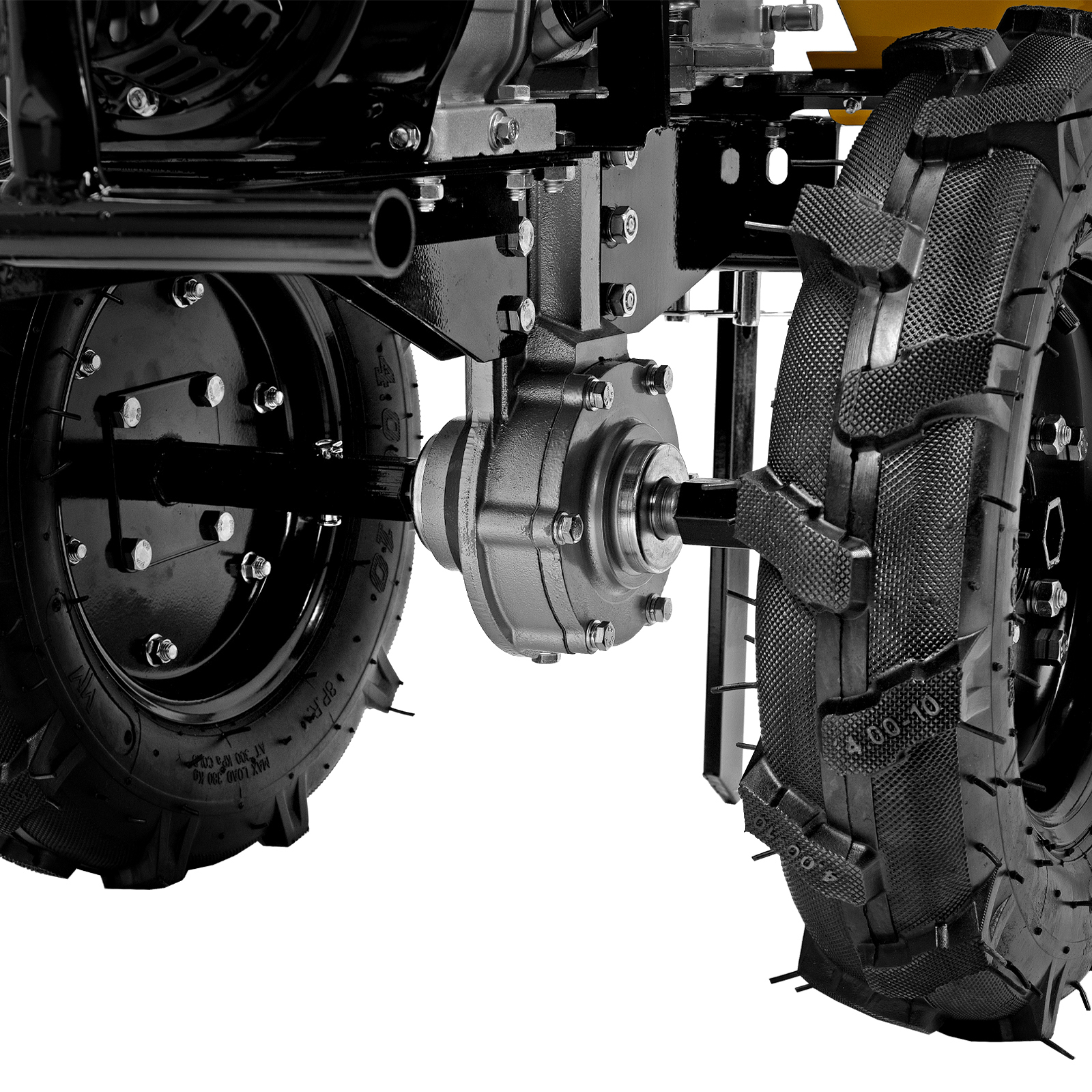 - Комфортная транспортировка — усиленная рукоятка-бампер и большие колеса с глубоким протектором позволяют с легкостью перемещать мотоблок до нужного места.